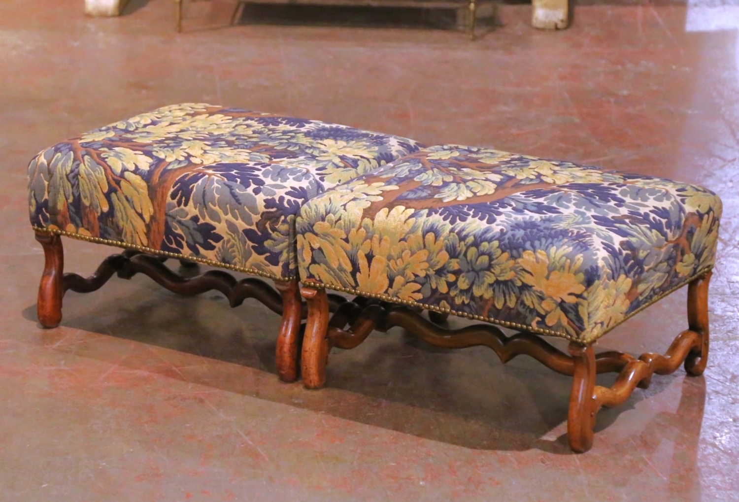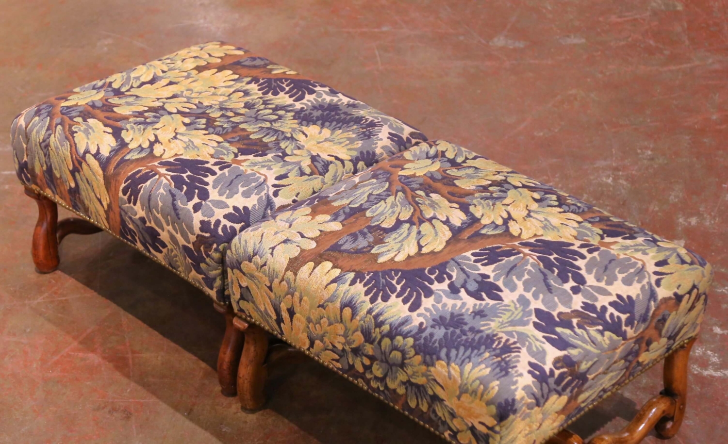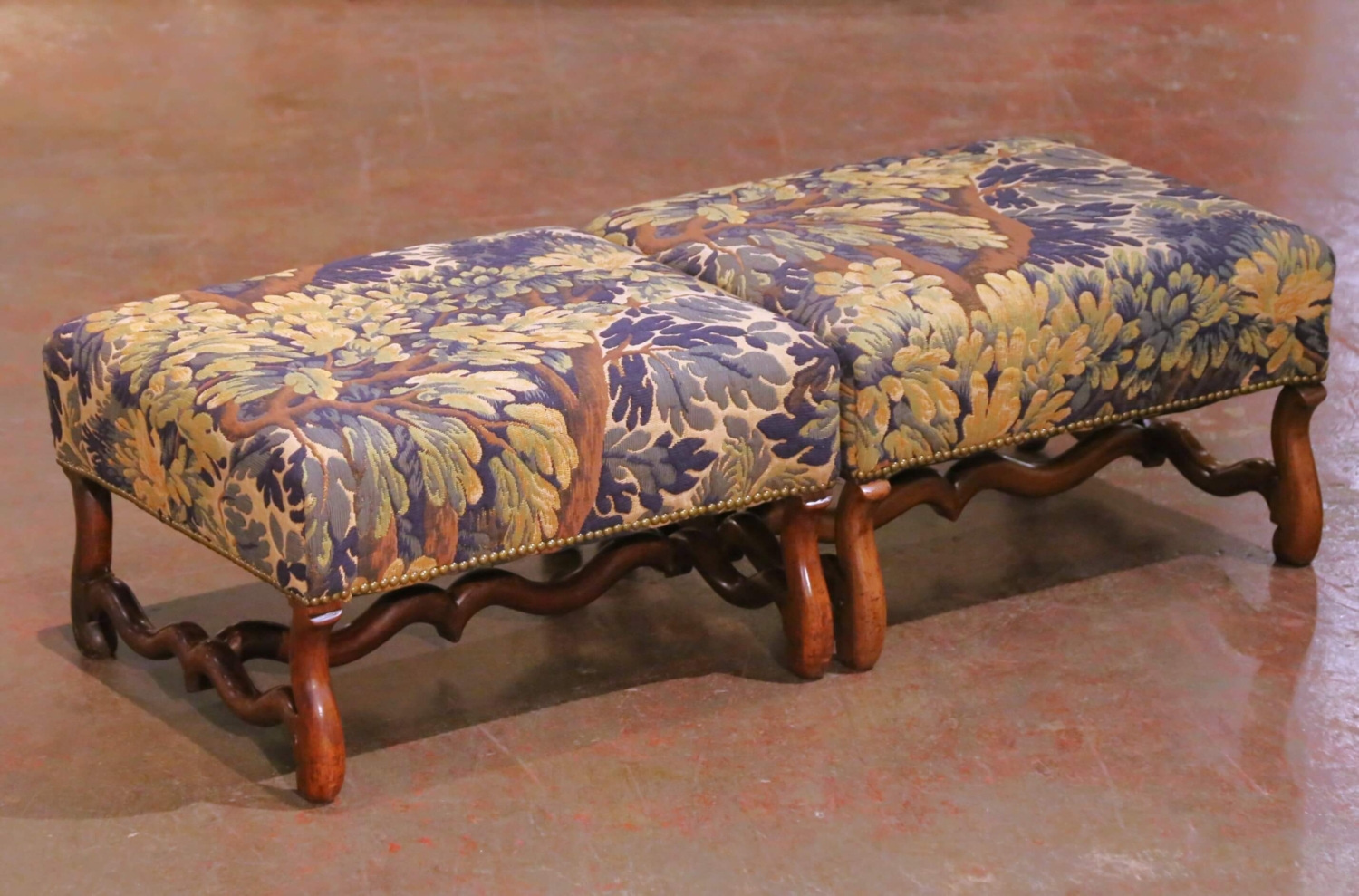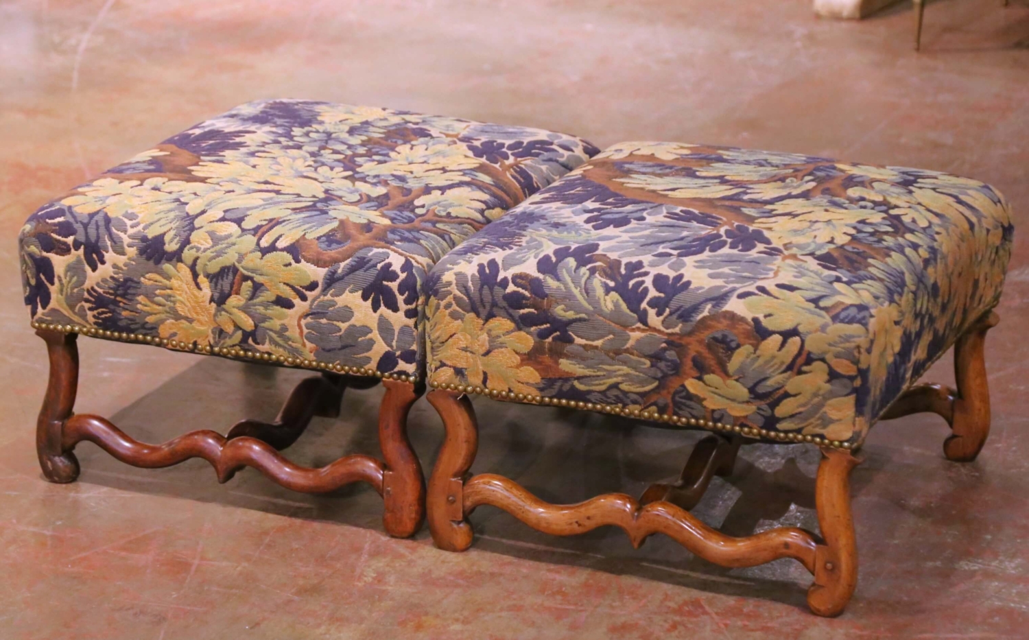 A handsome pair of antique French stools crafted in solid walnut circa 1880, reflecting the robust and sculptural character of the Louis XIII style. Each stool rests on turned legs joined by an undulating H-form stretcher, a hallmark of the period that adds both structural integrity and visual movement. The wood presents a warm and rich walnut patina, beautifully highlighting the natural grain and age. The seats are upholstered in a tapestry fabric featuring a dense foliate and tree motif in deep blues, ochres, and muted greens, lending a classic, decorative presence. Finished with brass nailhead trim, the upholstery complements the strong architectural lines of the bases while adding texture and color. The proportions are generous and comfortable, making them ideal as footstools, low seating, or as accents in front of a pair of chairs or a sofa. This pair of antique stools is in excellent condition commensurate with age and use, with minor wear to the wood and upholstery consistent with their age. Dimensions: 25.5″W x 22″D x 15″H
