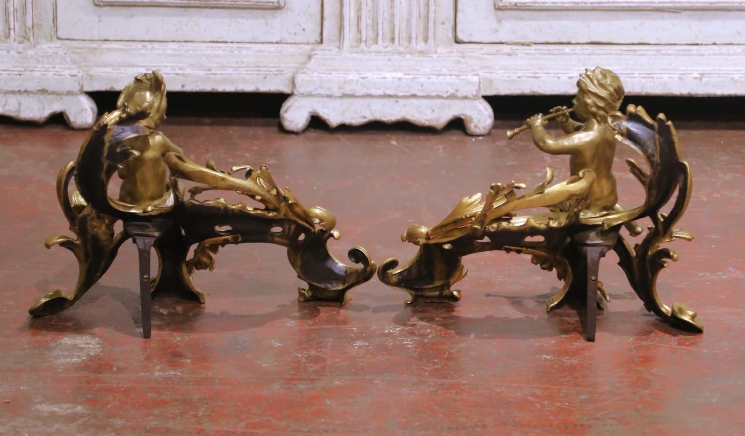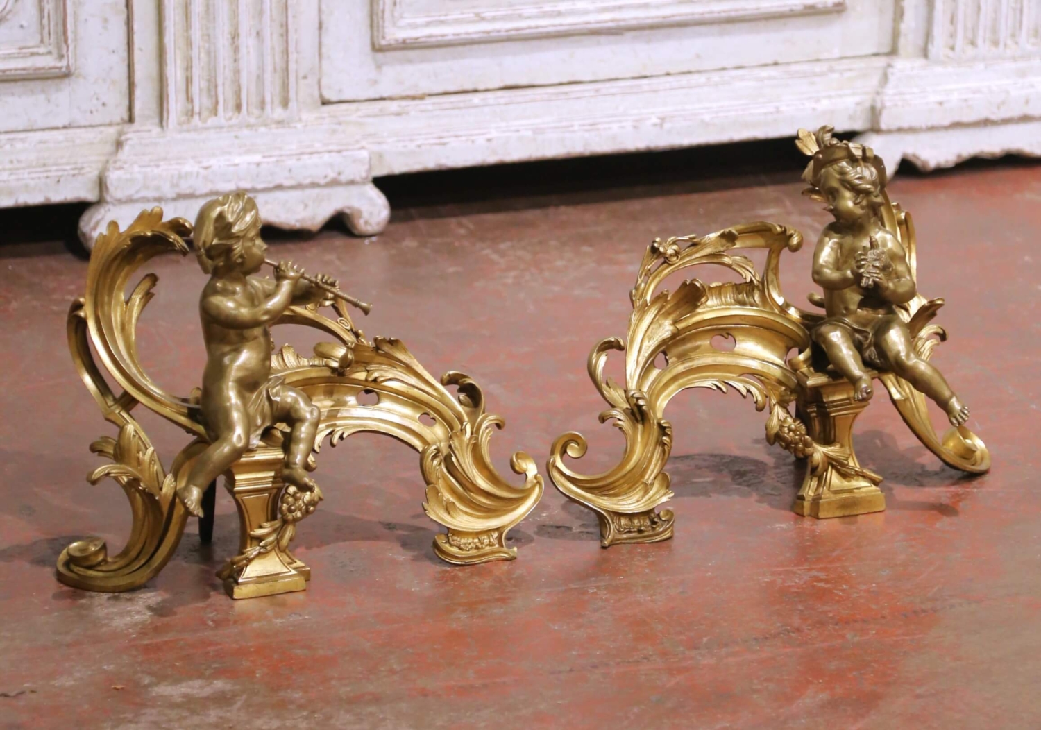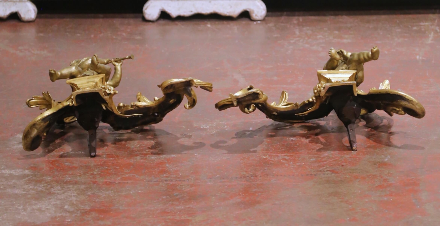 Crafted in France circa 1870, this elegant pair of antique bronze chenets embodies the playful refinement of the Louis XV style. Each fireside ornament features a beautifully modeled putto seated upon an elaborate rocaille framework, one playing a flute and the other holding a small wind instrument. The figures are rendered with remarkable softness and naturalism, their expressive faces and relaxed poses lending movement and charm to the composition. The scrolling bases are richly cast with acanthus leaves, pierced cartouche details, and flowing C-scrolls, all characteristic of the asymmetrical grace associated with the Louis XV aesthetic. The warm, time-softened gilt bronze surface highlights the depth of casting and retains a rich patina consistent with age and use. Substantial in presence yet finely detailed, these antique chenets are fitted with traditional iron supports at the rear, designed to anchor logs securely within the hearth. Even when not in use, they serve as striking decorative sculptures, ideal for a fireplace mantel or as statement accents in a refined interior. Dimensions: 16”W x 8”D x 12.5”H