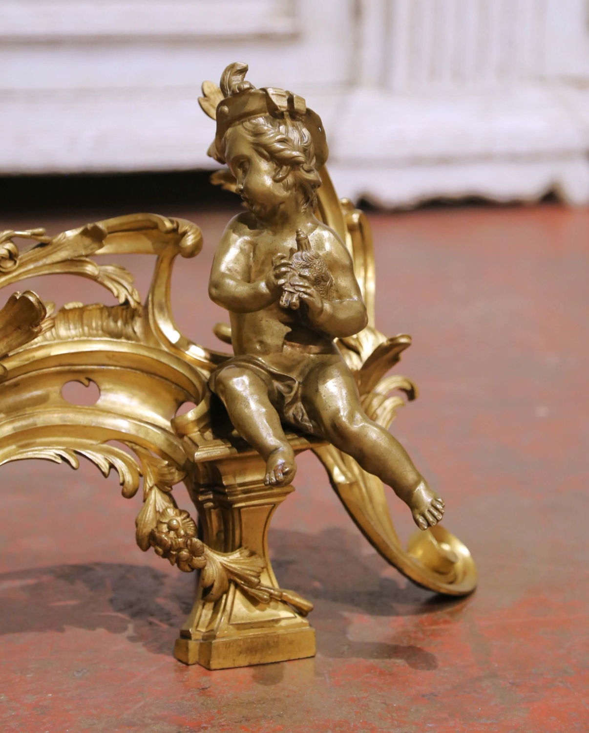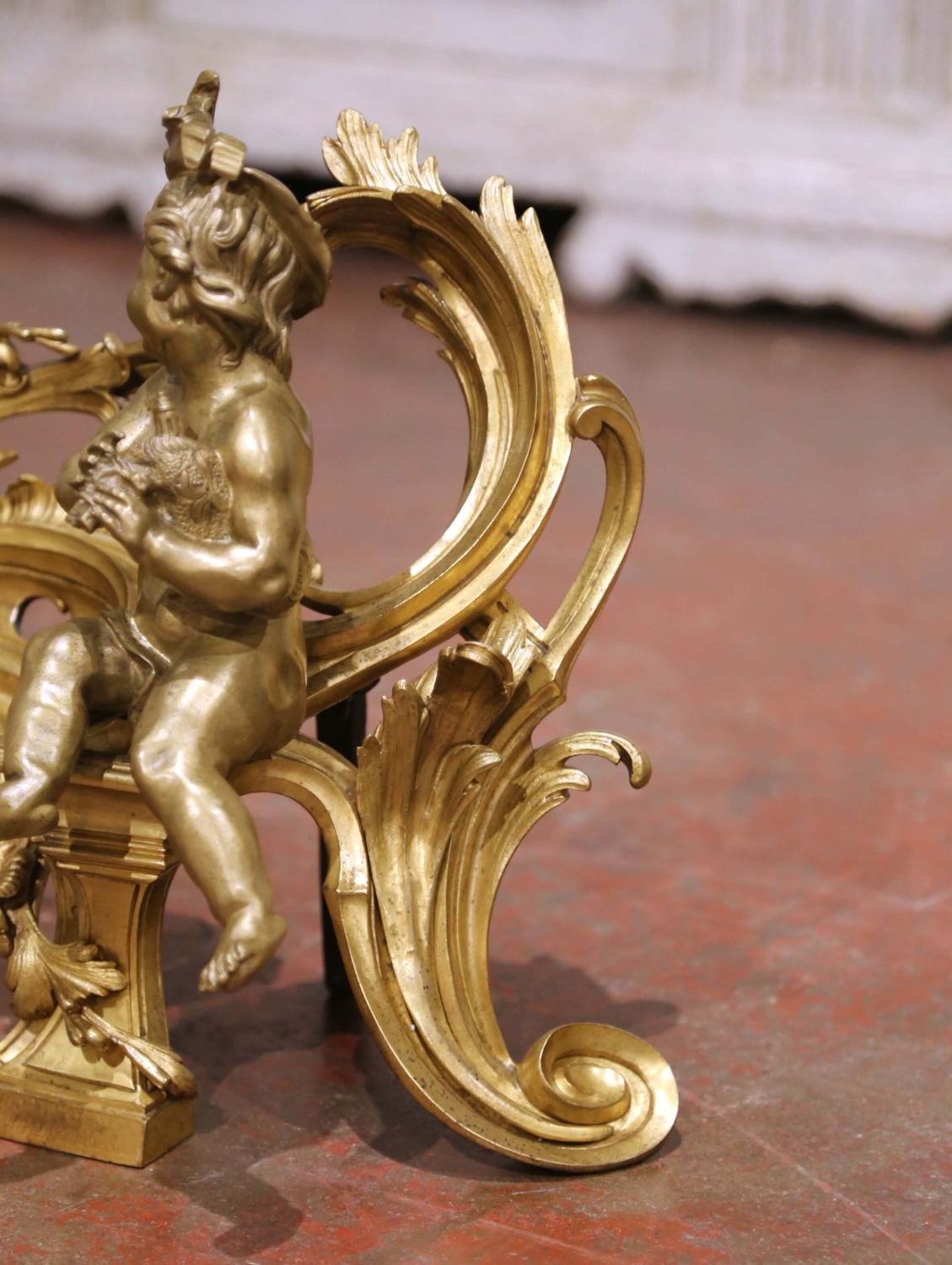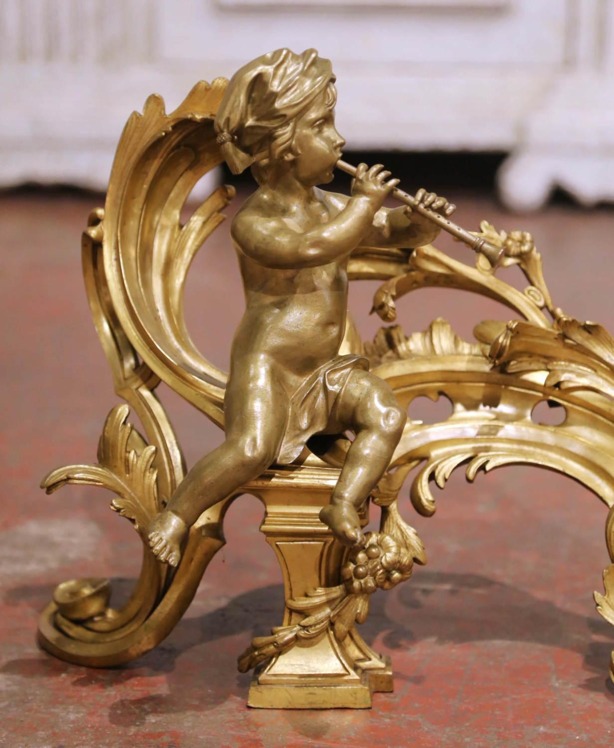 Crafted in France circa 1870, this elegant pair of antique bronze chenets embodies the playful refinement of the Louis XV style. Each fireside ornament features a beautifully modeled putto seated upon an elaborate rocaille framework, one playing a flute and the other holding a small wind instrument. The figures are rendered with remarkable softness and naturalism, their expressive faces and relaxed poses lending movement and charm to the composition. The scrolling bases are richly cast with acanthus leaves, pierced cartouche details, and flowing C-scrolls, all characteristic of the asymmetrical grace associated with the Louis XV aesthetic. The warm, time-softened gilt bronze surface highlights the depth of casting and retains a rich patina consistent with age and use. Substantial in presence yet finely detailed, these antique chenets are fitted with traditional iron supports at the rear, designed to anchor logs securely within the hearth. Even when not in use, they serve as striking decorative sculptures, ideal for a fireplace mantel or as statement accents in a refined interior. Dimensions: 16”W x 8”D x 12.5”H