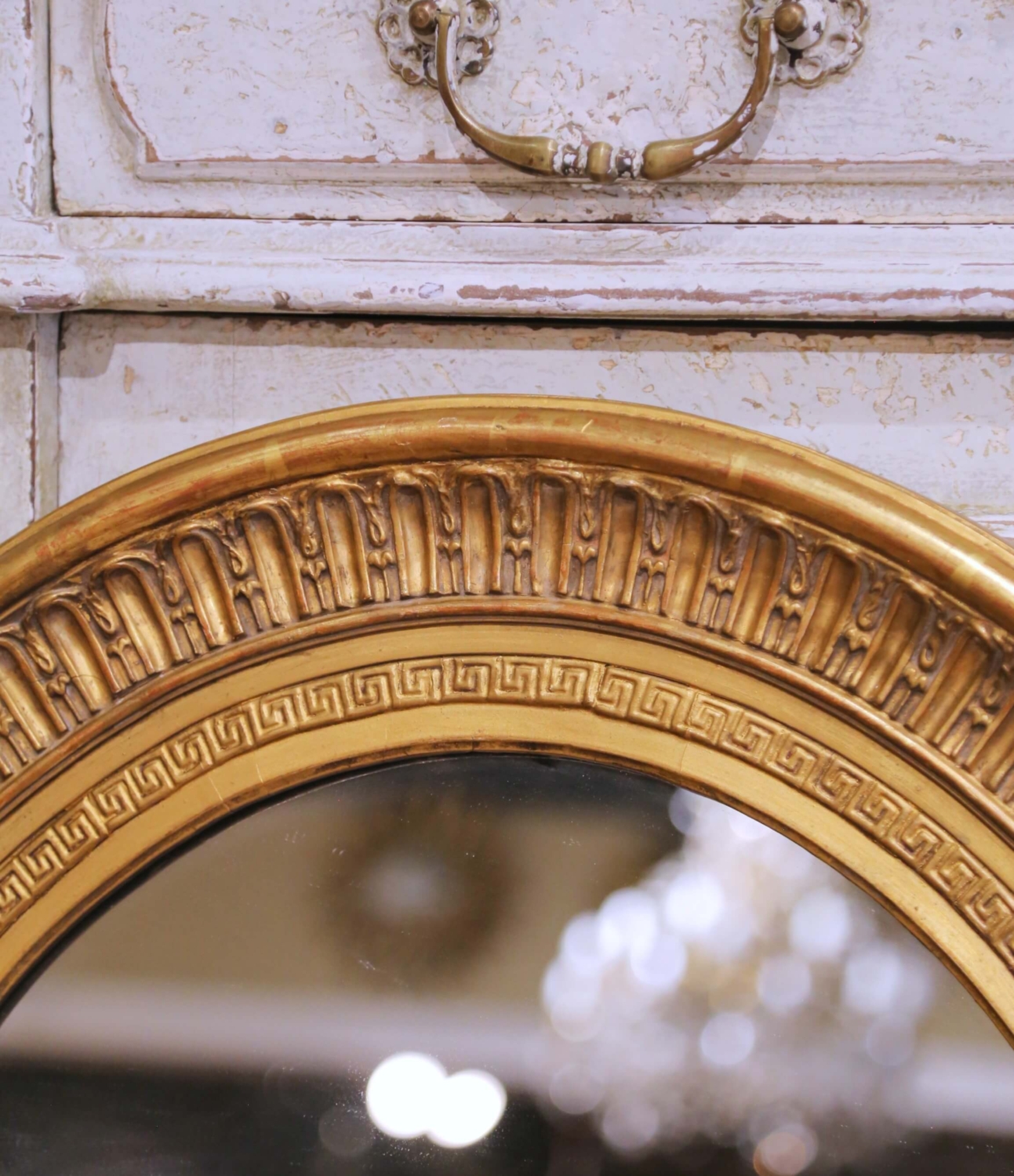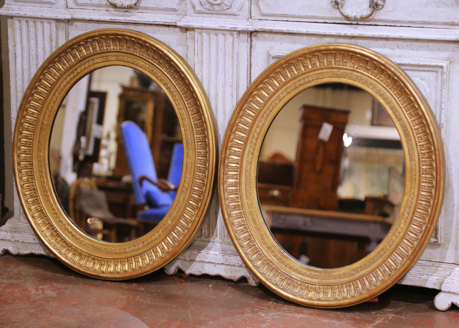 This pair of antique French oval mirrors dates to circa 1860 and is carved from wood with original gilt finishes. The oval frames feature a molded profile with repeating gadrooning and an inner Greek key border, both characteristic elements of the Louis XVI neoclassical style. The gilding retains a warm, aged patina with light wear consistent with age and use. Both mirrors retain their original oval mirror plates with light, age-appropriate spotting typical of 19th century glass. The frames are solid and stable, with original wood backs and later hanging wires for easy installation. Well proportioned and visually balanced, these antique mirrors are especially effective used as a pair. They are ideal for a powder room, mounted over matching consoles or commodes, flanking a doorway or window, or placed above a double vanity. Decorative, functional, and easy to place, they add symmetry, light, and classic French character to both traditional and transitional interiors. The mirrors are in excellent condition commensurate with age and use. Dimensions: 26.5″W x 30.75″H each