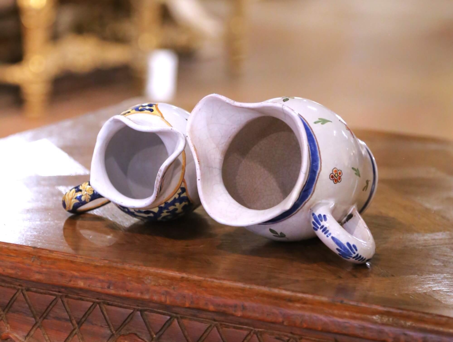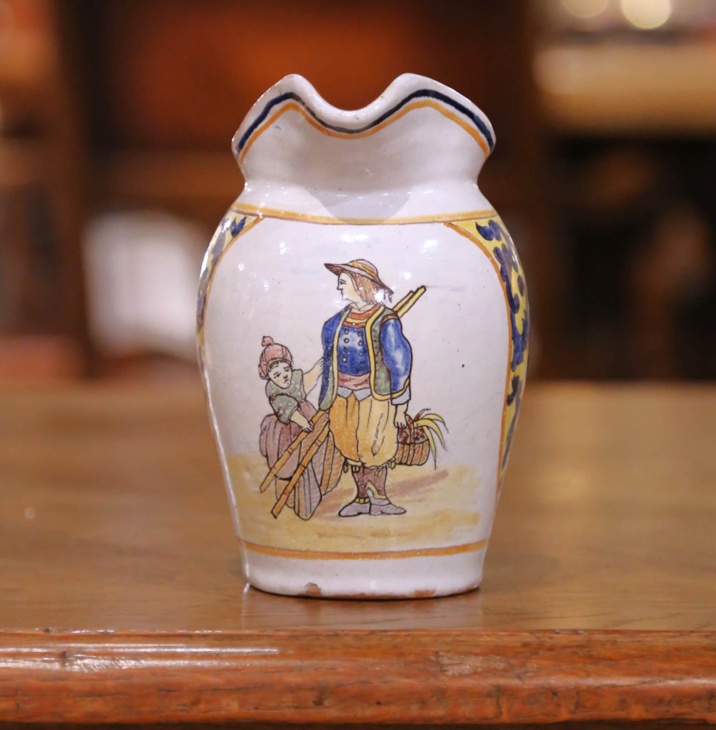 Bring a touch of rustic Breton charm to your collection with this delightful pair of Quimper faience jugs, crafted in Brittany, France, circa 1890. Each pitcher is hand-thrown and hand-painted, showcasing the lively folk traditions that define classic Quimper pottery. One jug features a Breton woman framed by scattered floral motifs and blue striping, while the companion jug displays a Breton man and child set against ornate cobalt-and-yellow scrolling panels. Both pieces present the distinctive scalloped spout and generous rounded body typical of 19th-century regional faience. The surfaces show gentle craquelure and warm glaze variation, enhancing the authenticity and antique character of the pair. These jugs make charming decorative accents for a shelf, table vignette, or French country kitchen display. Excellent condition commensurate with age and use. Dimensions (each approx.): H 7″ × W 5″ × D 7.5″.