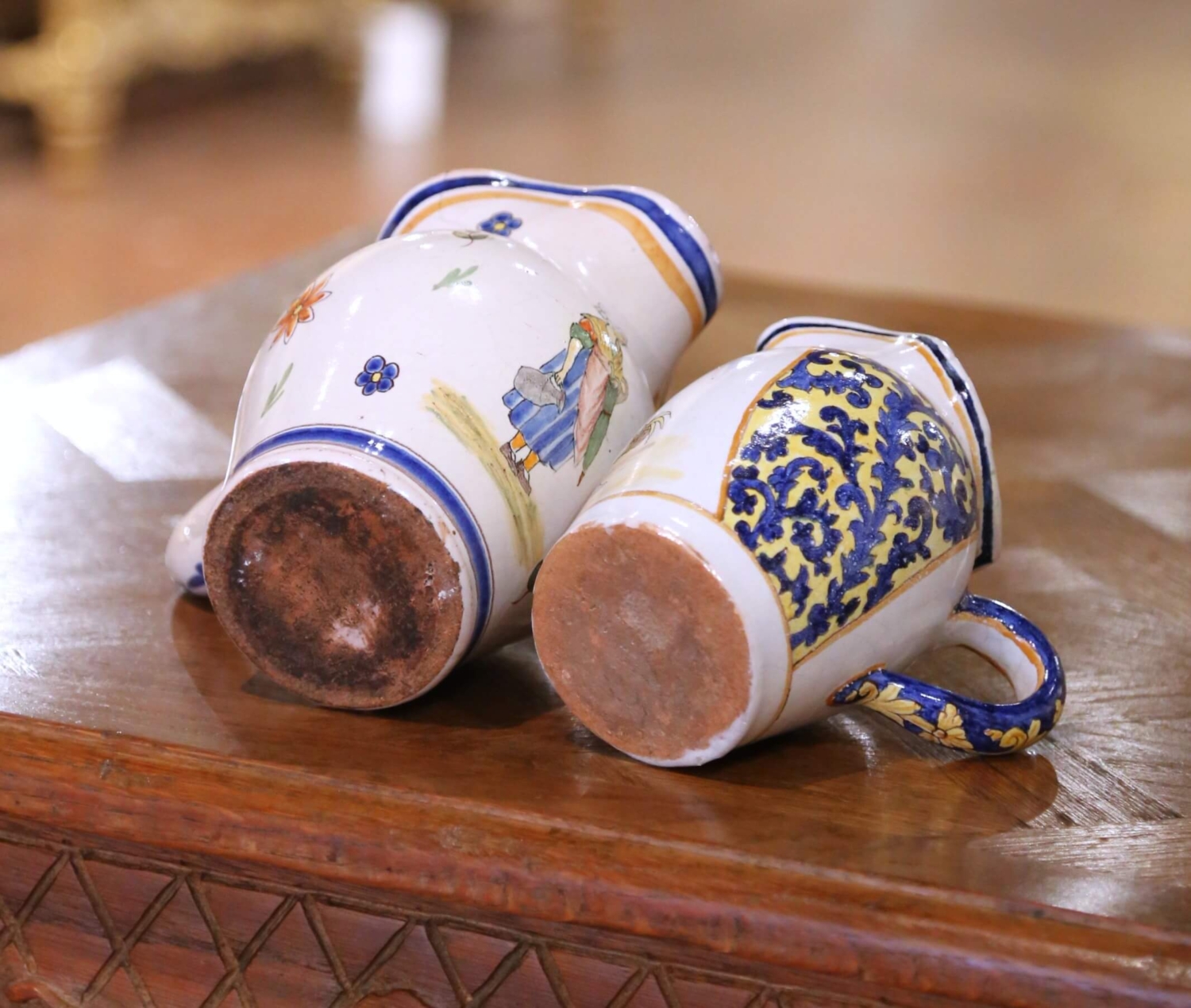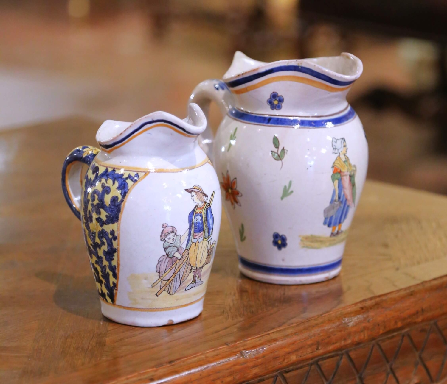 Pair of 19th Century French Quimper Faience Jugs with Breton Figures and Floral