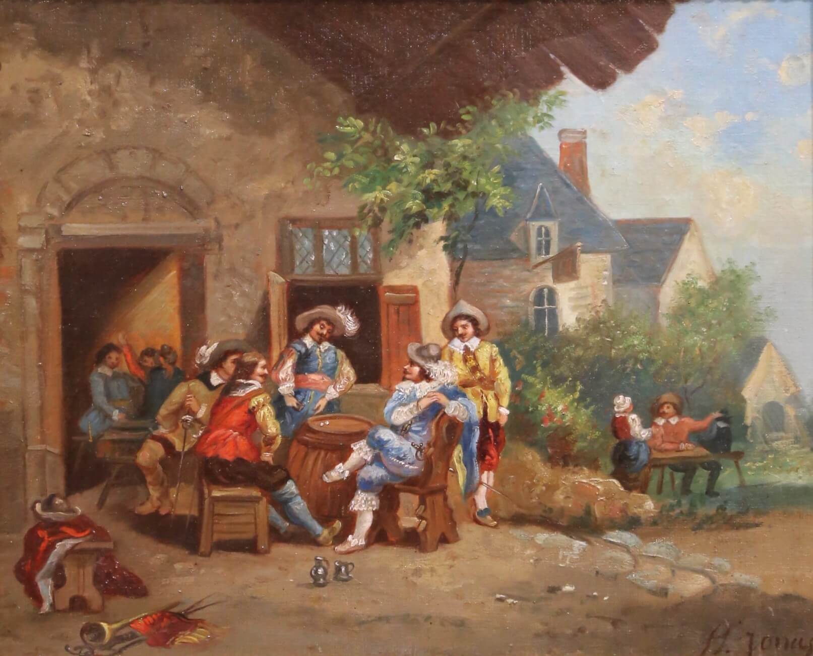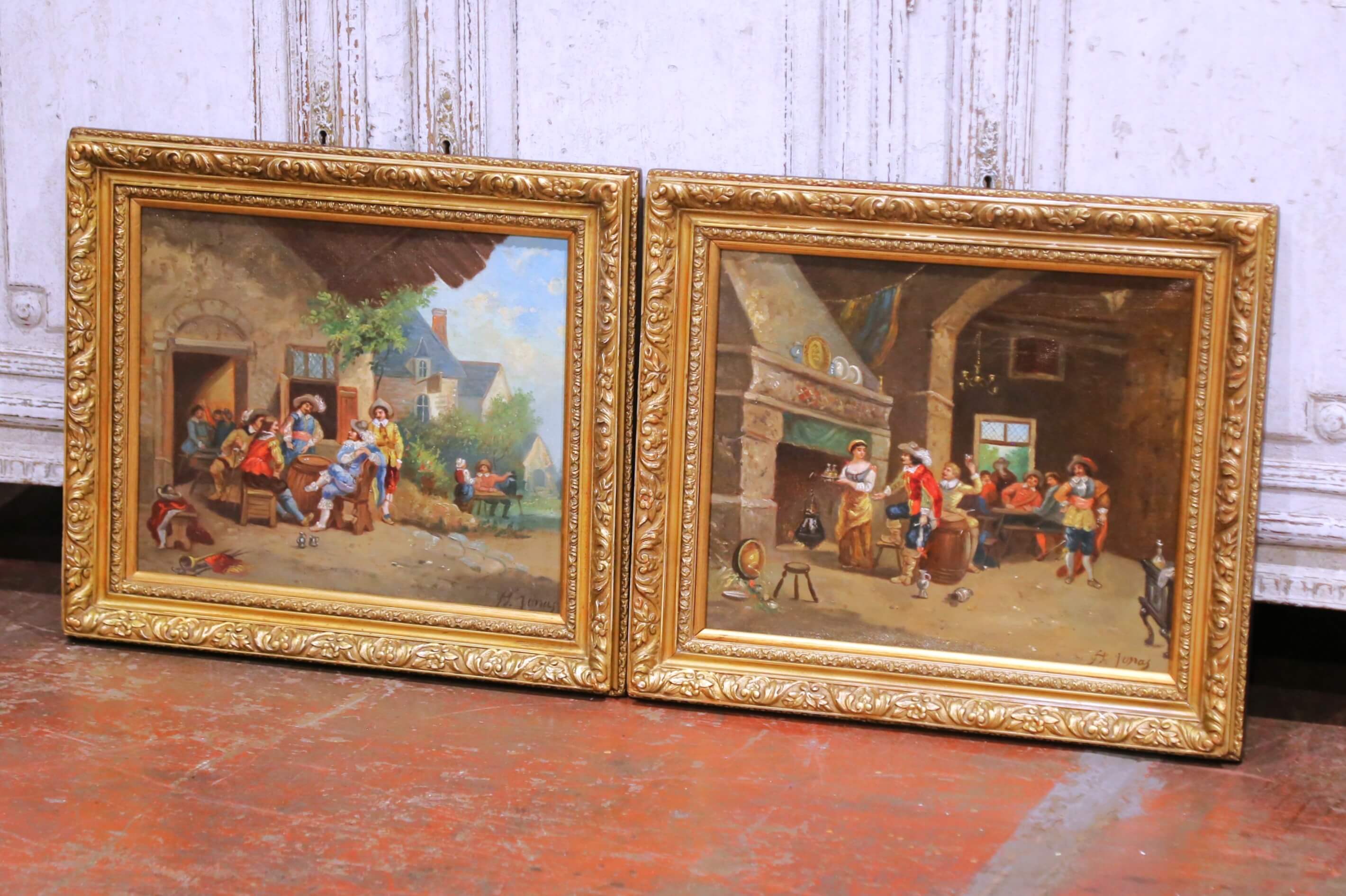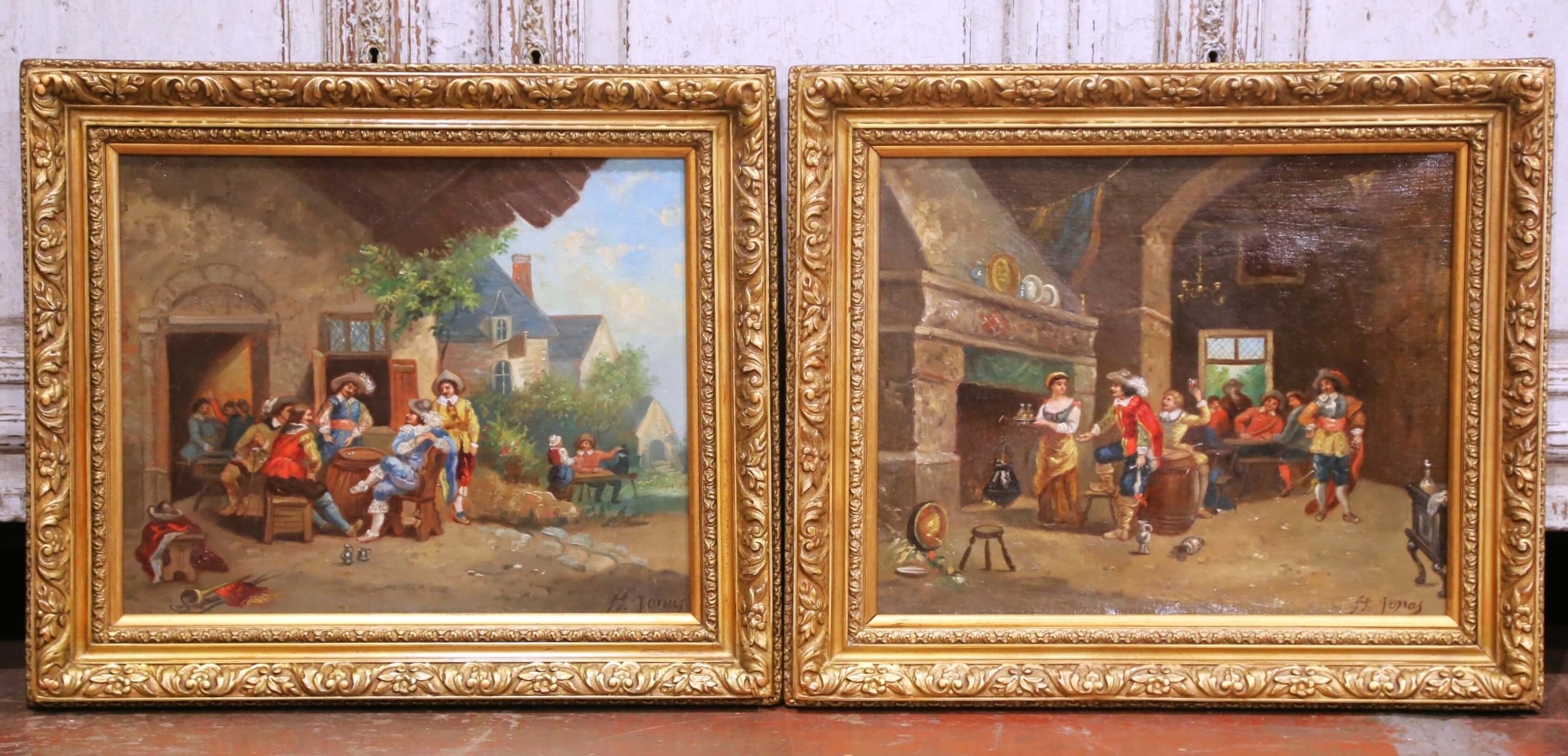 Pair of 19th Century French Tavern Genre Scene Oil Paintings Signed H. Jonas