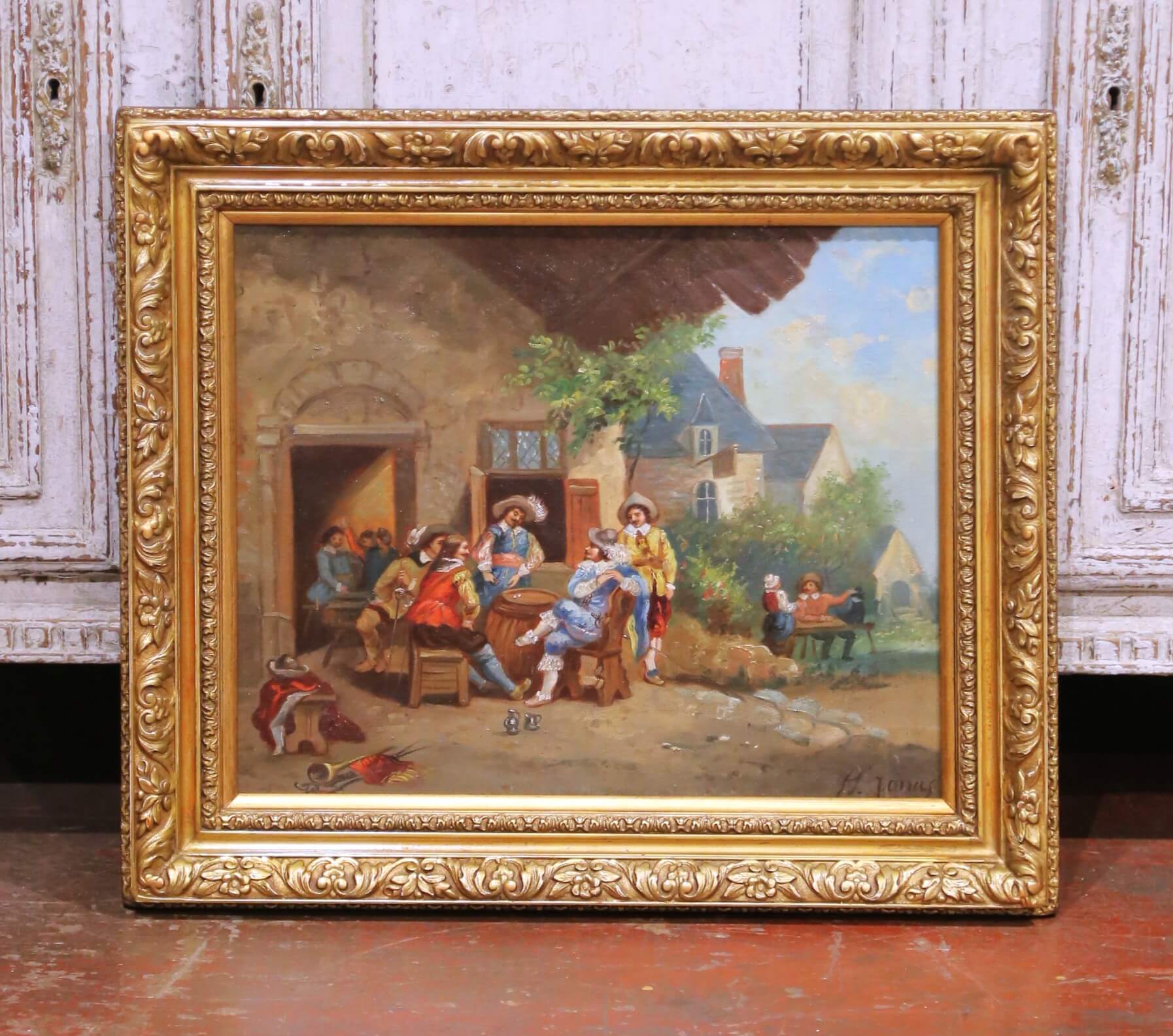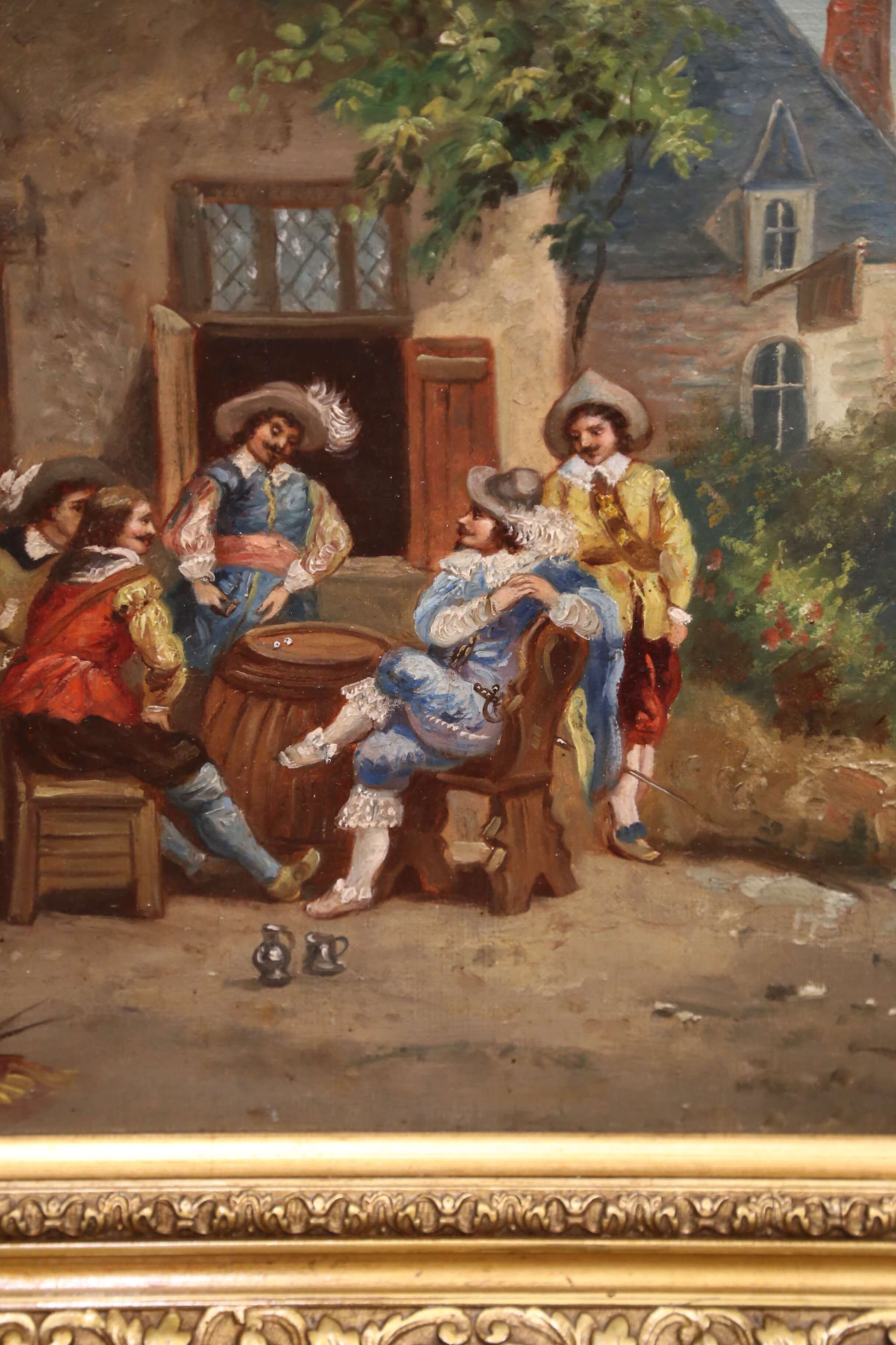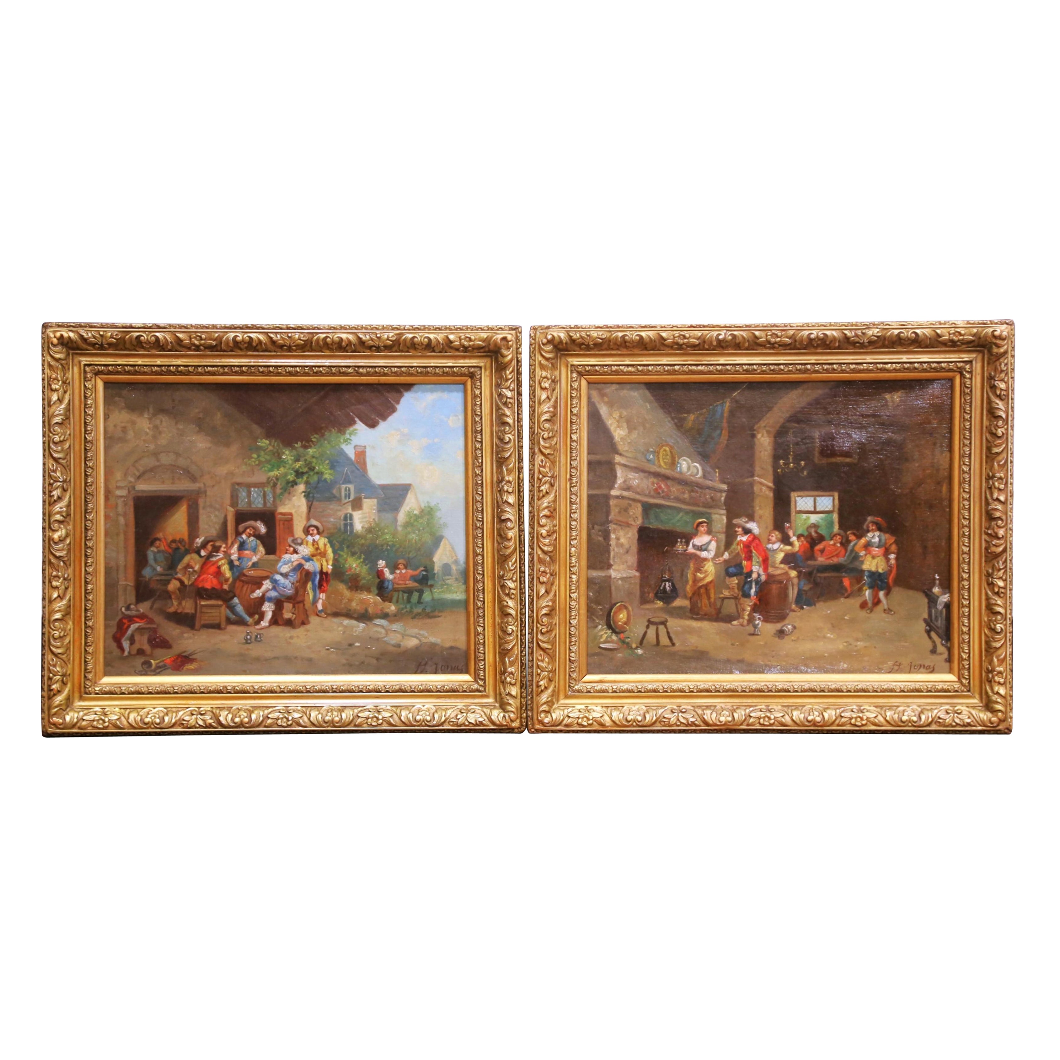 Decorate a wall or study with this charming pair of antique pendants genre paintings. Crafted in France circa 1870, each oil on canvas composition captures lively tavern and village scenes inspired by 17th century Dutch interiors, featuring elegantly dressed figures gathered around tables engaged in conversation, drinking, and leisure. One scene unfolds inside a rustic inn with a grand fireplace and animated figures, while the companion piece extends outdoors, depicting a convivial gathering near a country house with additional figures enjoying a game at a small table in the background.