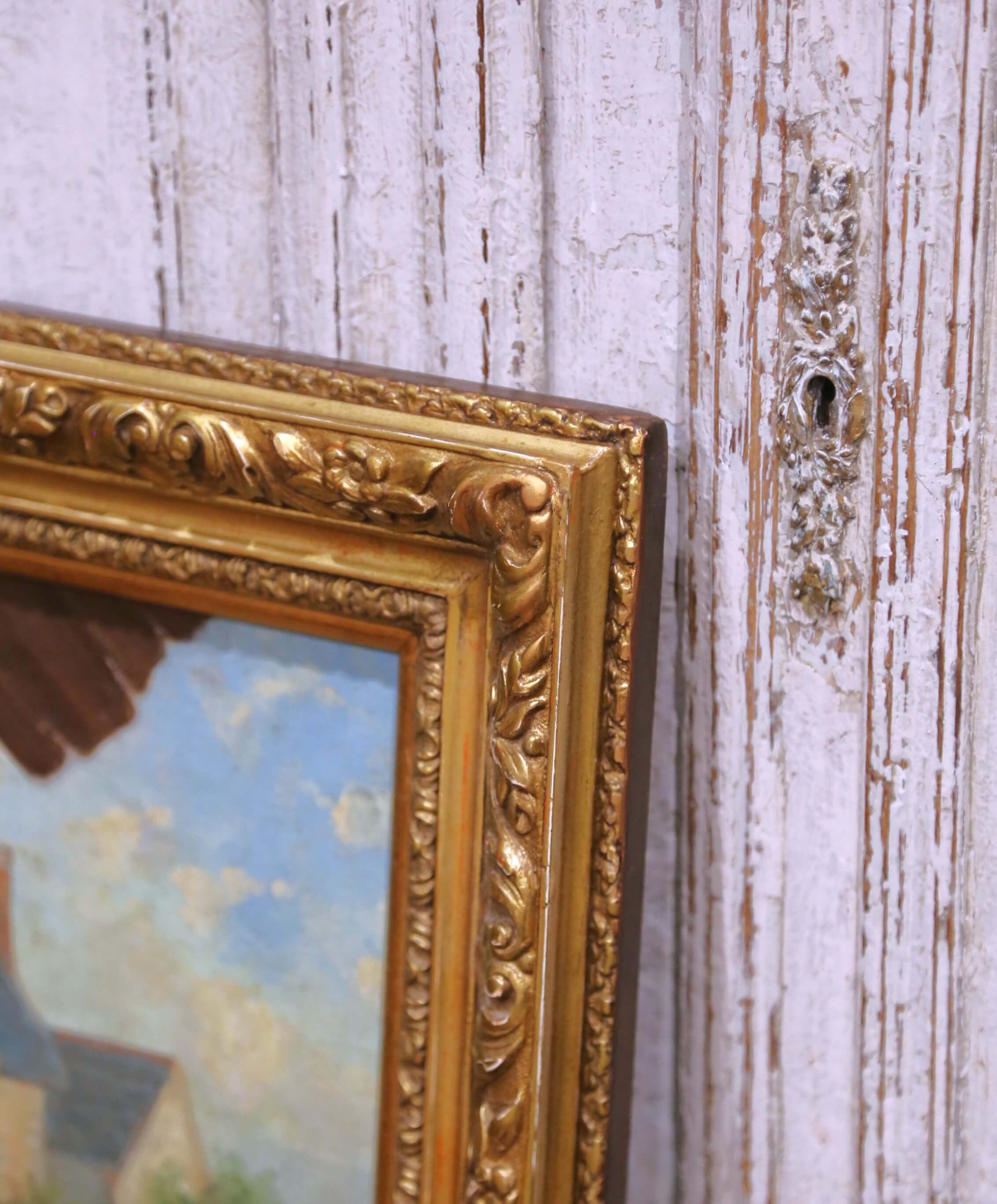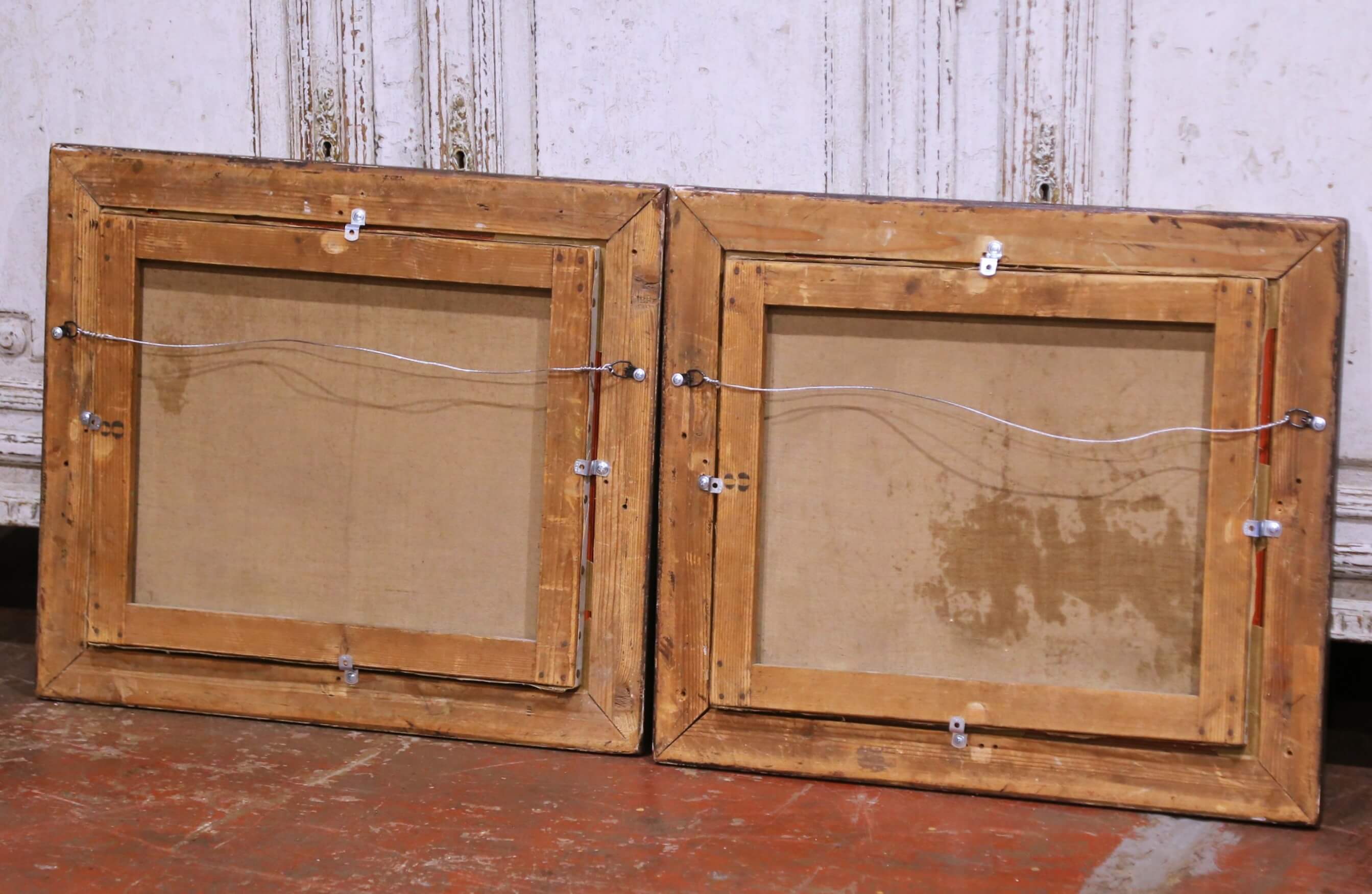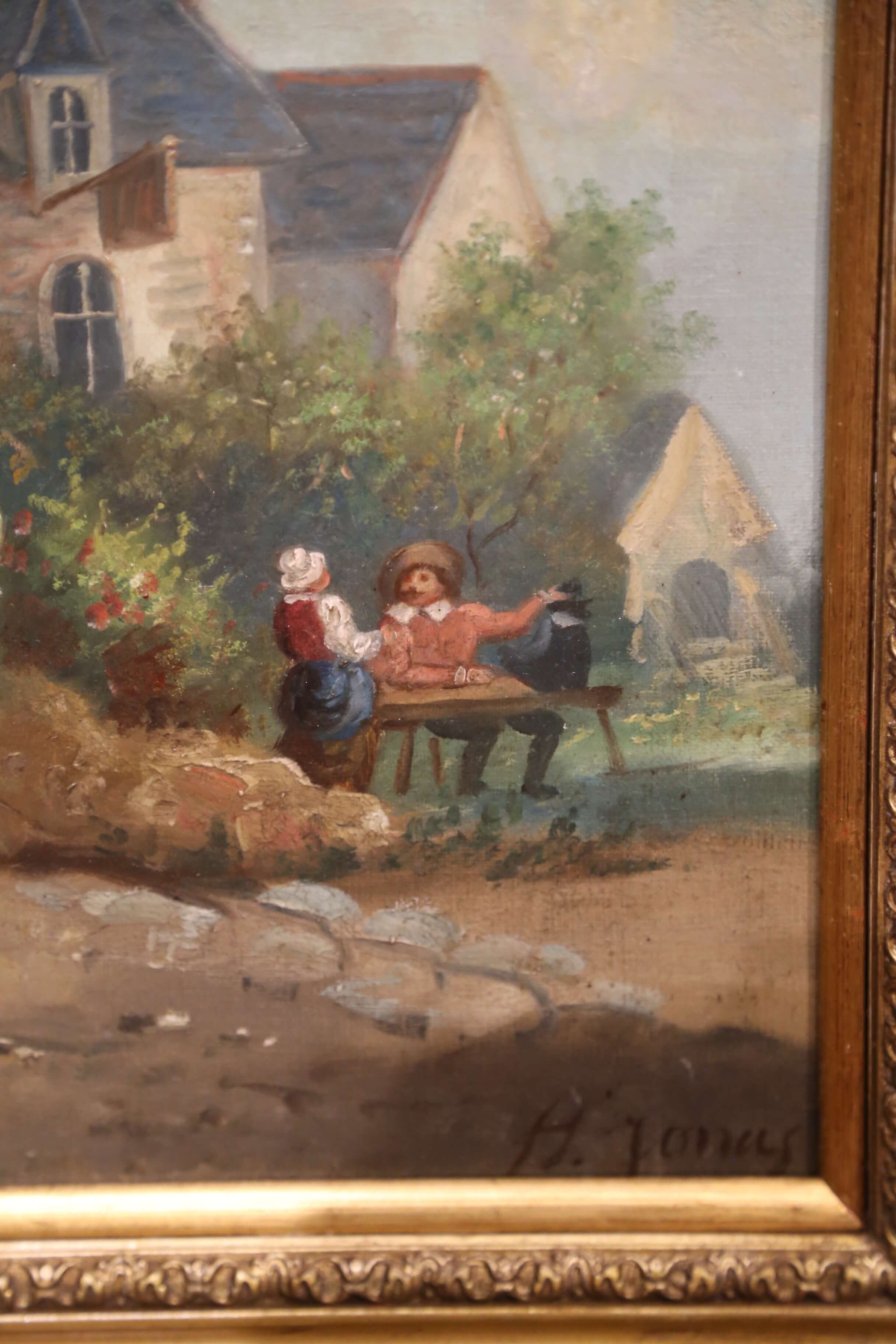 Decorate a wall or study with this charming pair of antique pendants genre paintings. Crafted in France circa 1870, each oil on canvas composition captures lively tavern and village scenes inspired by 17th century Dutch interiors, featuring elegantly dressed figures gathered around tables engaged in conversation, drinking, and leisure. One scene unfolds inside a rustic inn with a grand fireplace and animated figures, while the companion piece extends outdoors, depicting a convivial gathering near a country house with additional figures enjoying a game at a small table in the background.