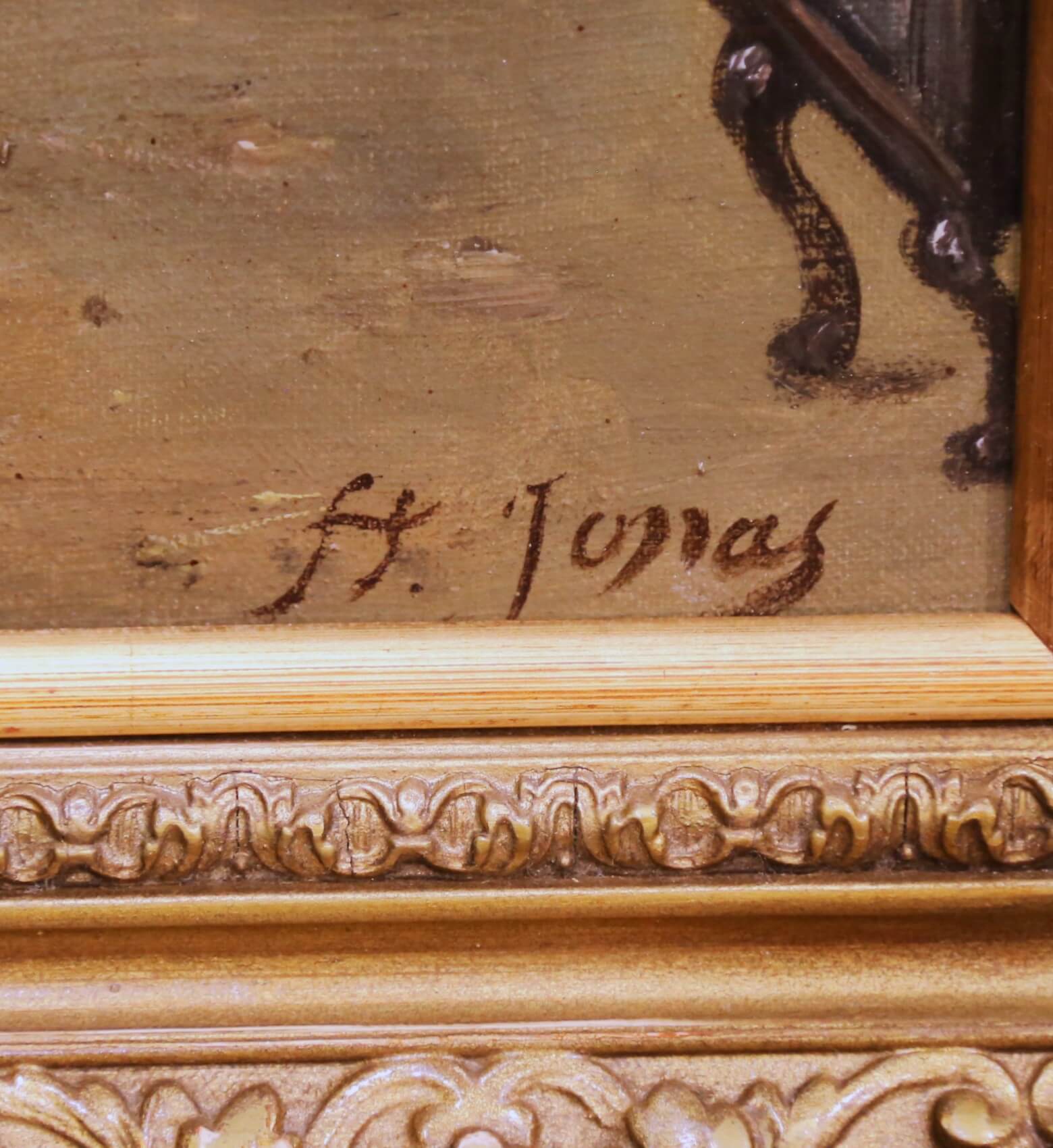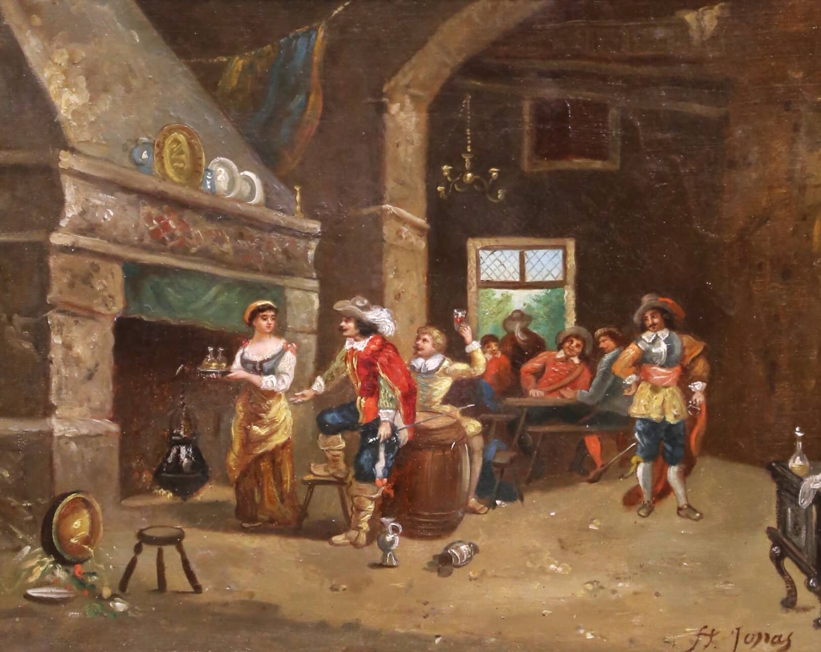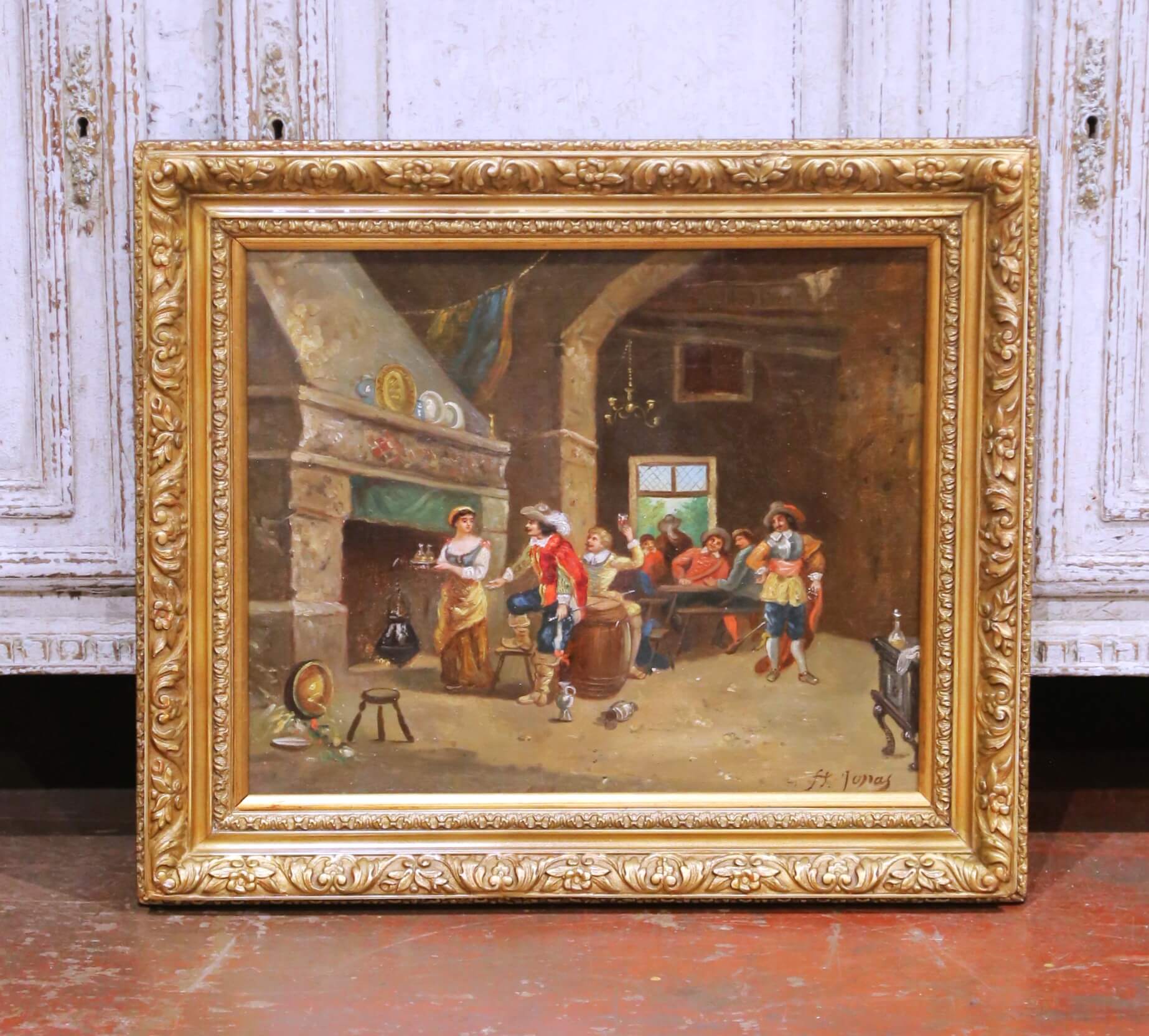 Executed in the manner of Old Master genre painting, the works are rich in narrative detail, with expressive characters, period costumes, and carefully rendered architectural elements. The artist uses a warm, earthy palette accented with vibrant reds, blues, and ochres, bringing depth and movement to each composition. Both paintings are signed lower right “H. Jonas,” and are presented in their original carved giltwood frames decorated with scrolling foliate motifs, adding further elegance and texture.
