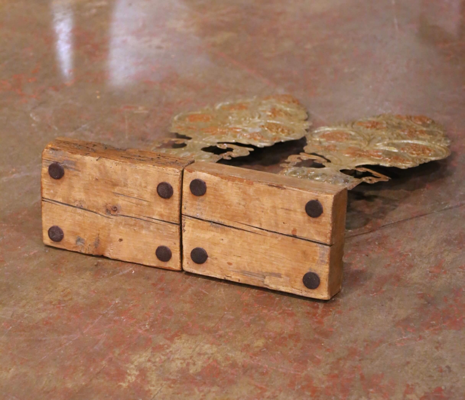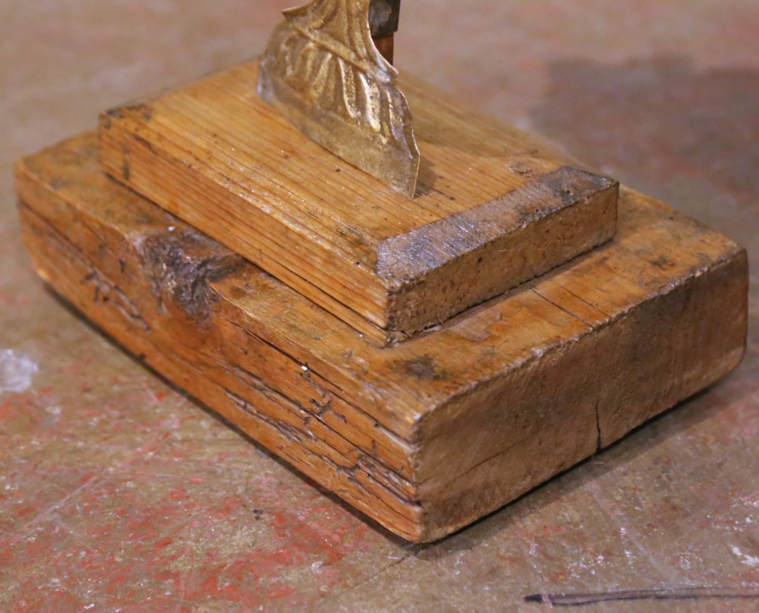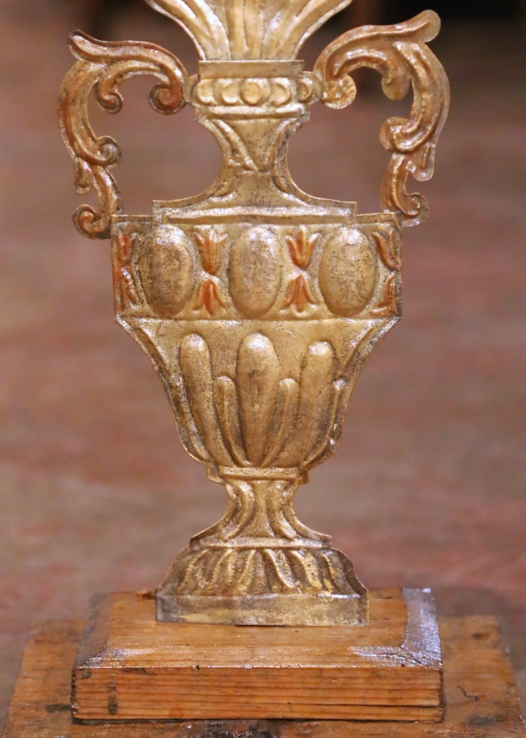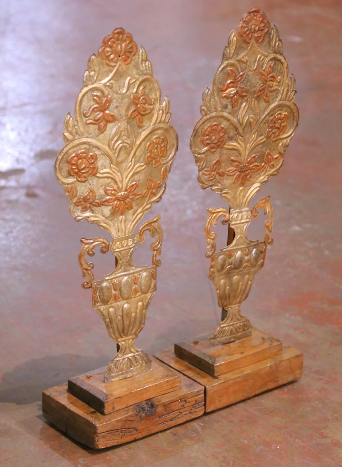 Decorate a console or mantel with this elegant pair of carved and giltwood antique urn ornaments from Italy, circa 1850. Each decorative piece features a finely sculpted urn base supporting a stylized floral bouquet in full relief, richly adorned with scrolling acanthus handles and intricate flower details. The carvings retain their original gilded and polychrome finish, revealing warm tones of gold leaf over red and terracotta accents that highlight the craftsmanship of mid-19th-century Italian decorative art. Mounted on stepped wooden plinths for stability and display, the carvings showcase beautifully aged surfaces with a soft, timeworn patina throughout. Their neoclassical composition makes them versatile accents for both traditional and contemporary interiors, ideal for flanking mirrors, entry consoles, or as sculptural tabletop décor. Excellent condition commensurate with age and use, with minor wear adding to their authentic antique character. Measures: 9.75” W x 6.5” D x 27.5” H.