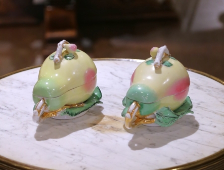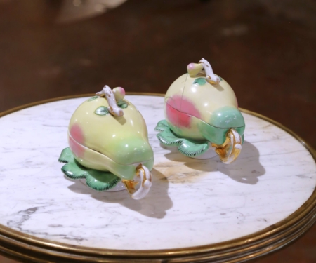 Whimsical yet elegant, this rare matched pair of pear-shaped covered tureens was crafted in Russia circa 1870 by the renowned Riga Kuznetsov Porcelain Factory. Expertly hand-painted, each tureen features a soft yellow and pale green ground with a warm rosy blush on either side, beautifully imitating the look of ripened fruit. The sculptural lids are topped with a naturalistic branch-form handle and a miniature pear finial, all accented with delicate gilt highlights. Each tureen rests on an integrated shaped base, painted in vibrant green with fine veining to enhance its naturalistic appeal. The interiors are fully glazed in white, allowing them to serve as both functional dishes and decorative display pieces. In excellent condition commensurate with age and use, the vessels cheerful palette and playful form would make a captivating centerpiece for a dining table, sideboard, or vitrine display. Bearing the underglaze blue Kuznetsov Riga factory mark to the underside, this pair represents a fine and collectible example of 19th-century Russian porcelain. The Kuznetsov porcelain works, founded in 1810 by Matvey Kuznetsov, grew to become the largest porcelain manufacturer in Imperial Russia by the late 19th century, supplying both the aristocracy and the royal court. The Riga branch was celebrated for its colorful and finely modeled wares, often blending European styles with traditional Russian motifs. Measures: 7″W x 4.5″D x 5″H
