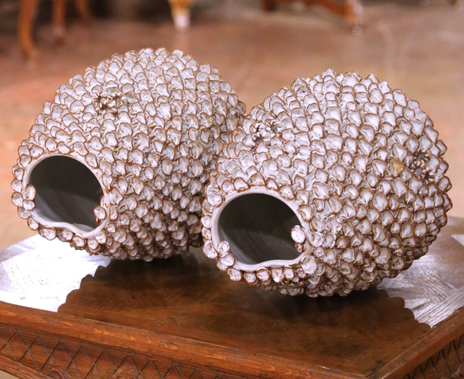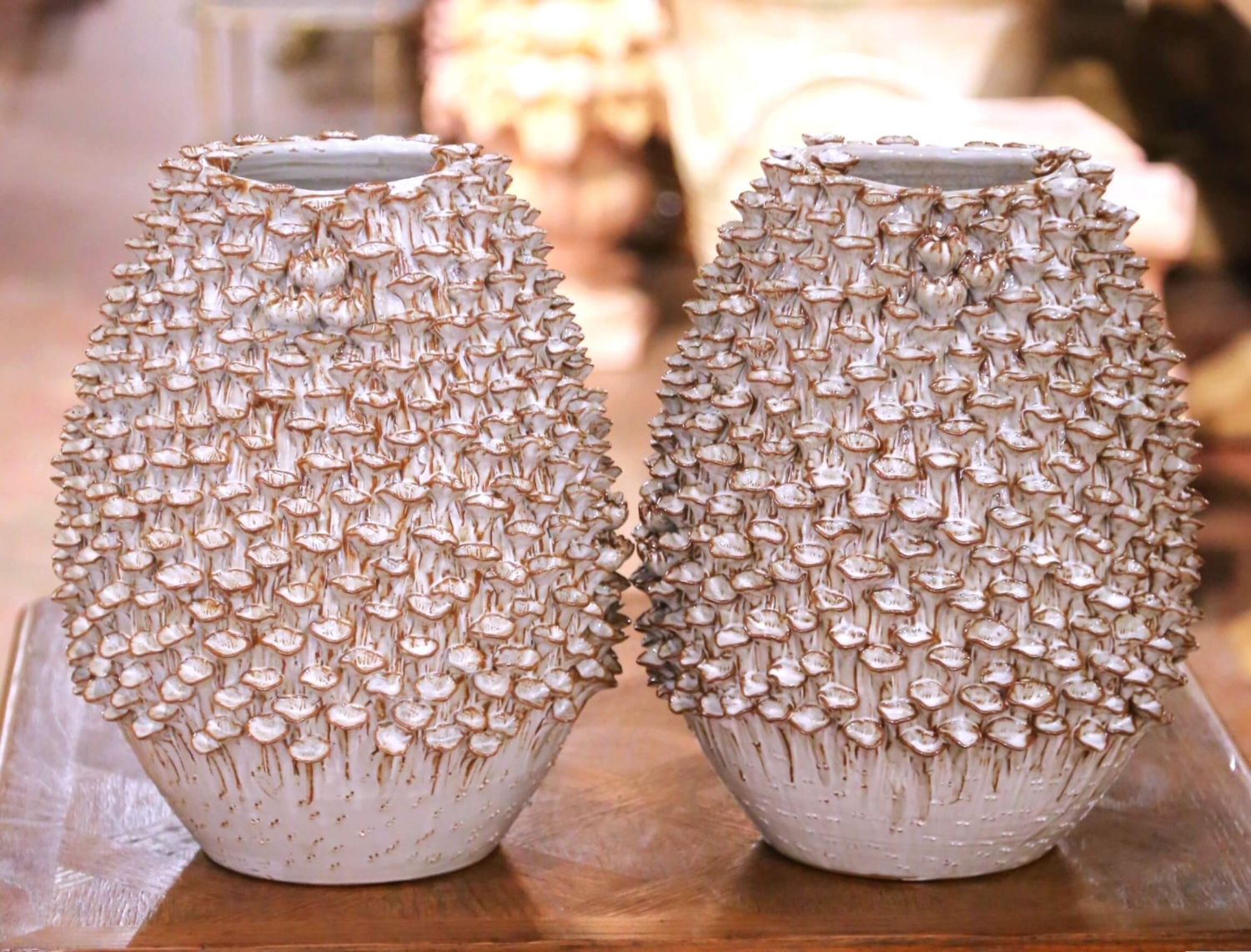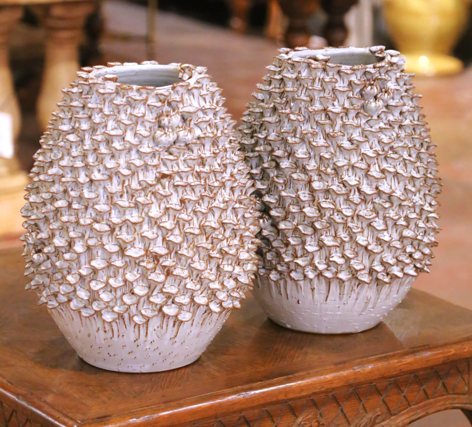 This sculptural pair of contemporary French ceramic vases was crafted circa 2010 and reflects the refined organic aesthetic seen in high-end European decorative design. Each vessel is entirely hand-built and richly adorned with dense, applied barbotine relief inspired by mushroom clusters and natural growth formations, creating exceptional texture and a strong biomorphic presence. The rounded bodies taper gently toward the necks, while the organically undulating rims are finished with the same sculptural detailing, allowing the vases to read as fully three-dimensional objects from every angle. A glossy white glaze is subtly accented with warm ochre-brown tones that highlight the relief work and add depth without overpowering the form. Elegant yet bold, these vases bridge contemporary design and nature-inspired sculpture, making them ideal statement pieces for a console, pedestal, or dining table. They are in excellent condition commensurate with age and use and display beautifully together or as symmetrical accents in a curated interior. Dimensions: 14″W x 12″D x 14.5″H
