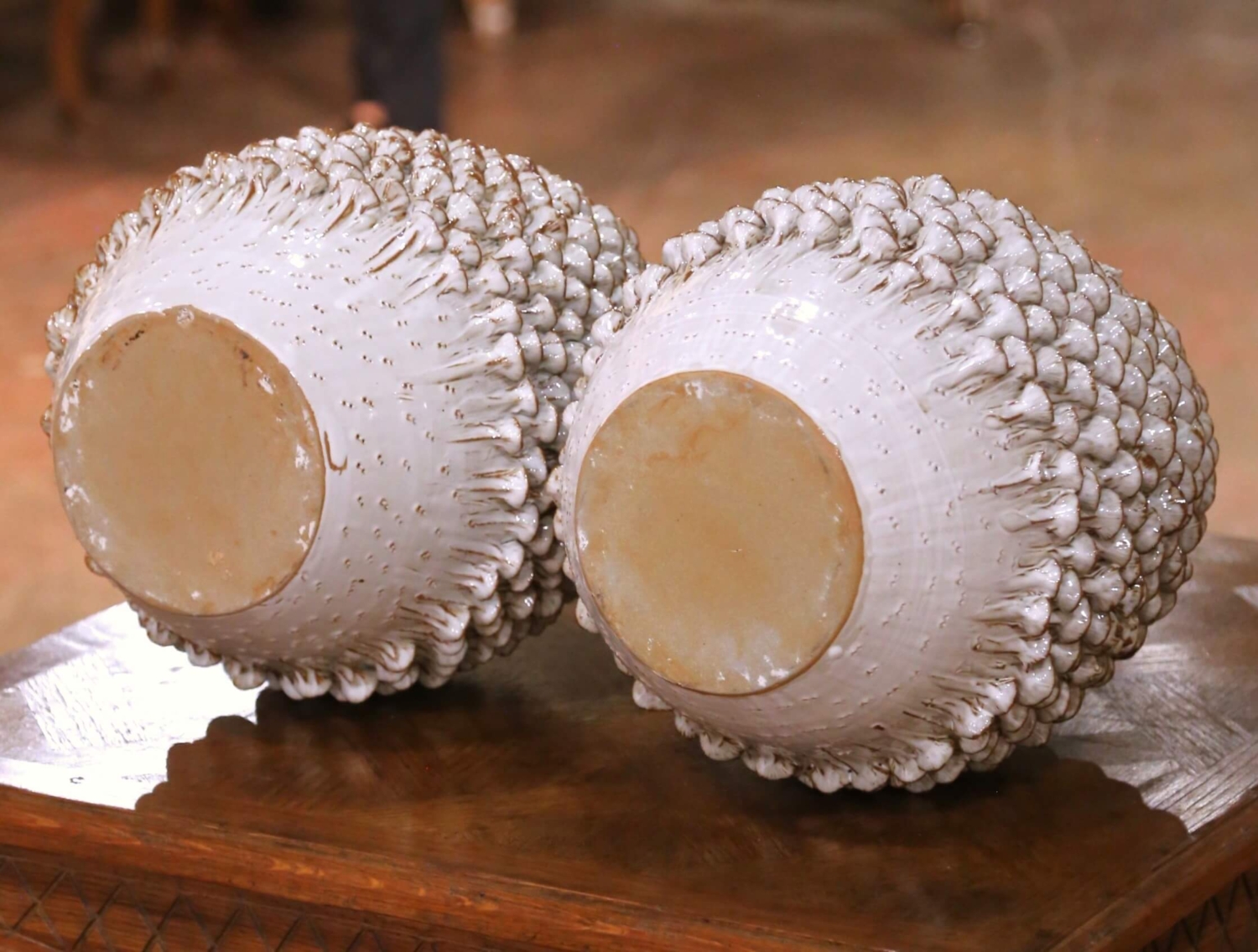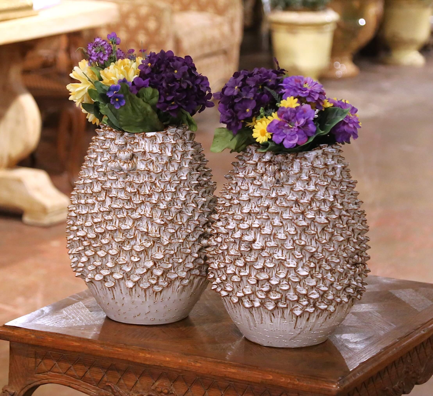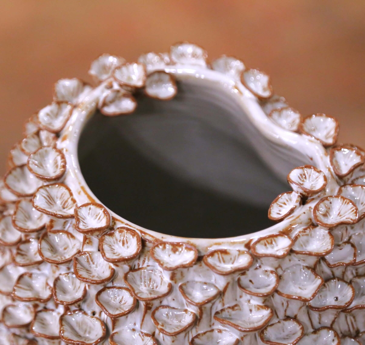 This sculptural pair of contemporary French ceramic vases was crafted circa 2010 and reflects the refined organic aesthetic seen in high-end European decorative design. Each vessel is entirely hand-built and richly adorned with dense, applied barbotine relief inspired by mushroom clusters and natural growth formations, creating exceptional texture and a strong biomorphic presence. The rounded bodies taper gently toward the necks, while the organically undulating rims are finished with the same sculptural detailing, allowing the vases to read as fully three-dimensional objects from every angle. A glossy white glaze is subtly accented with warm ochre-brown tones that highlight the relief work and add depth without overpowering the form. Elegant yet bold, these vases bridge contemporary design and nature-inspired sculpture, making them ideal statement pieces for a console, pedestal, or dining table. They are in excellent condition commensurate with age and use and display beautifully together or as symmetrical accents in a curated interior. Dimensions: 14″W x 12″D x 14.5″H