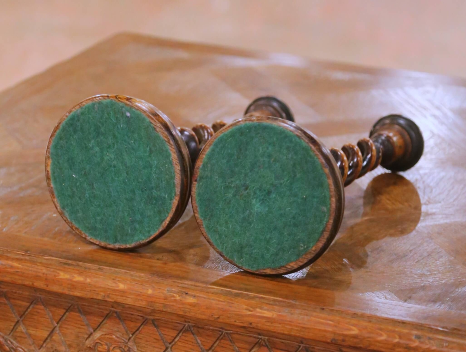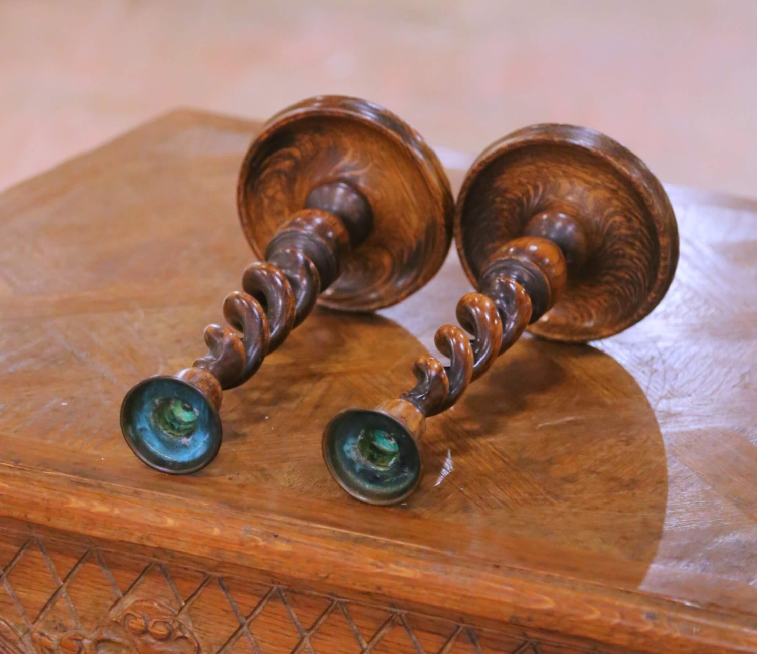 This elegant pair of antique candlesticks was crafted in England circa 1920. Each candle holder stands on a substantial round plinth base and features a beautifully turned barley twist stem with open, pierced carving that gives the silhouette depth and movement. The spiral shaft rises from a baluster-form knop and is topped with a brass candle cup, adding a subtle contrast of warm metal against the rich wood tone. The oak displays a deep, dark walnut patina with attractive grain variation throughout, enhancing the sculptural quality of the twist design. The underside retains protective felt pads, and the brass liners show gentle oxidation consistent with age. These antique candlesticks are in excellent condition commensurate with age and use. Perfect for a dining table, mantel, or console, they bring classic English character and timeless warmth to both traditional and transitional interiors. Dimensions: 5.5″W x 5.5″D x 12.5″H