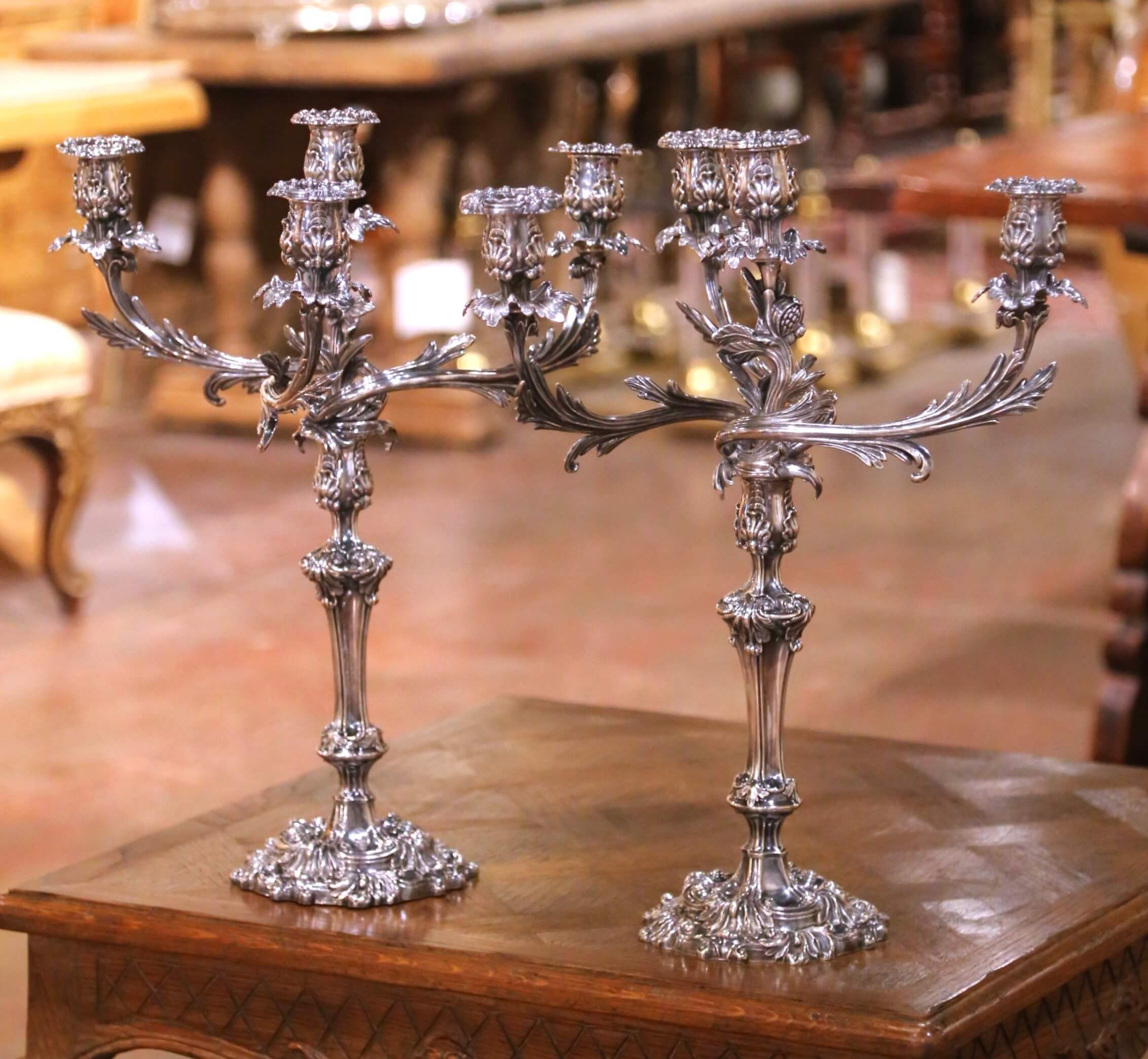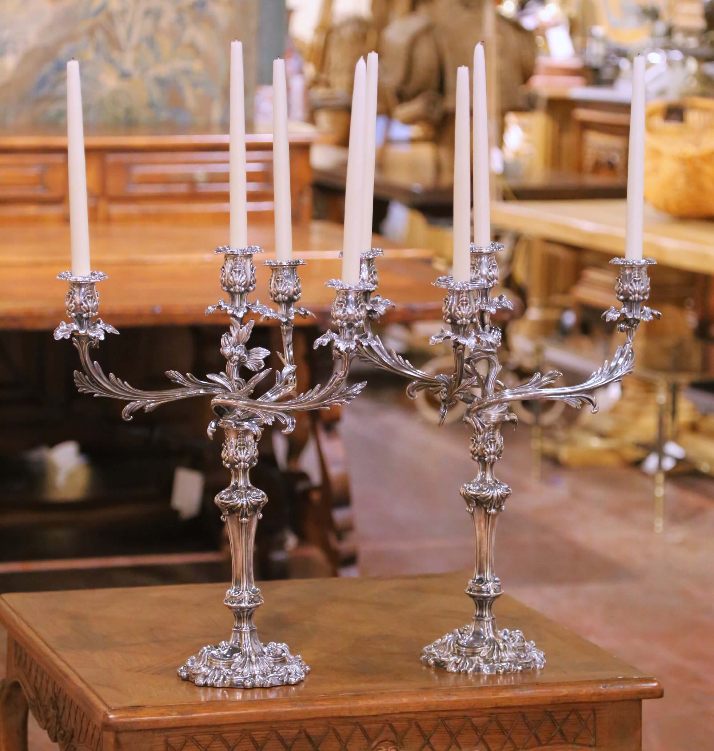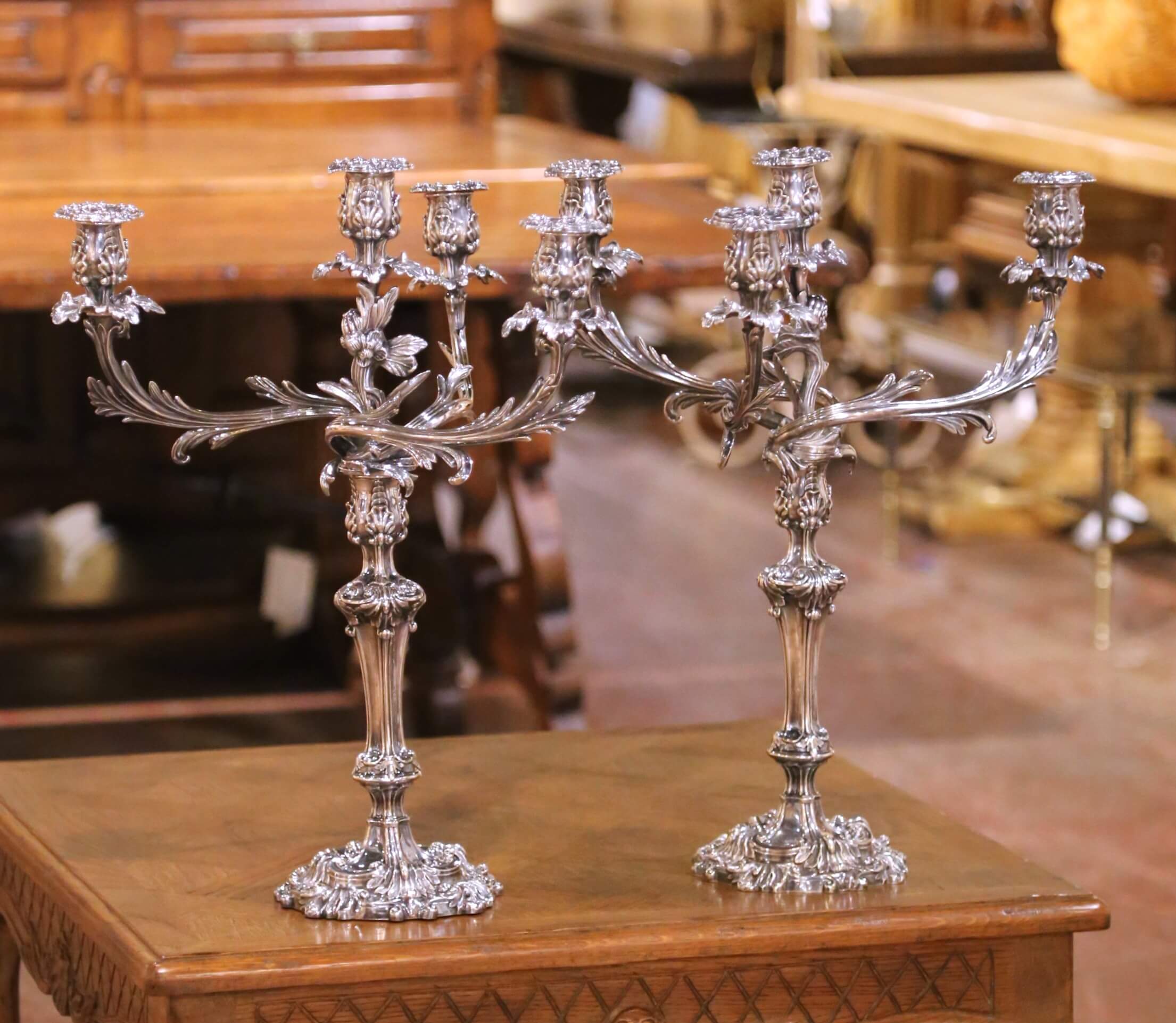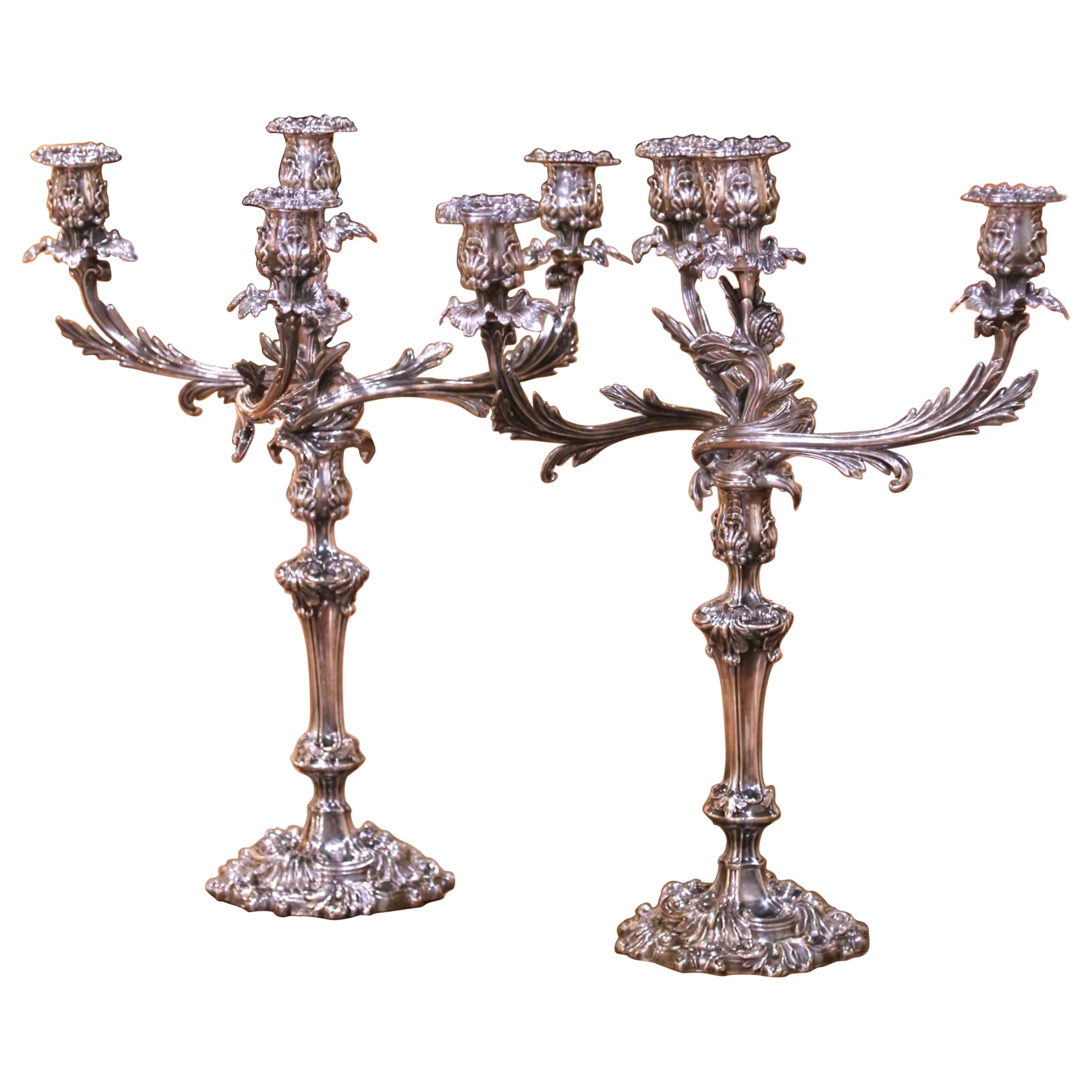 Decorate a dining table or mantel with this elegant pair of antique English silver plate candelabras, crafted in Birmingham circa 1910. Designed in the Louis XV taste, each piece features a richly cast base with scrolling acanthus leaves and shell motifs, rising to a fluted baluster stem adorned with refined Rococo detailing.