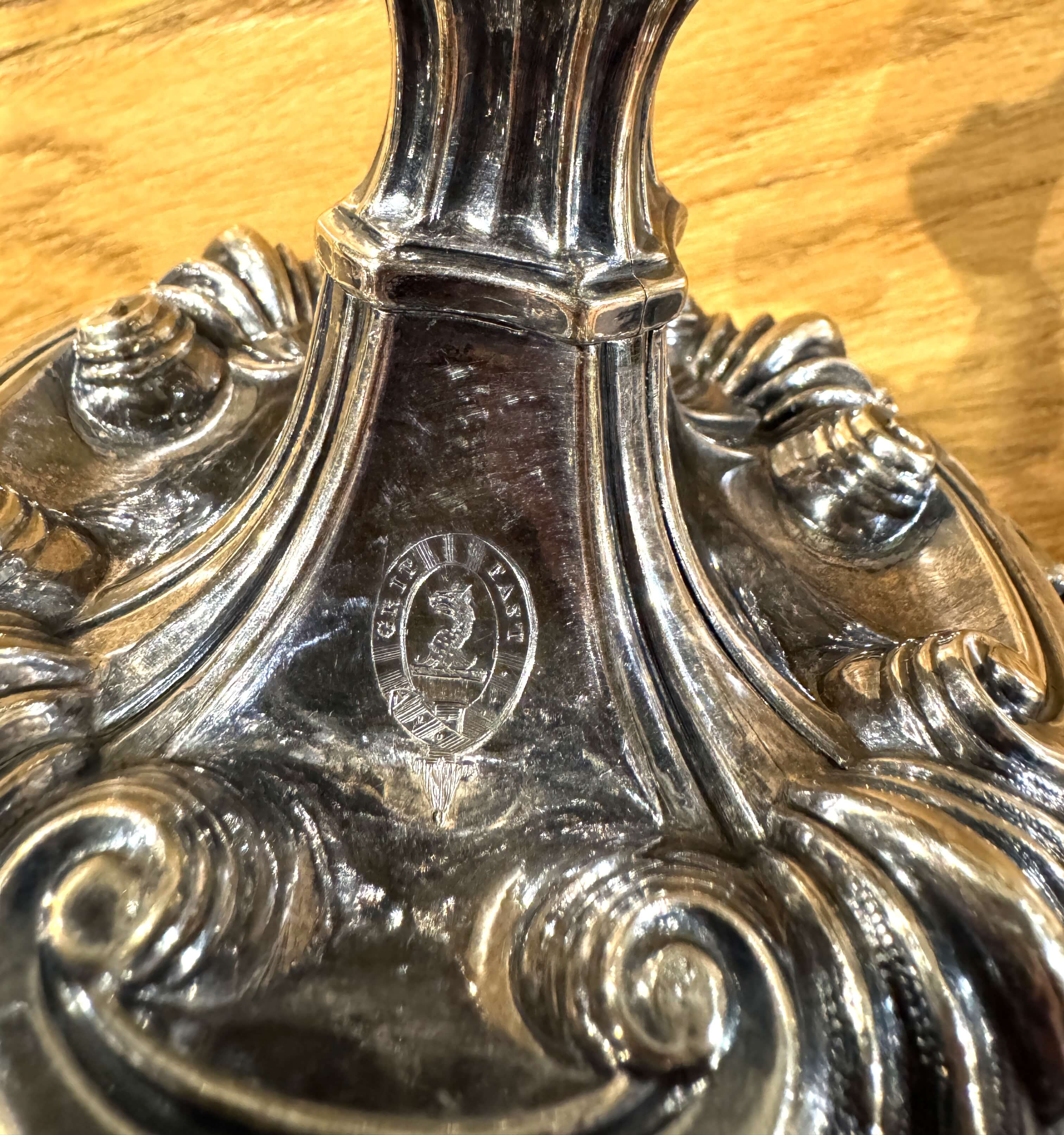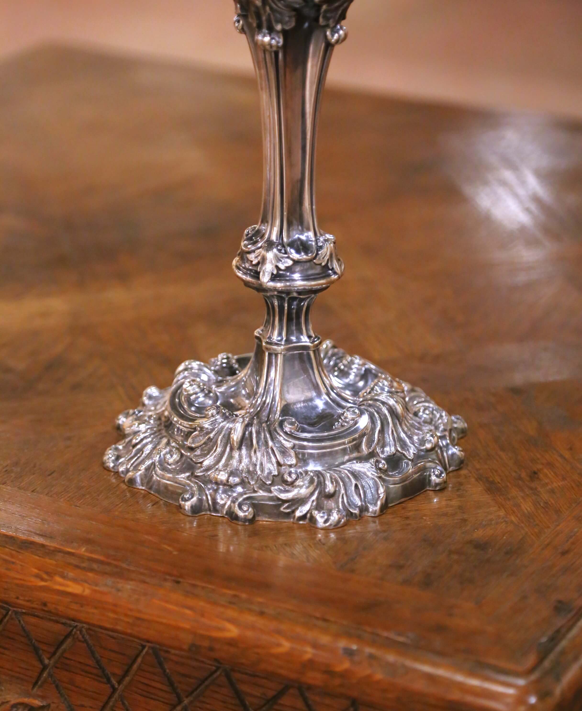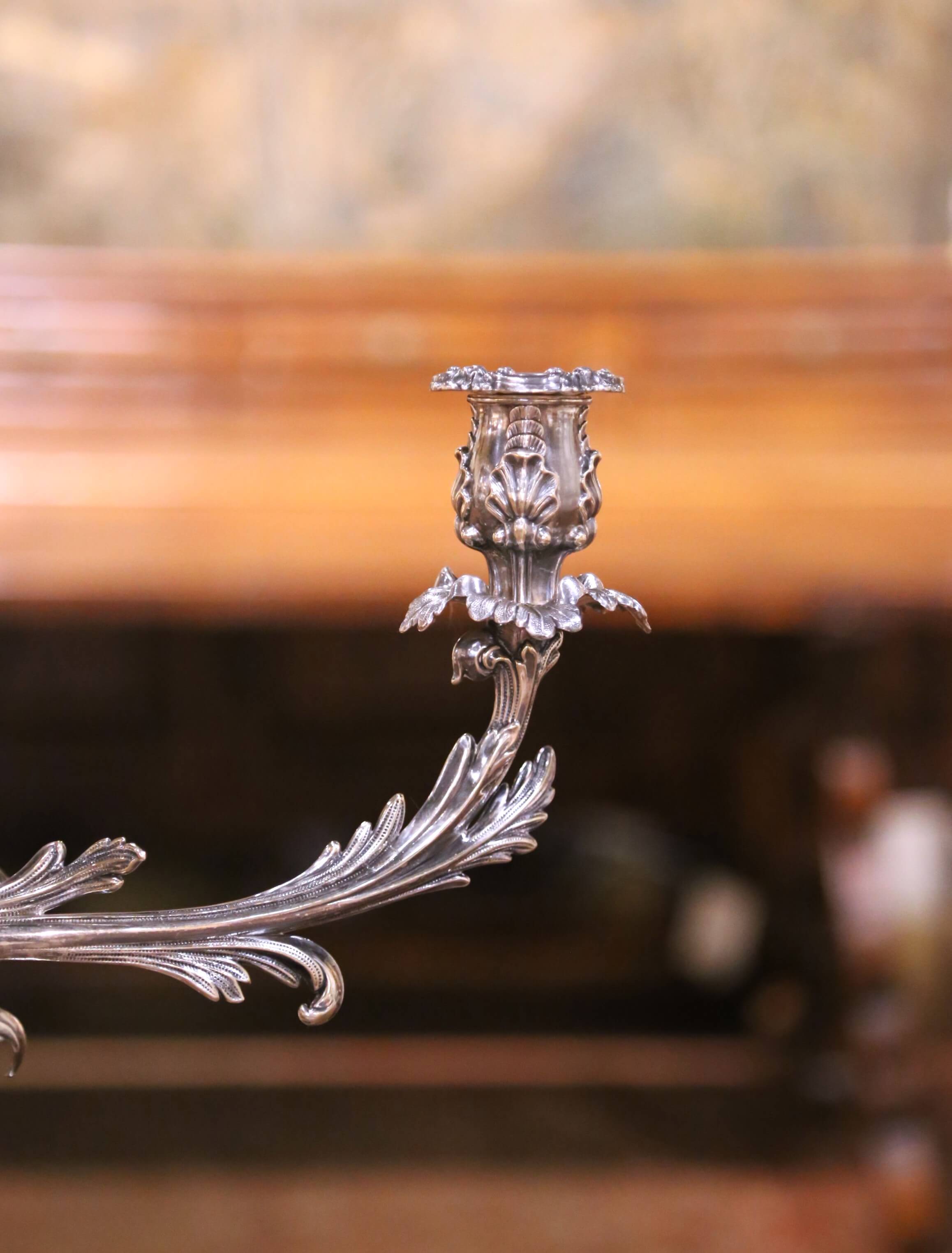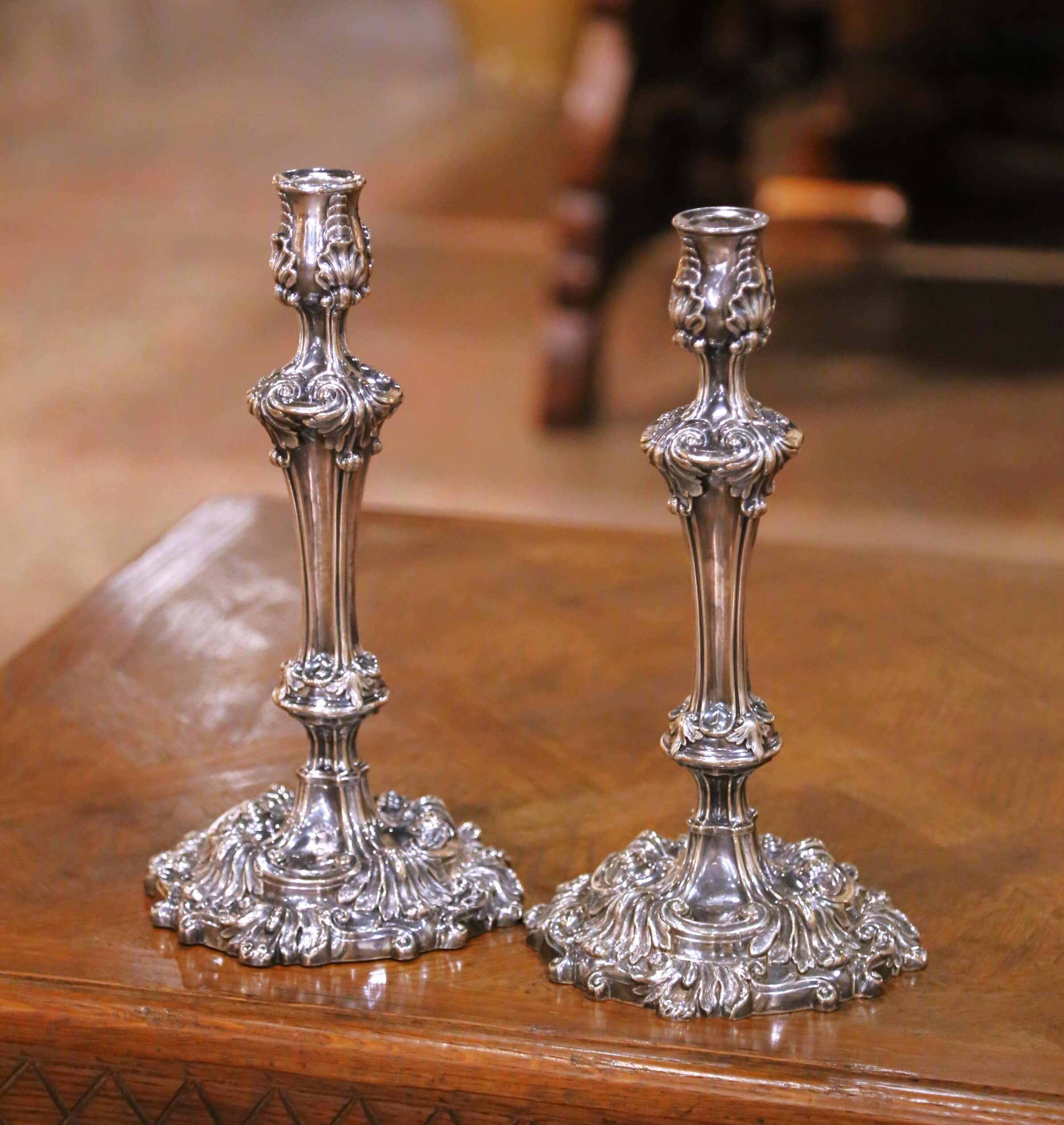 Decorate a dining table or mantel with this elegant pair of antique English silver plate candelabras, crafted in Birmingham circa 1910. Designed in the Louis XV taste, each piece features a richly cast base with scrolling acanthus leaves and shell motifs, rising to a fluted baluster stem adorned with refined Rococo detailing.