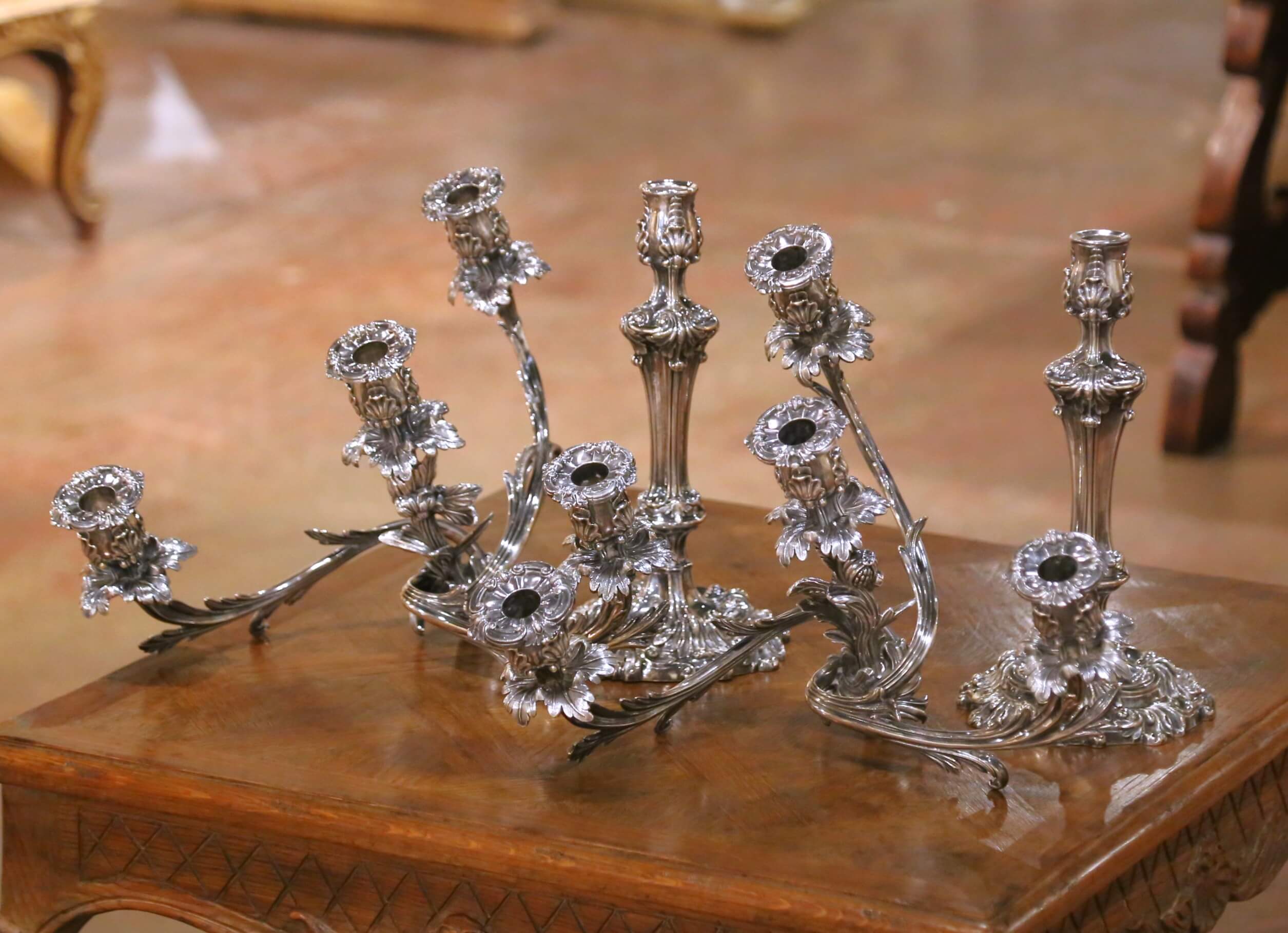 Pair of Early 20th Century English Silver Plated Rococo Four-Arm Candelabras