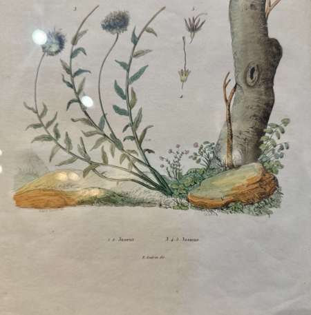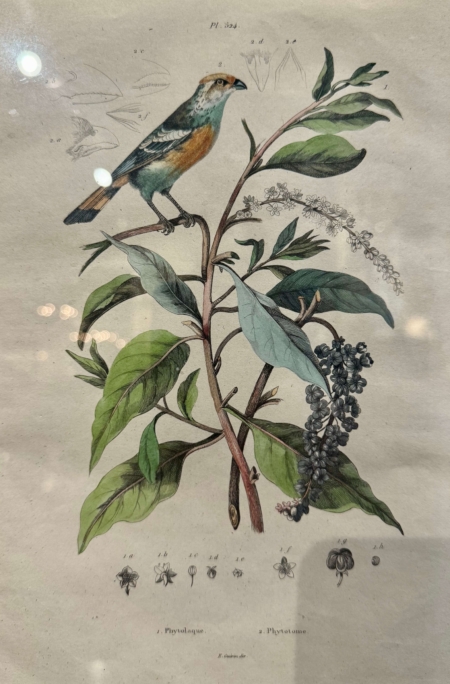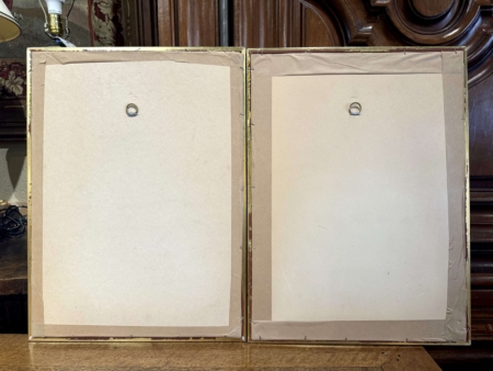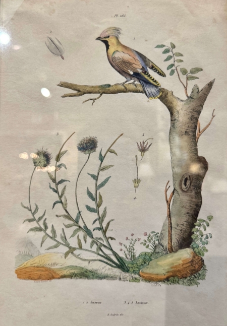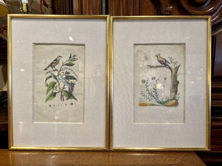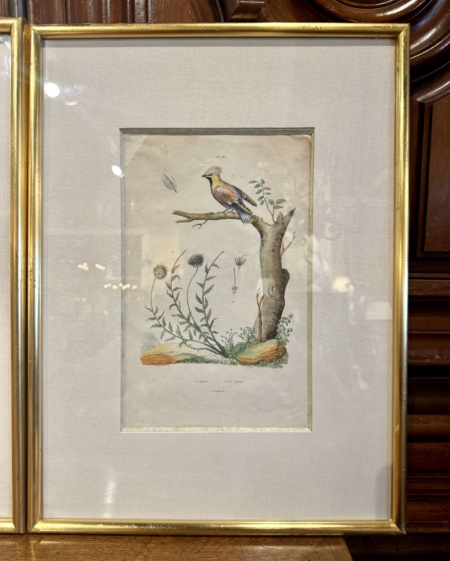 Decorate a office or study with this set of antique lithographs. Hand painted in France circa 1920 by E. Guerin, each print is set in the original gilt wood frame adding a touch of elegance and preserving the artwork. These framed illustrations showcasing detailed and vibrant depictions of birds perched on branches. The lithographs are expertly crafted, highlighting the intricate details of the birds and surrounding foliage. Guerin’s work is known for its accuracy and artistic finesse, often used in botanical and ornithological studies of the time. These pieces reflect the era’s appreciation for nature and artistry, making them valuable collectibles for enthusiasts of vintage illustrations and natural history. Ernest Pierre Guerin (1887-1952) was a French artist born in Brittany; he educated at the Rennes School of Fine Arts, where he studied under Félix Lafond and Jules Ronsin. His work vividly depicted the customs and harsh realities of Breton life, drawing inspiration from the region’s landscapes, religious festivals, and traditional culture. Influenced by the Pre-Raphaelite movement and medieval illumination, Guérin gained international recognition, receiving prestigious commissions, including from the English crown. After serving in World War I, Guérin chose to leave Paris for the tranquility of Brittany, where he continued to create and exhibit his work, opening galleries in Dinard and Quiberon. His later work reflected a shift towards a more Taoist vision, incorporating elements of Japanese and Chinese art. Although his work fell into obscurity after World War II, Guérin’s legacy was revived with exhibitions in the early 2000s, culminating in a dedicated exhibition in 2024 at the Musée du Faouët. 14″W x 19″H
