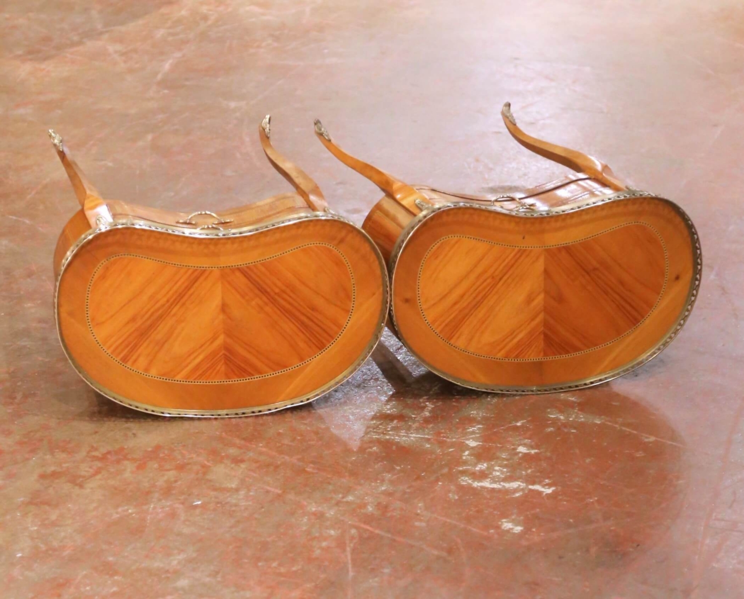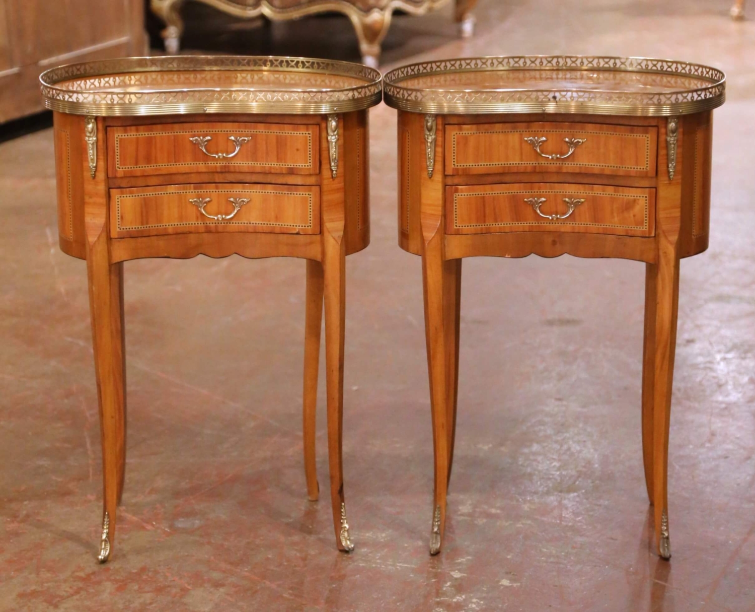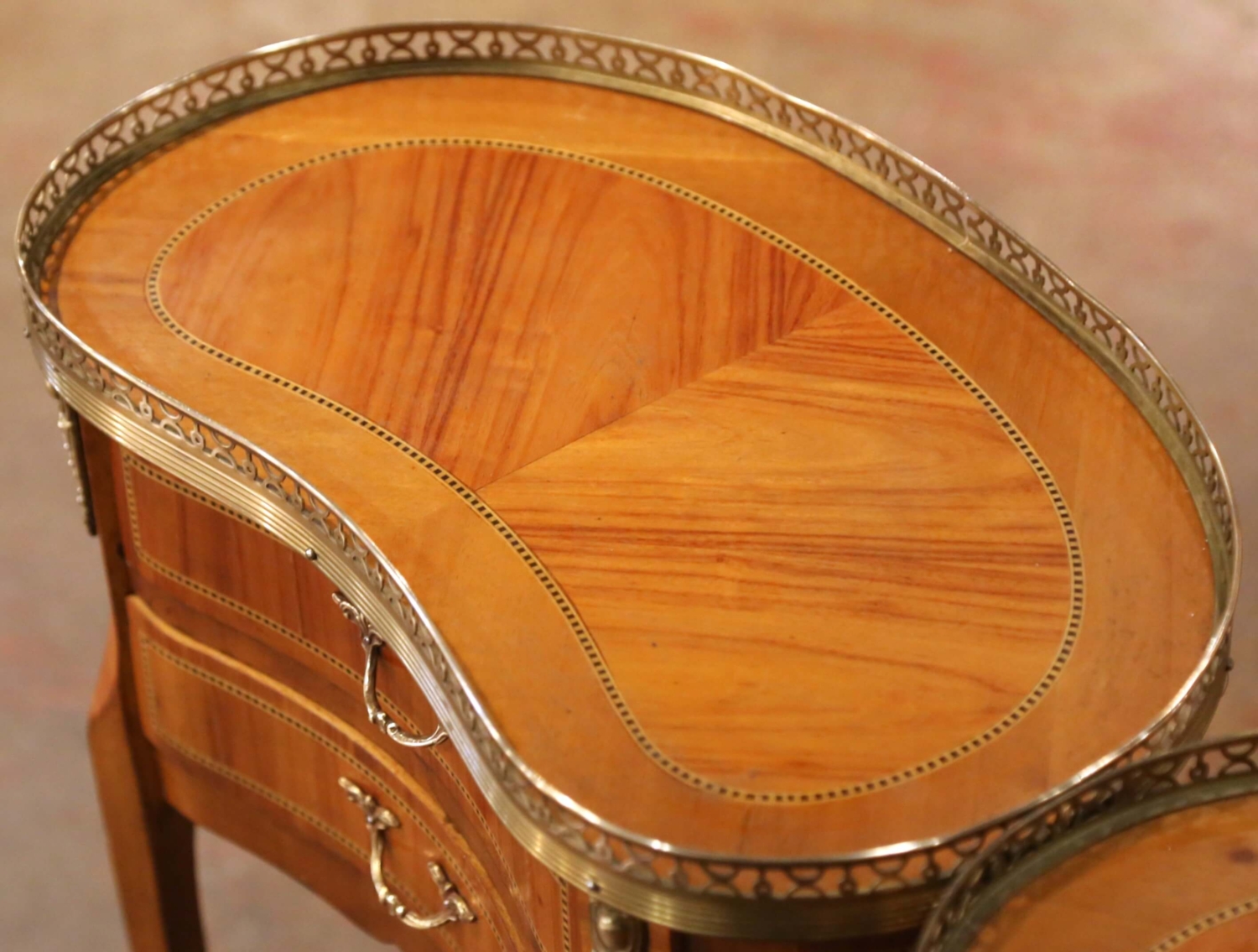 This elegant pair of antique French Louis XV style side tables was crafted in France circa 1930. Each table is made of cherry and features refined marquetry inlay along the drawer fronts and case edges, showcasing the decorative craftsmanship associated with the Louis XV tradition. The graceful kidney-shaped tops are fitted with pierced brass galleries, offering both visual refinement and functional protection. Each table is fitted with two drawers accented with marquetry borders and original brass pulls. Slender, cabriole-inspired legs taper gracefully and terminate in brass sabots, reinforcing the Louis XV influence while maintaining a light, elegant silhouette. The walnut surfaces display a warm, time-softened patina that highlights the natural grain and fine inlay work. Versatile in scale, these antique tables work beautifully as side tables, nightstands, or accent pieces in a living room or bedroom. Both are in excellent condition commensurate with age and use. Dimensions: 18.5″W x 11.5″D x 26″H (each)