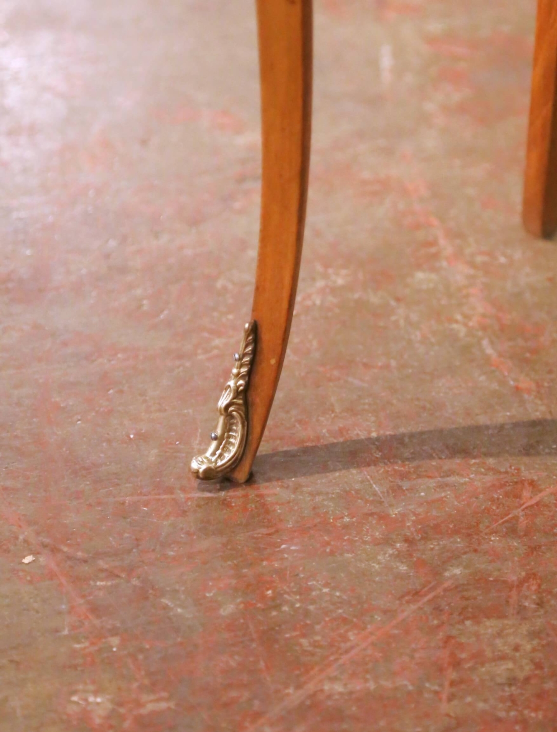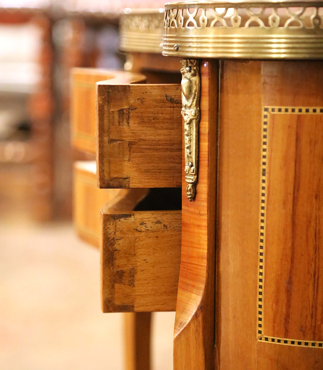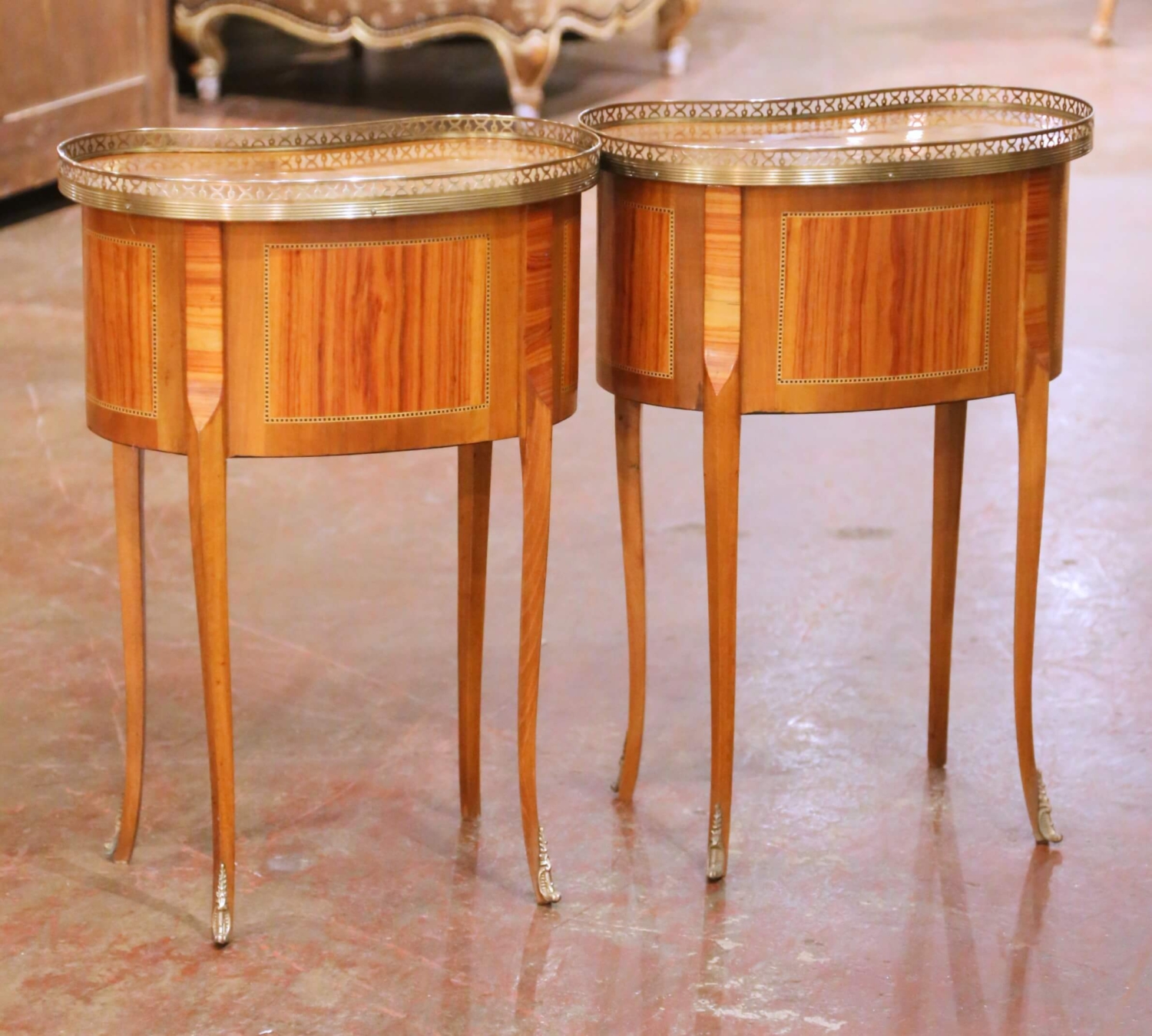 This elegant pair of antique French Louis XV style side tables was crafted in France circa 1930. Each table is made of cherry and features refined marquetry inlay along the drawer fronts and case edges, showcasing the decorative craftsmanship associated with the Louis XV tradition. The graceful kidney-shaped tops are fitted with pierced brass galleries, offering both visual refinement and functional protection. Each table is fitted with two drawers accented with marquetry borders and original brass pulls. Slender, cabriole-inspired legs taper gracefully and terminate in brass sabots, reinforcing the Louis XV influence while maintaining a light, elegant silhouette. The walnut surfaces display a warm, time-softened patina that highlights the natural grain and fine inlay work. Versatile in scale, these antique tables work beautifully as side tables, nightstands, or accent pieces in a living room or bedroom. Both are in excellent condition commensurate with age and use. Dimensions: 18.5″W x 11.5″D x 26″H (each)
