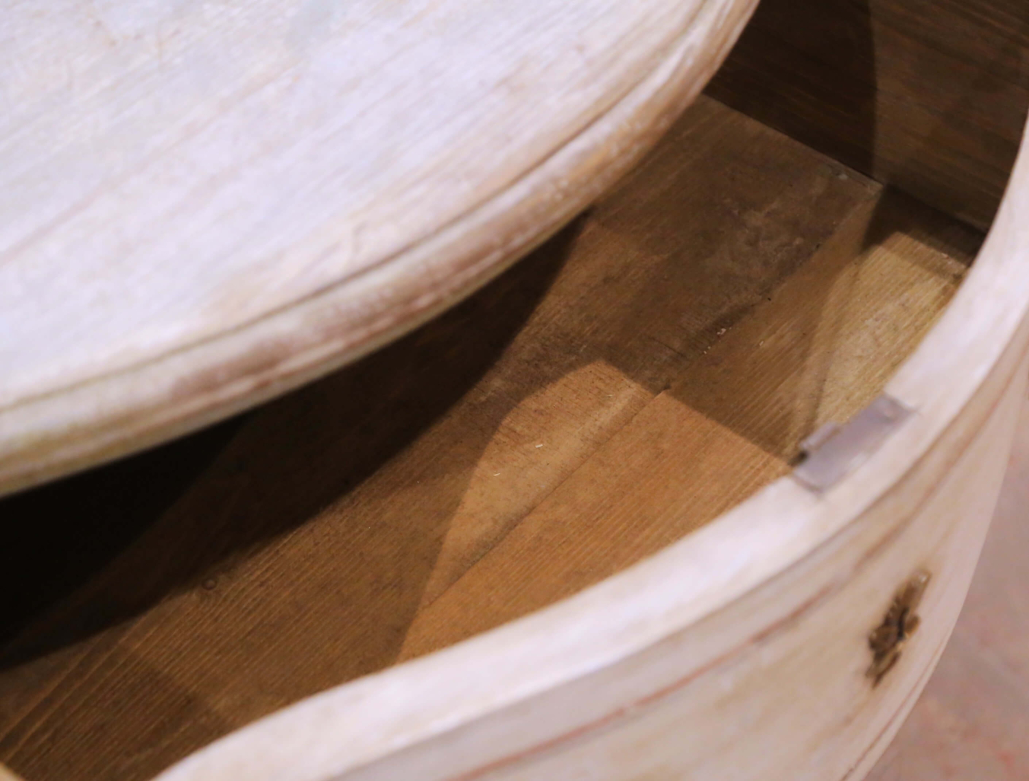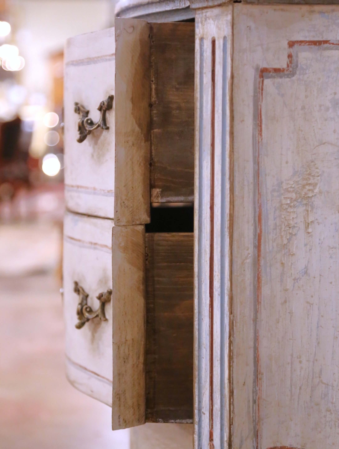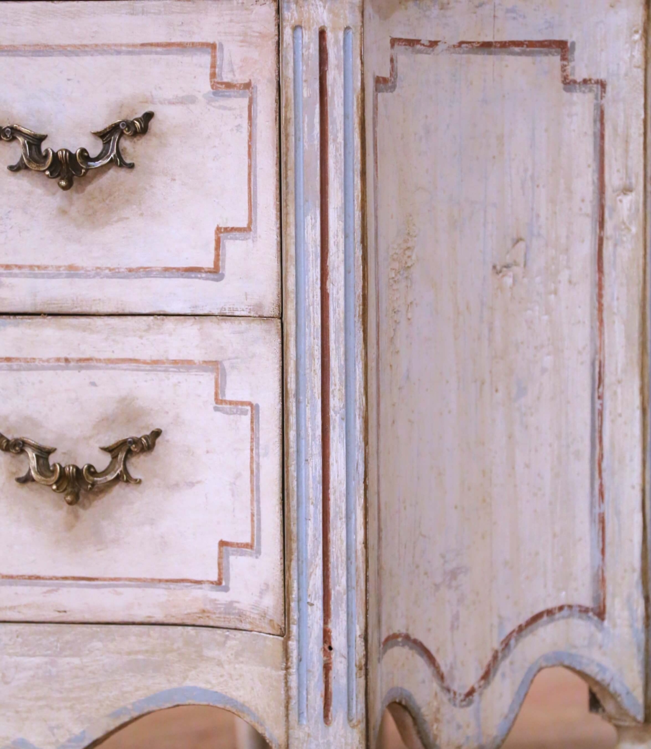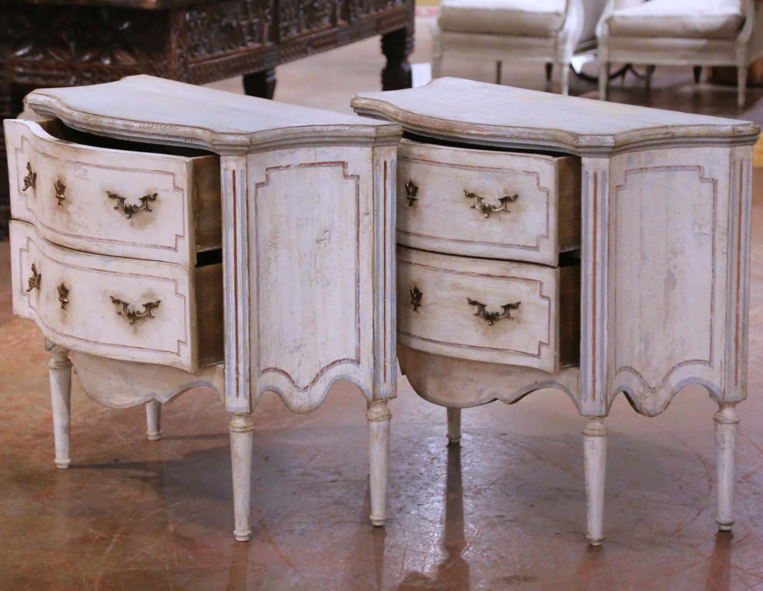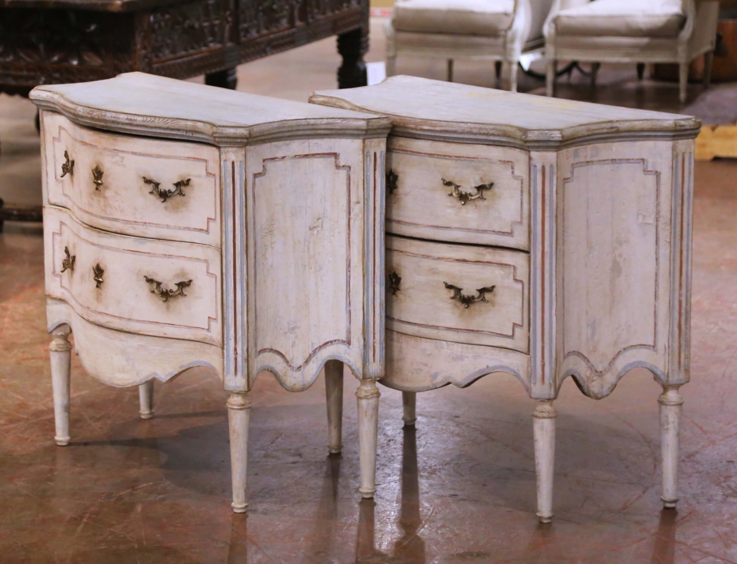 This elegant pair of antique French painted nightstands, dating to circa 1920, reflects the refined neoclassical vocabulary associated with the Louis XVI Revival. Built in oak and beech wood, each cabinet is formed as a small two-drawer commode, with a softly shaped case raised on slender, straight legs and finished with a gently contoured apron that introduces subtle movement while maintaining classical restraint. The surfaces retain a beautifully layered painted finish in pale cream tones with delicate gray-blue accents and hand-painted faux panel detailing. Areas of gentle wear and softened edges reveal underlying tones, creating depth, texture, and an authentic antique patina. Decorative brass pulls accent each drawer, adding warmth and contrast against the light-painted surfaces. The shaped tops follow the contours of the case, while the interiors retain their original wood construction. Compact yet functional, each chest offers practical storage and decorative presence, making the pair well suited for use as bedside tables, end tables, or occasional furniture in traditional, French country, or transitional interiors. The chests are in excellent condition commensurate with age and use. Dimensions: 39.5″W x 17.75″D x 34″H (each)