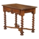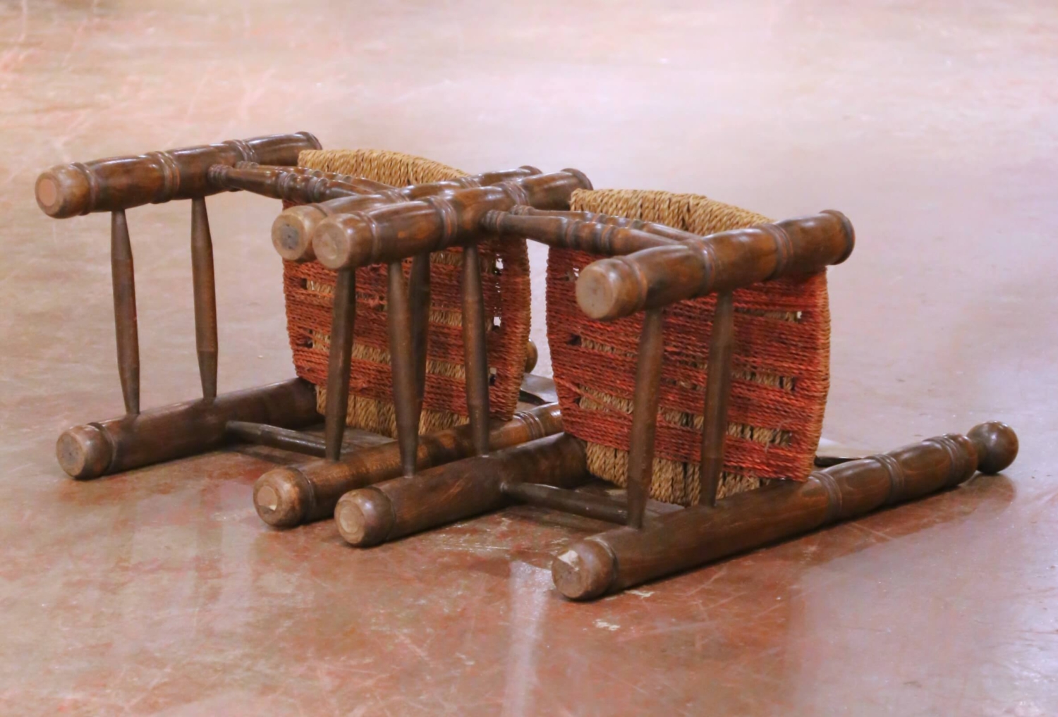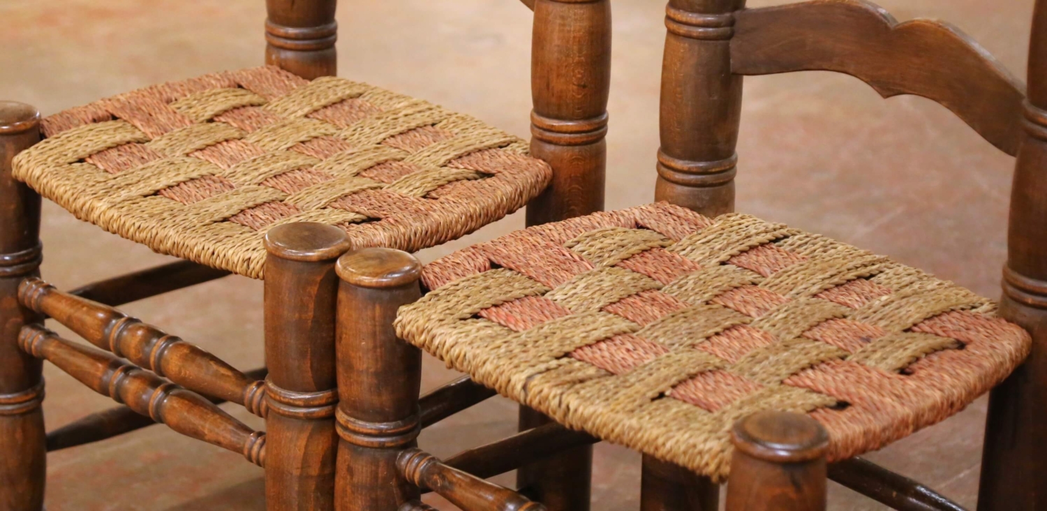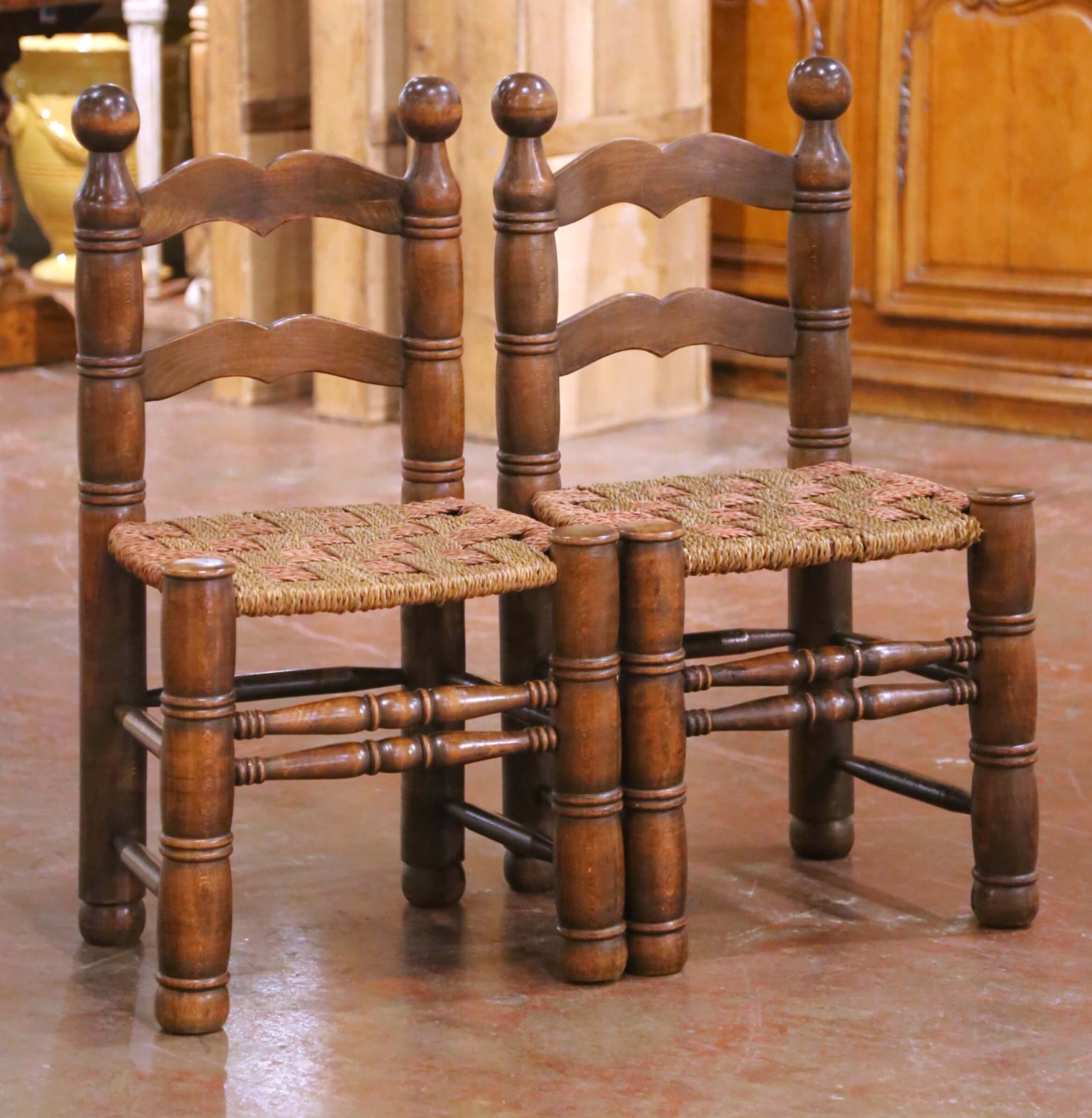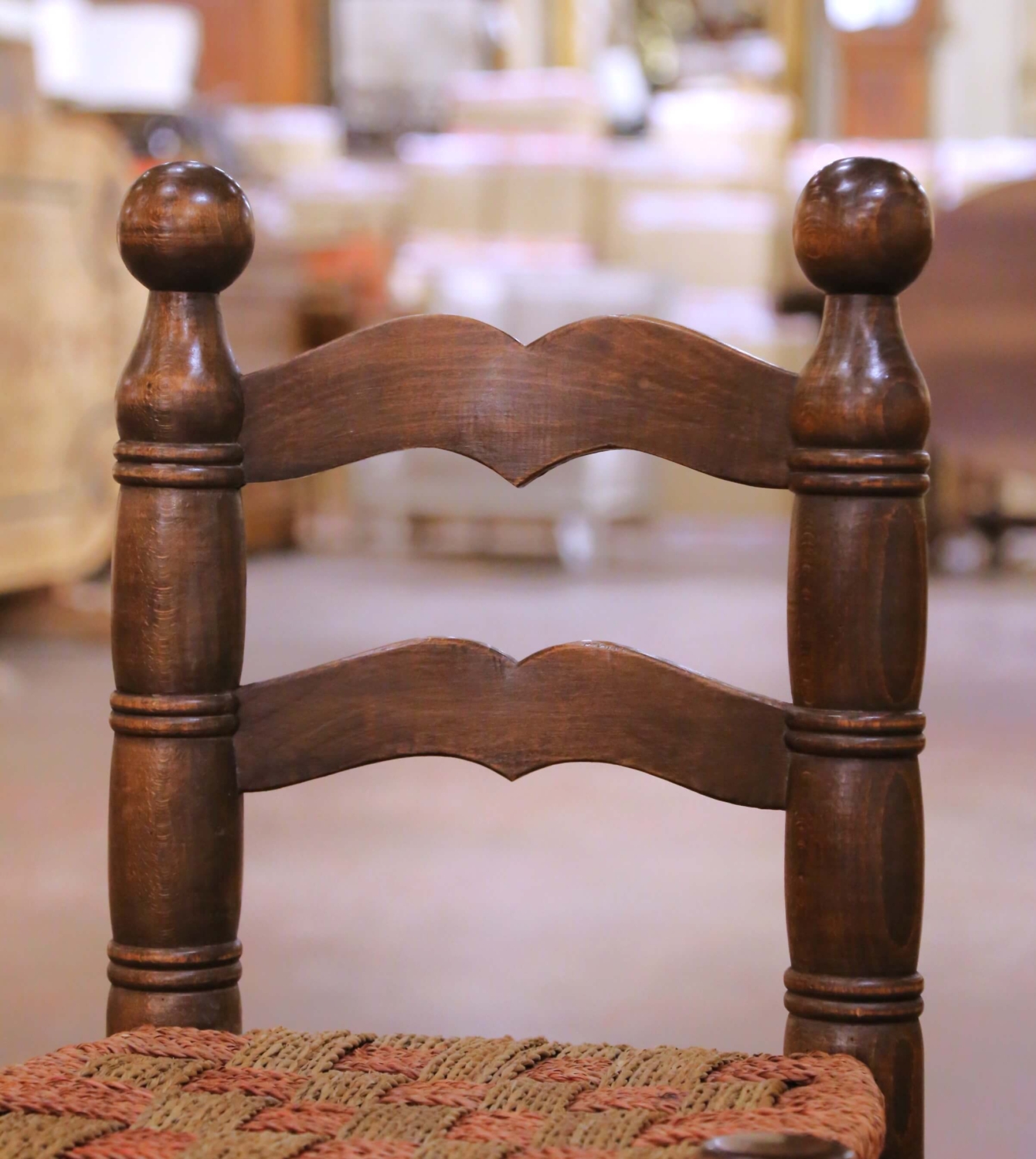 This charming pair of antique low chairs was crafted in France circa 1920 and reflects the honest simplicity of traditional French Provincial seating. Built from solid oak, each chair features finely turned legs and uprights joined by shaped stretchers, providing both structural integrity and visual rhythm. The ladder back design is accented with gently scalloped rails and rounded finials, lending a soft, vernacular elegance typical of rural French furniture of the late 19th century. The seats retain their original handwoven rush, executed in a classic basket-weave pattern with warm natural and softly aged tones that complement the rich walnut patina. Low in profile yet comfortably proportioned, these antique chairs were likely intended for hearthside or occasional use and today make ideal fireside chairs, bedroom seating, or decorative accent pieces in a country house or European inspired interior. The seating is in excellent condition commensurate with age and use, with a warm, timeworn finish throughout. Dimensions: 19″W x 15″D x 35″H Seat height: 17.5″H