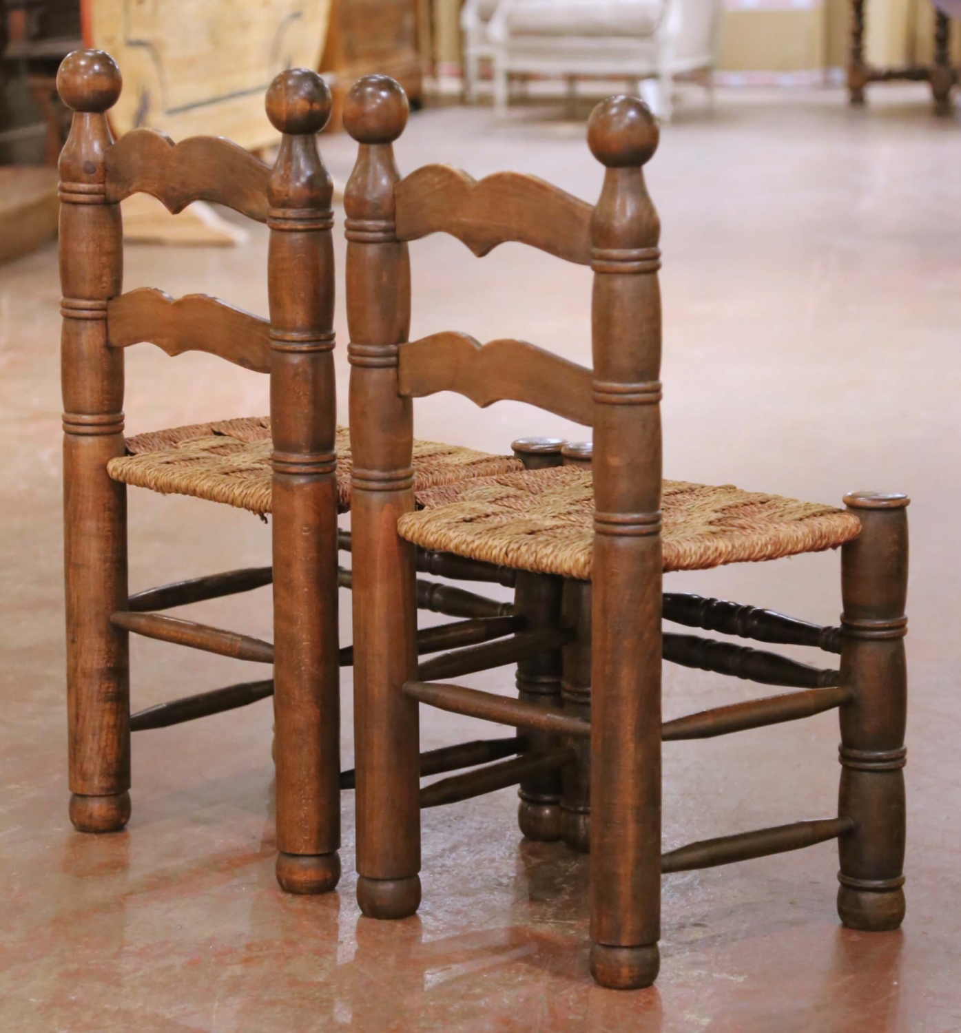 Pair of Early 20th Century French Provincial Low Oak Chairs with Rush Seats