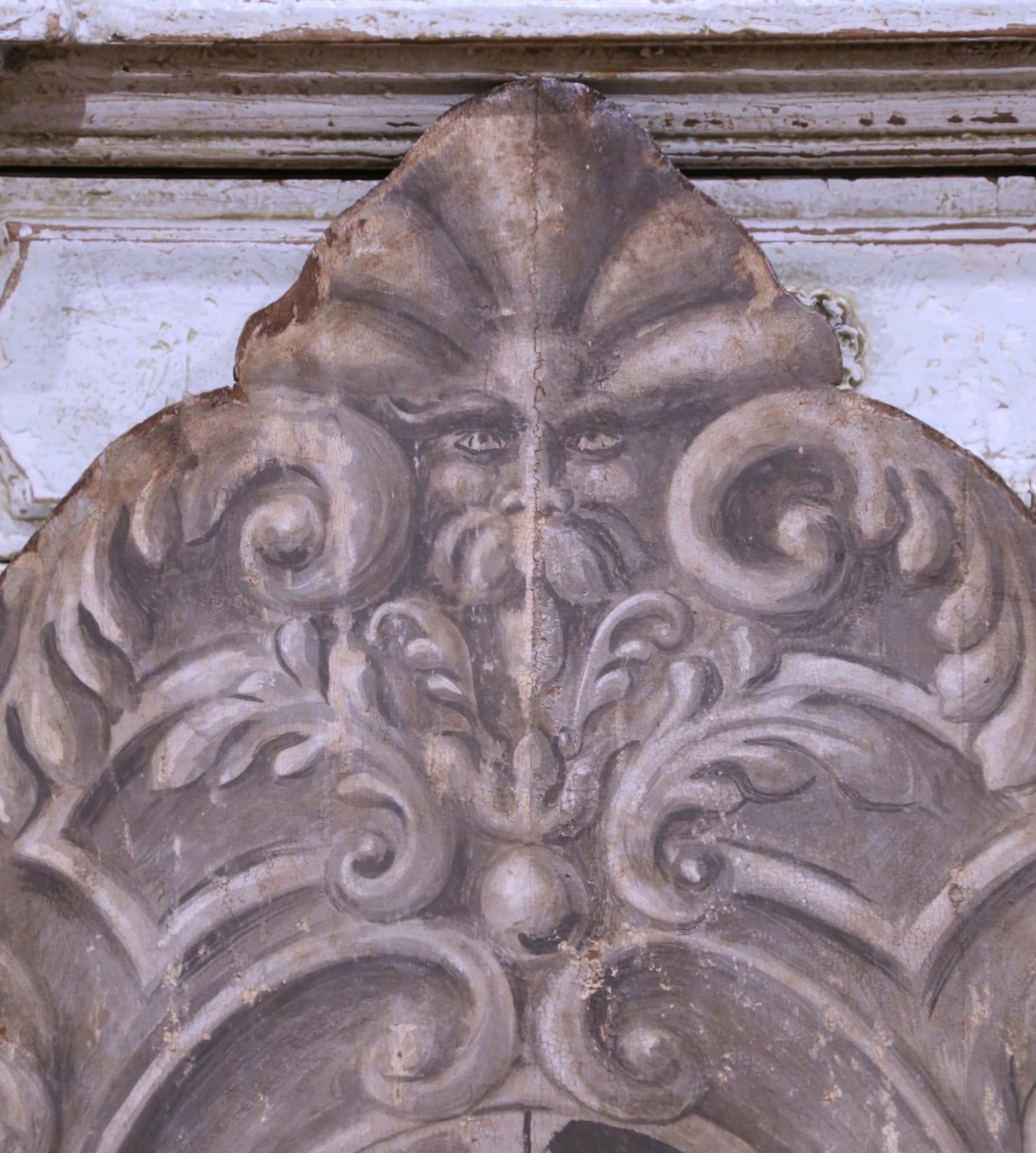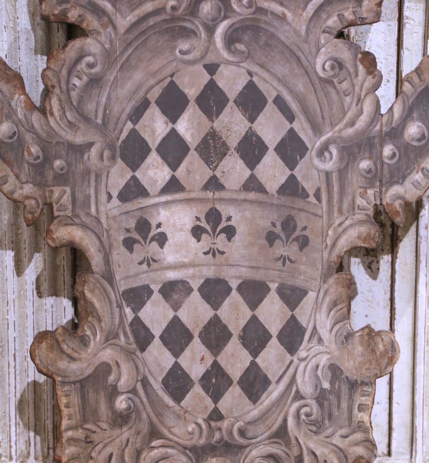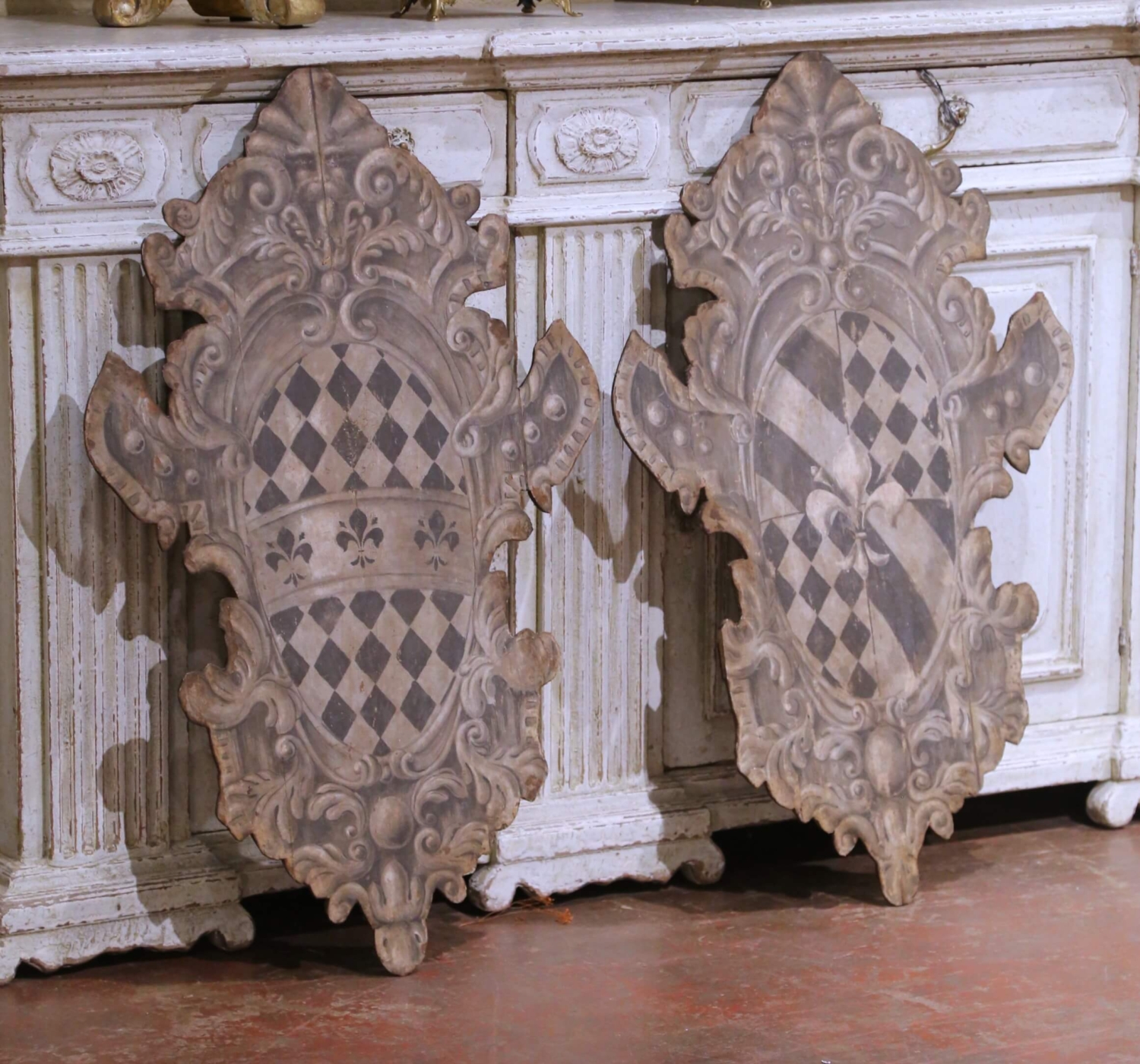 This elegant pair of antique painted wood heraldic shield panels was crafted in Italy circa 1920 and was intended as decorative wall hangings or architectural accents for a palazzo or refined interior. Each shield is framed by an ornate painted surround inspired by classical and late Baroque decorative traditions, giving the panels strong visual presence and architectural character without carved relief. The central escutcheons are hand-painted in a restrained grisaille palette of charcoal, black, and soft gray, featuring traditional heraldic motifs including diamond lozenges, diagonal bands, and fleur-de-lis devices. The monochrome decoration emphasizes graphic clarity and symmetry, allowing the heraldry to read clearly while lending the surfaces a sophisticated, time-softened patina. While heraldic in nature, the imagery is presented as decorative symbolism rather than attributed to a specific documented family, making the panels both historically grounded and decoratively versatile. The surfaces exhibit minor paint wear, small losses, and softened edges consistent with age and long-term use. Overall, the pair is in excellent condition commensurate with age and use. The reverse sides show original wood construction with later horizontal battens added for stability and hanging, typical of period wall panels adapted for display. Decorative yet restrained, this antique pair of Italian painted heraldic shields offers excellent scale and graphic impact, well suited for display in an entryway, library, study, or wine room, either as a balanced pair or as individual wall accents. Dimensions: 25″W x 39″H.