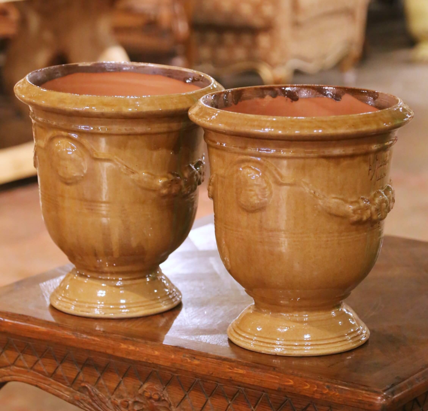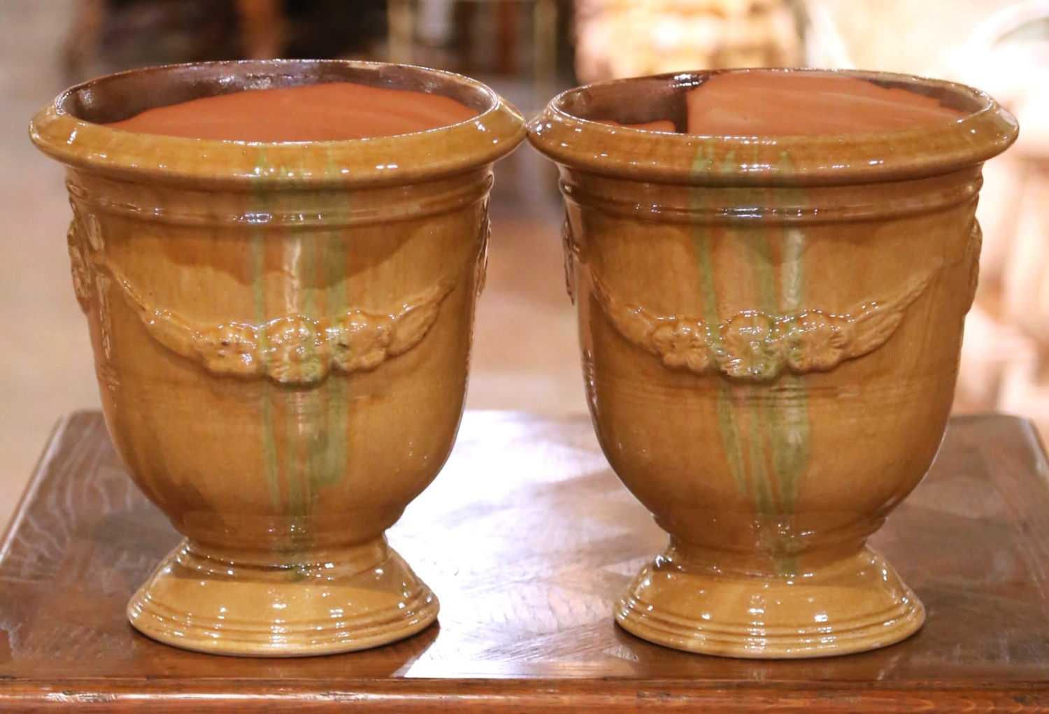 Add timeless Provençal character to your garden or interior with this pair of handmade French Anduze planters signed La Madeleine à Anduze. Crafted in southern France using traditional techniques, each vessel is formed in terracotta and finished in a rich ochre glaze with soft green drip accents that create a beautifully antiqued appearance. The classic Anduze silhouette features a gently flared rim above a rounded body raised on a circular plinth base. Raised garland swags with floral rosettes wrap the midsection in relief, framed by incised bands and anchored by medallions inspired by 18th century French garden design. The interiors are natural terracotta and fitted with drainage holes for authentic garden use. In excellent condition commensurate with age and use, the pair displays natural glaze variation and tonal movement from the firing process, enhancing their artisanal charm. Sculptural and versatile, these signed La Madeleine planters make an elegant statement flanking an entryway, lining a terrace, or anchoring an indoor sunroom. Dimensions: 11.5″W x 11.5″D x 13″H