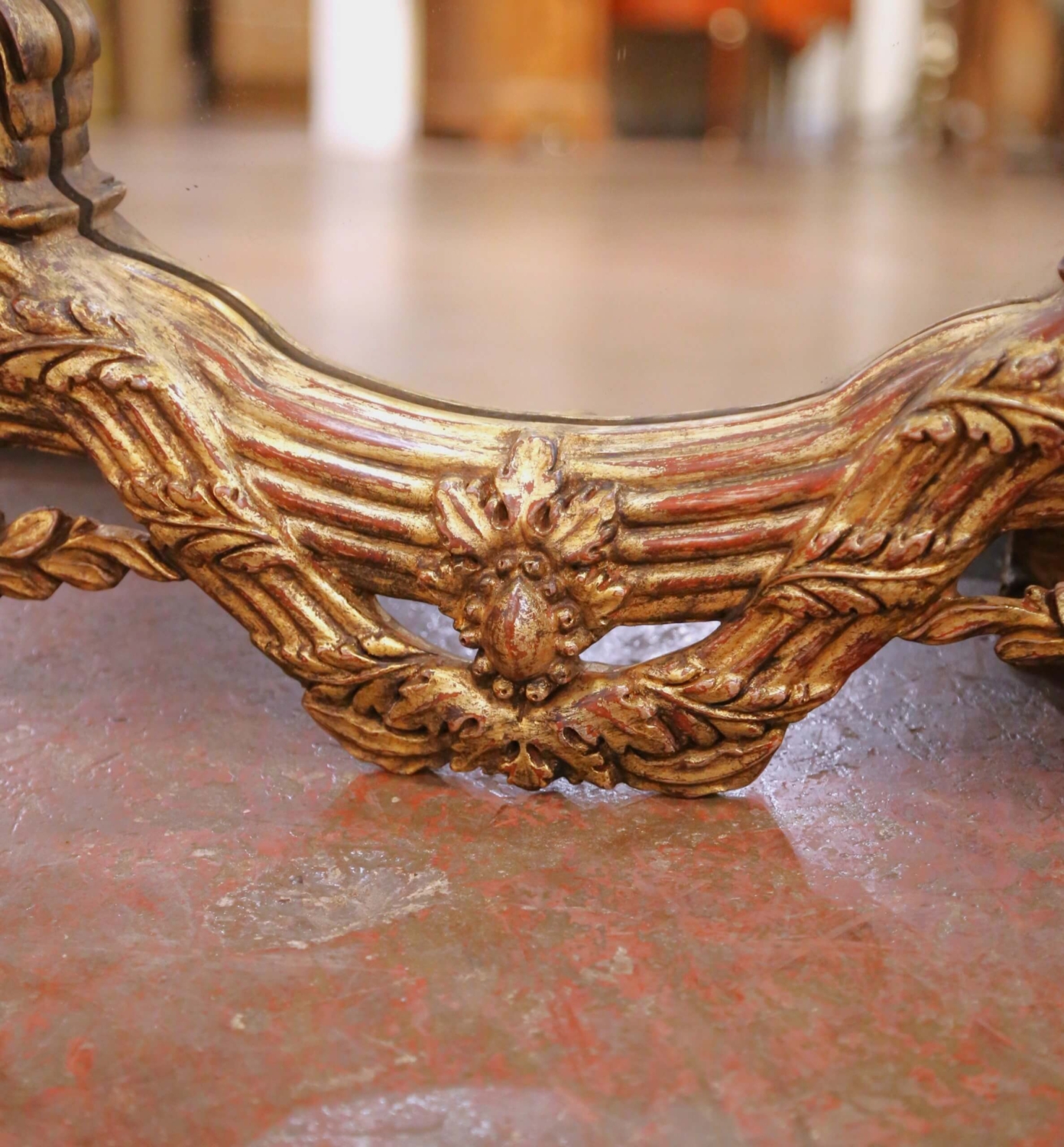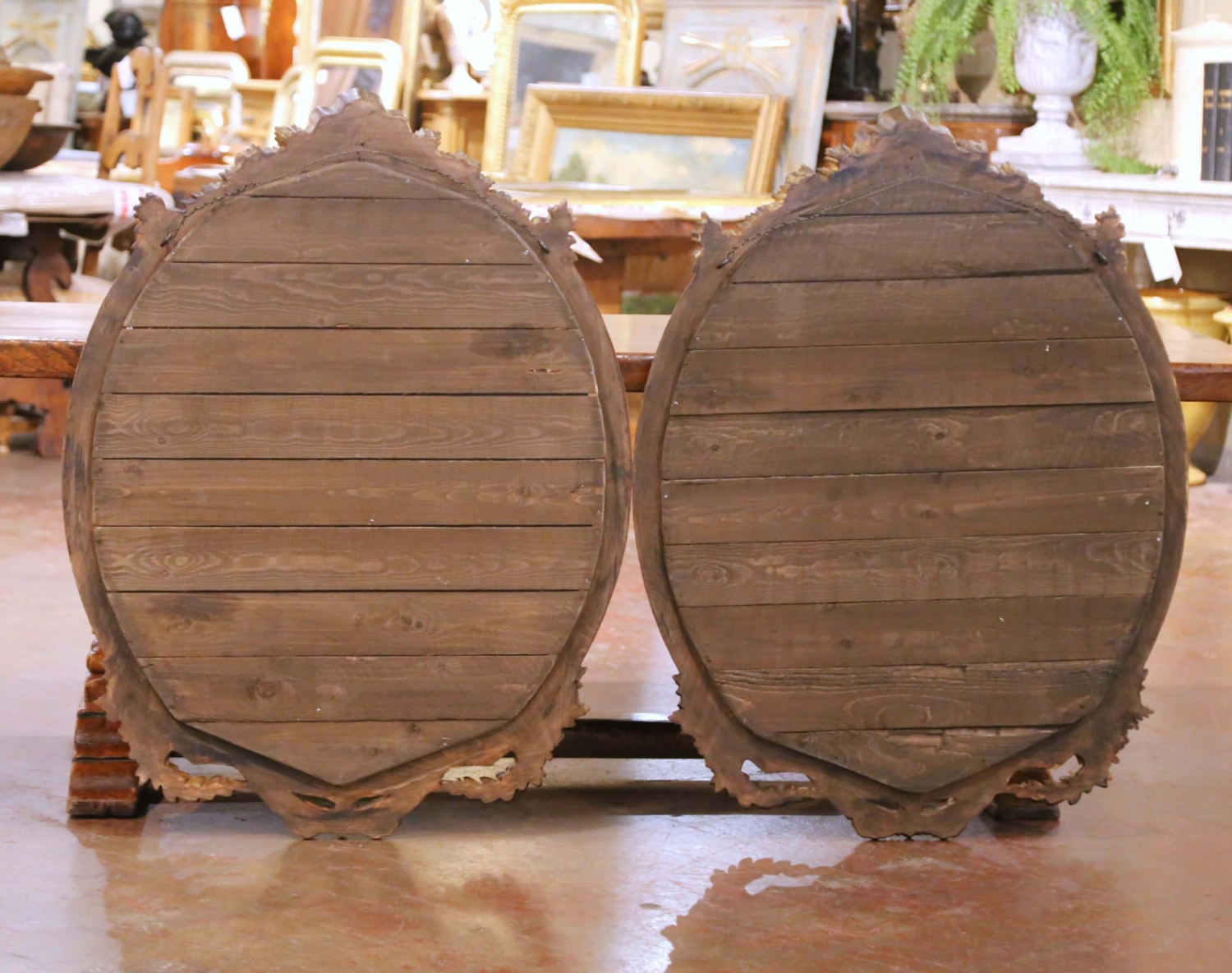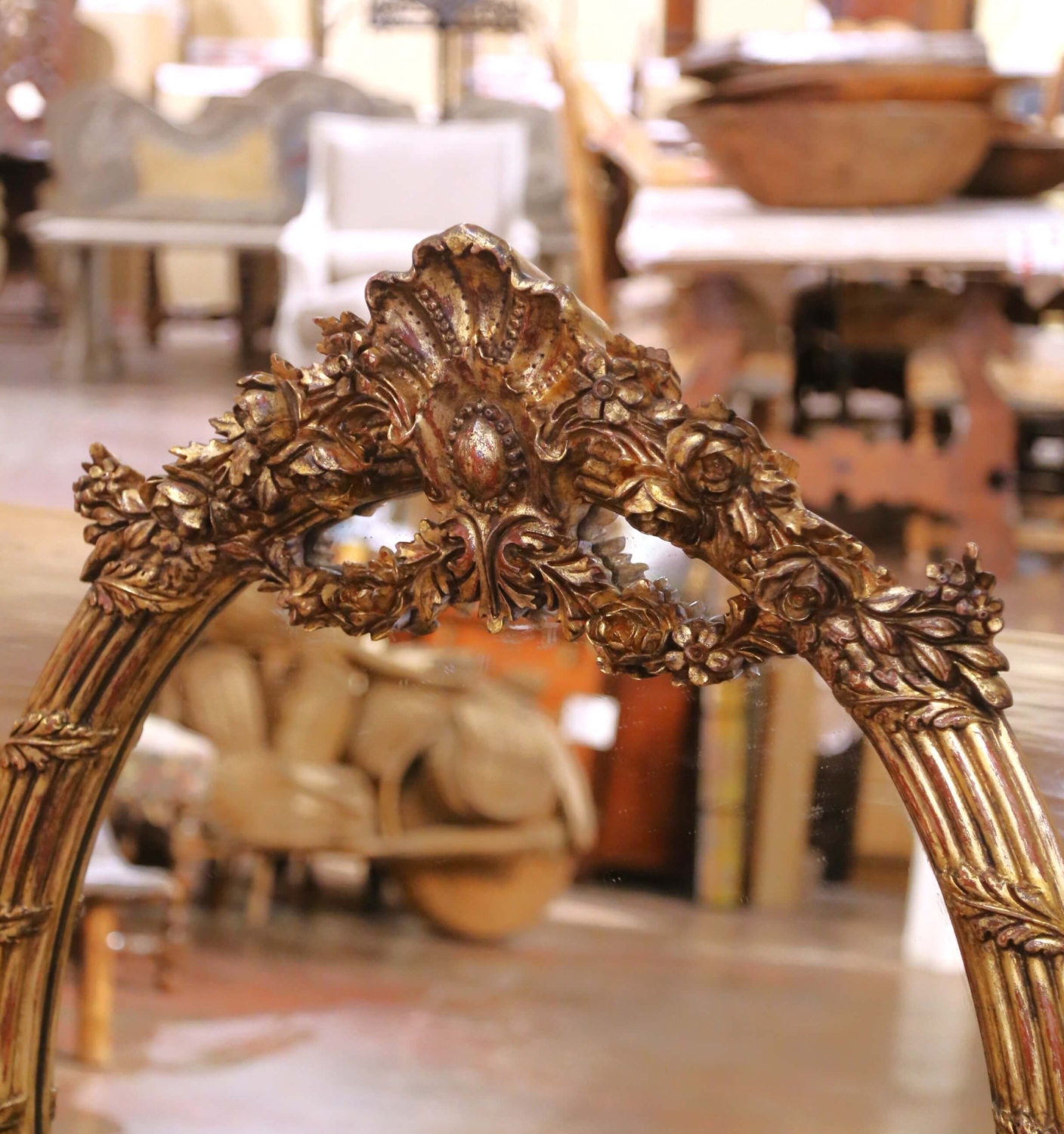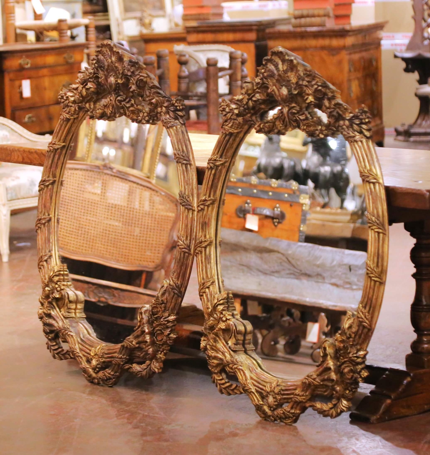 This elegant vintage pair of wall mirrors was carved in France circa 2000 and shaped in the Louis XV style. Oval in form, each frame features a beautifully reeded surround crowned by an ornate pediment with a scalloped shell cartouche flanked by scrolling floral and foliate motifs. Additional carved roses, leaves, and trailing garlands accent the upper and lower sections, culminating in a gracefully shaped base with ribbon and laurel details reminiscent of 18th-century ornament. The mirrors retain their original glass plates, framed by a warm, patinated gilt finish that echoes the look of fine antique French carving. Both large wall decors are in excellent condition commensurate with age and use and would make a dramatic statement on either side of a grand entry door, flanking a mantel with matching consoles or chests, or enhancing a master bathroom above his-and-her sinks. Measures: 45″ H x 35″ W.