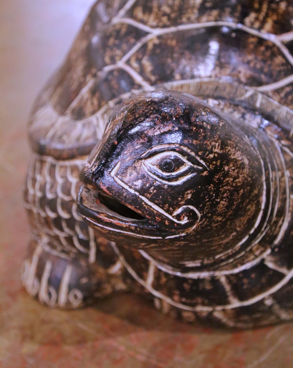 Decorate a patio, garden, or interior space with this whimsical pair of large turtle sculptures. Crafted in France circa 2010, each terracotta “Tortue” features a stylized, hand-carved shell and finely incised scale details along the legs and head. The figures rest solidly on their flat bases, exuding a strong sense of balance and serenity. Their dark brown glaze with hand-rubbed highlights and worn edges reveals a beautiful aged patina, giving the pair an antique, timeworn appeal. Each sculpture displays slight variations that reflect the artisan’s hand, enhancing their sculptural charm. Symbolizing longevity and stability, these turtles would lend natural character to a veranda, sunroom, or garden landscape. Both are in excellent condition commensurate with age and use, and feature a richly textured, rustic finish. Each measures: 18” W x 26.5” D x 12” H. Weight: 41 lbs.