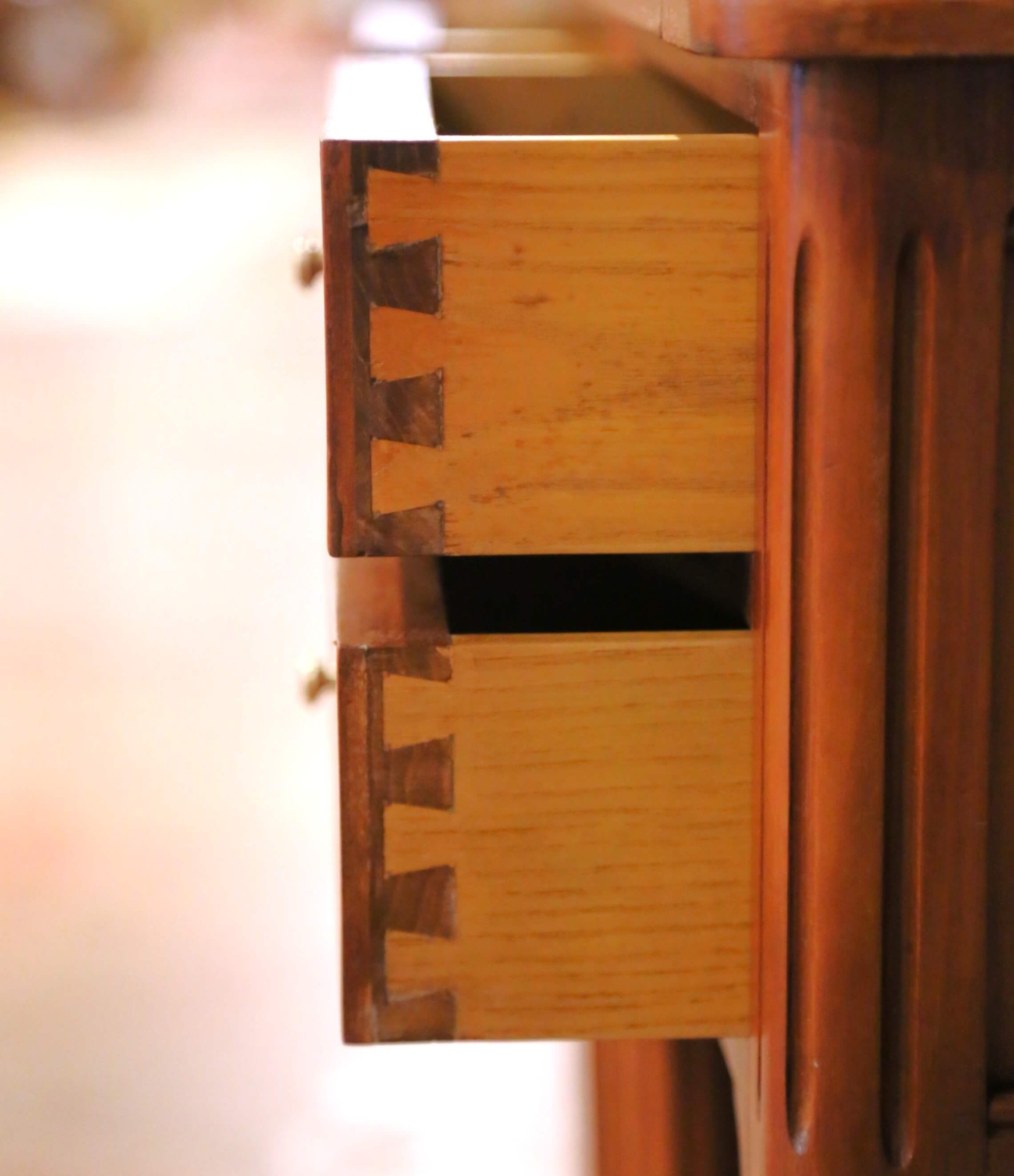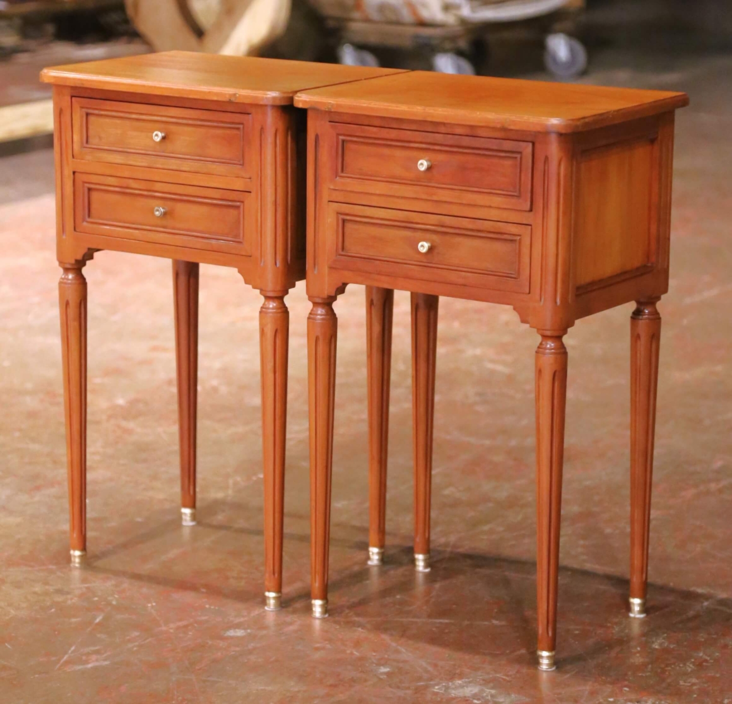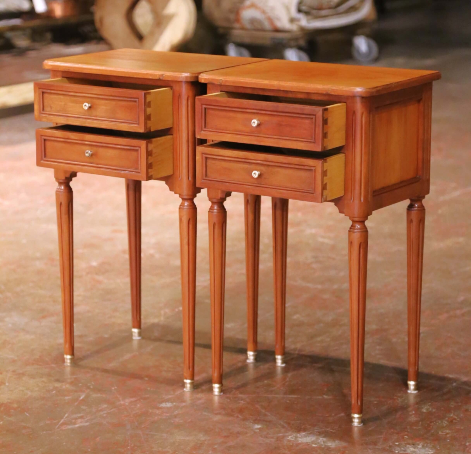 This elegant pair of Louis XVI style bedside tables was crafted in the late 20th century, circa 1980, and showcases refined neoclassical French design interpreted with excellent modern craftsmanship. Each table is constructed of solid walnut and features a clean rectangular case with subtly molded edges, fluted corner details, and slender tapered legs terminating in brass sabots, all hallmarks of the Louis XVI aesthetic. Both nightstands are fitted with two smoothly operating drawers, each accented with simple brass knobs. The drawers are finely constructed with visible dovetail joinery, and the interiors are finished in natural wood, reflecting quality workmanship throughout. The warm and rich walnut patina enhances the crisp lines and elegant proportions, allowing the pair to integrate seamlessly into both traditional and transitional interiors. In excellent condition commensurate with age and use, these bedside tables are sturdy, clean, and ready for everyday function. They are ideal flanking a bed, used as end tables in a living room, or placed in a guest suite where classic French style and practical storage are desired. Dimensions: 15.25″ W x 12″ D x 26″ H