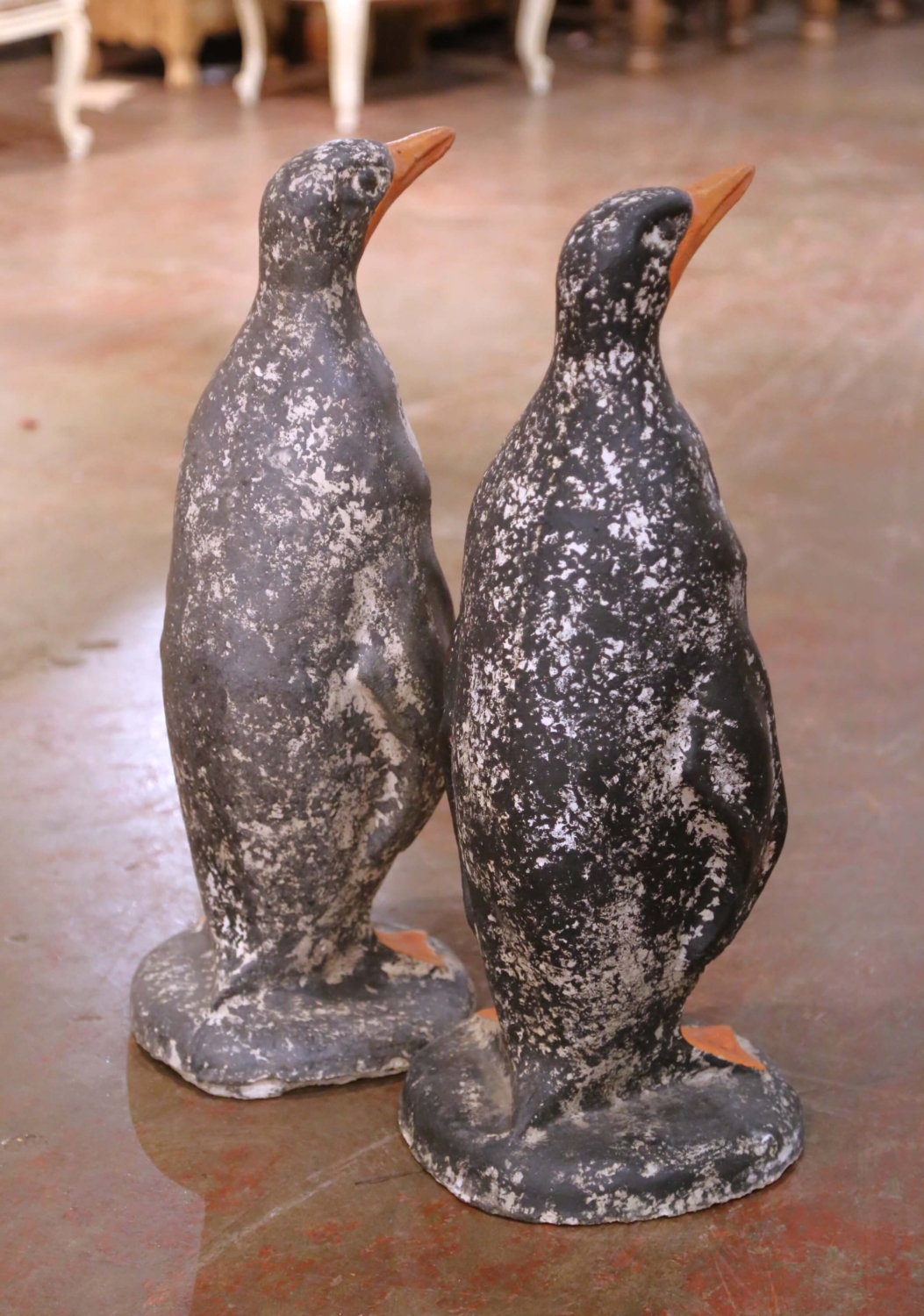 Add character and charm to a front entry, garden, or terrace with this delightful pair of antique French “Pingouins” (penguins). Crafted in France from heavy cast stone, each sculptural bird stands upright on a circular base and is hand painted in a classic black, white, and warm orange palette. Their softly modeled forms and gentle expressions give the pair an endearing presence that reads as both playful and refined. Both penguins retain a beautifully weathered, patinated painted finish with authentic signs of outdoor use, enhancing their antique appeal. Substantial in weight at approximately 58 pounds each, they are ideal for flanking a front door, garden path, or patio setting where they provide stability as well as visual impact. Whimsical yet timeless, this charming antique pair brings personality and European garden style to any exterior space. Measures: 10” W x 10.5” D x 26.5” H.