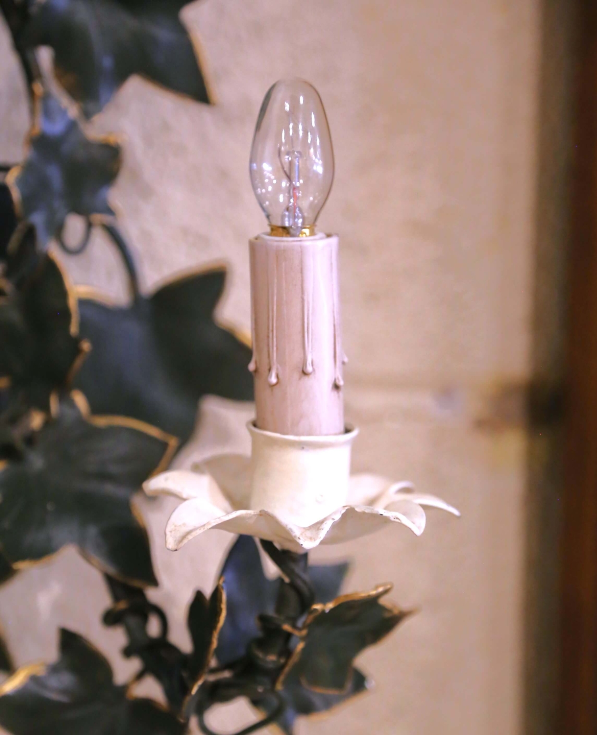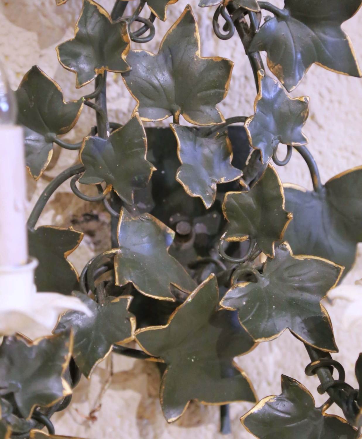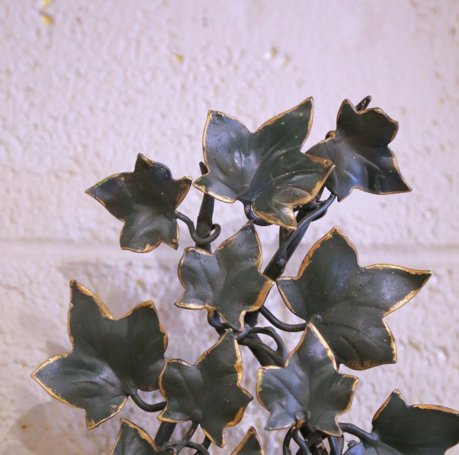Crafted in France circa 1960, this decorative pair of mid-century tôle wall sconces features an exuberant arrangement of hand-cut and hand-painted ivy leaves, each finished in deep green with delicately gilt-edged tips. The sculptural foliage wraps gracefully around the frame, creating a naturalistic backdrop for the two candle-form lights on each sconce. Each light is set in a flower-shaped bobeche and fitted with newly wired, cream-colored candle sleeves, bringing authentic vintage charm with modern functionality. Measuring 10.5 inches wide, 7 inches deep, and 15 inches high, the pair offers a beautifully balanced silhouette ideal for flanking a mirror, doorway, or bed. Newly rewired to U.S. standards and in excellent condition commensurate with age and use, these ivy-form sconces add warmth, texture, and classic French character to any interior.