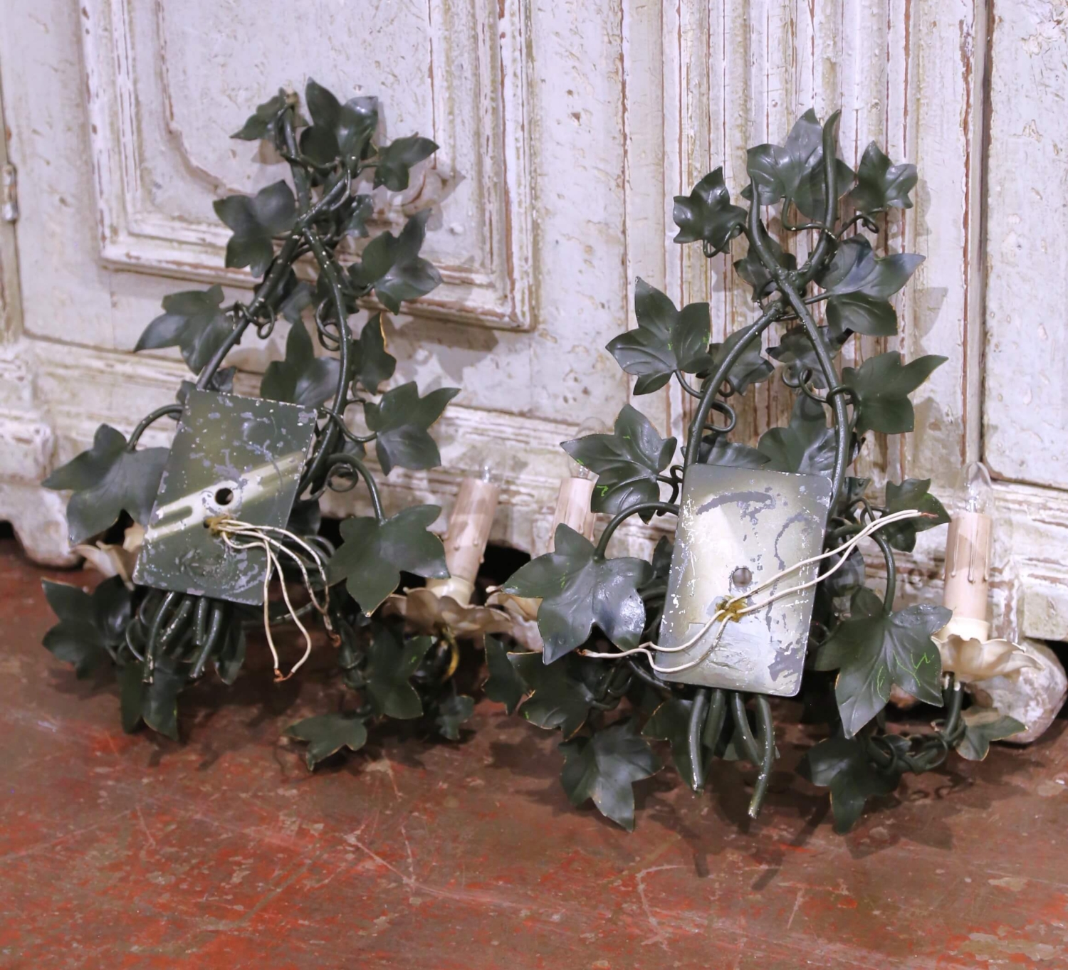 Pair of Mid-Century French Tôle Ivy Form Two-Light Wall Sconces
