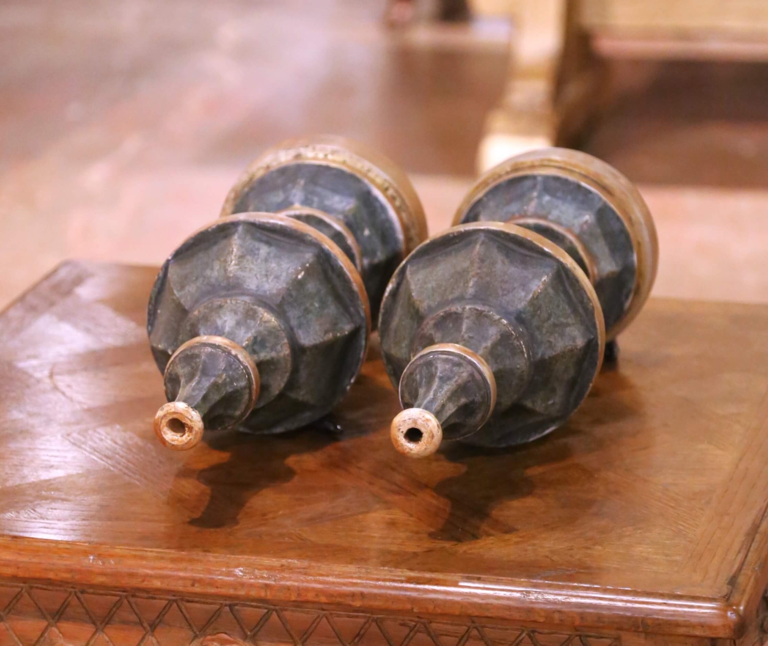 This striking pair of antique Italian architectural finials was crafted in wood circa 1950 and likely originated from an ecclesiastical interior, such as an altar rail, processional standard, or decorative balustrade element. Sculpted in a classical baluster form, each piece rises from a stepped circular base into a faceted urn-shaped body, culminating in a tapered neck designed to receive a pricket, rod, or ornamental mount. The surfaces are finished in a beautifully aged faux-bronze patina with hand-applied paint in deep verdigris tones, complemented by distressed silvered accents that highlight the molded bands and contours. This layered finish, combining verdigris and silver tones, mimics oxidized metal and gives the pieces a rich, timeworn character while retaining the warmth of carved wood. The proportions are bold and sculptural, giving the pair strong visual presence whether used symmetrically on a console, flanking a fireplace, or incorporated into a layered vignette. Their architectural origin lends them an authenticity and gravitas that elevate them beyond simple decorative objects. The pieces remain in excellent condition commensurate with age and use, with expected wear to the painted and silvered surfaces that enhances their antique character. A highly decorative and versatile pair of antique Italian finials, ideal for adding height, structure, and old-world charm to both traditional and transitional interiors. Could easily be converted into table lamps. Dimensions: 7″Diameter x 20″H