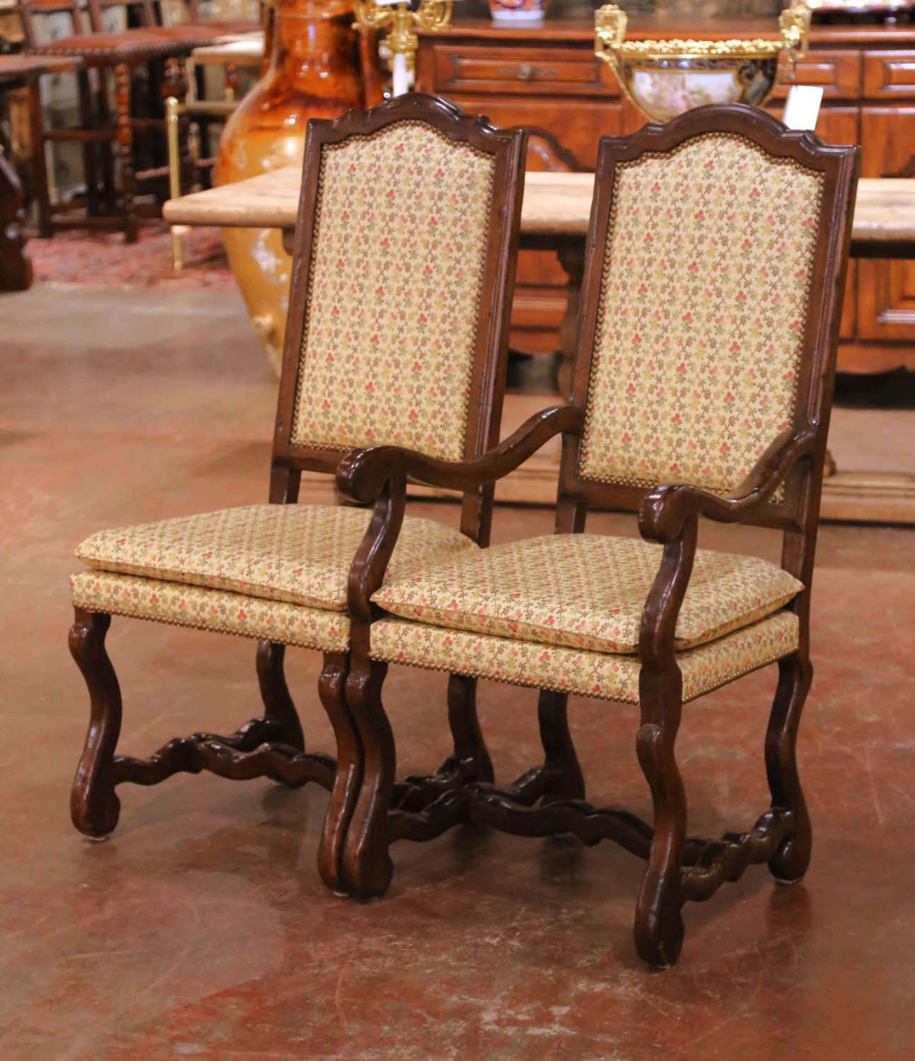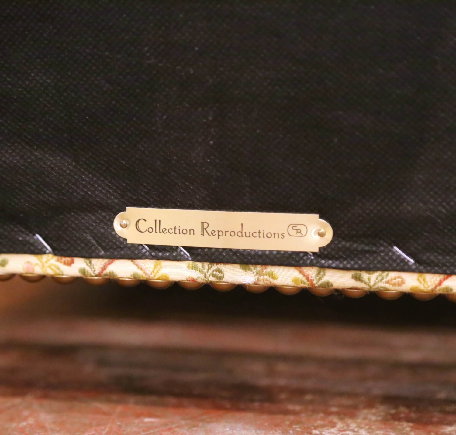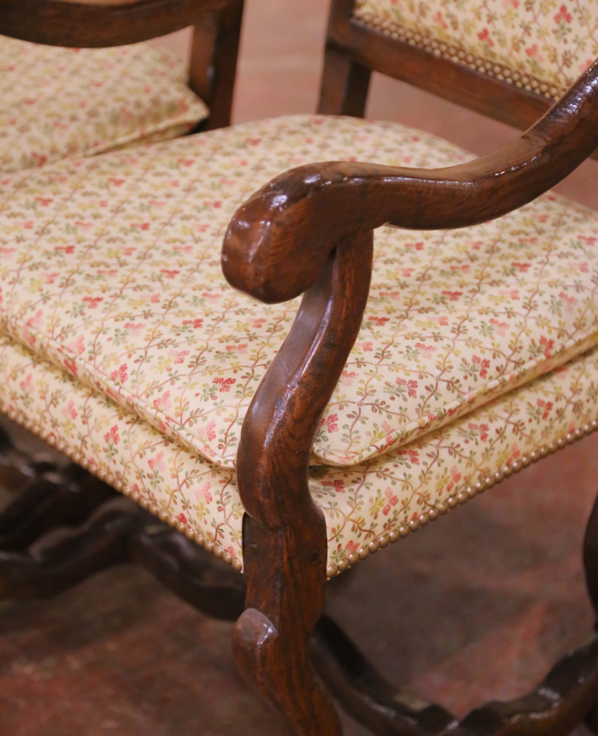 This elegant suite of ten Louis XIII style dining chairs, crafted circa 1980, includes eight side chairs and two armchairs. Executed in oak, the ensemble reflects the bold, sculptural character of 17th century French design while offering the comfort and durability of more recent craftsmanship. Each chair features a tall, shaped back and a wide and deep seat. The scrolled arms on the two host chairs are generously proportioned with rounded handgrips, adding presence at the head of the table. The chairs stand on robust, curving legs joined by traditional H-form stretchers with a shaped front stretcher, reinforcing both structure and period-inspired detailing. The seats and backs are upholstered in a finely patterned floral fabric in soft tones of cream, rose, and muted green, complementing the warm oak finish. The cushions are thick and comfortable, resting neatly within the upholstered frames and edged with coordinating nailhead trim. A maker’s plaque reading “Collection Reproductions” is affixed beneath the seat, confirming late 20th century production. The set is in excellent condition commensurate with age and use. Frames are sturdy, upholstery remains clean and well preserved, and the finish displays a rich, warm tone throughout. A refined and cohesive Louis XIII style dining suite, ideal for a substantial farmhouse table, traditional dining room, or country estate setting. Armchair: 23″W x 24″D x 45.5″H Sidechair: 22W x 22″D x 45″H Seat Height: 19.5″