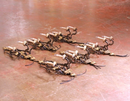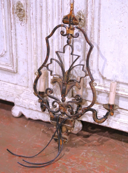 Illuminate your space with this elegant set of six antique wall sconces from France, circa 1920. Each large forged iron fixture features a sinuous, scrolled frame centered with a stylized acanthus leaf motif, richly decorated with gilt accents and finished with a hand-painted patina in tones of black and reddish-brown. The three gracefully curved arms extend outward, each ending in a scalloped bobeche with decorative candle covers and faux wax-drip detailing. The lower section showcases carved and gilded foliate and lattice motifs, completing the refined composition. The fixtures are newly wired to U.S. standards and ready for installation. These early 20th-century sconces are in excellent condition commensurate with age and use, displaying a warm and aged finish that enhances their Old-World charm. Perfect for framing a mirror, flanking a doorway, or adding grandeur to a dining room or entryway. Each sconce measures: 14″ W x 7.5″ D x 22″ H.