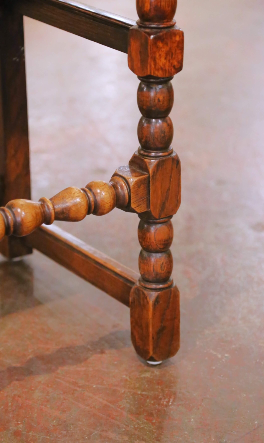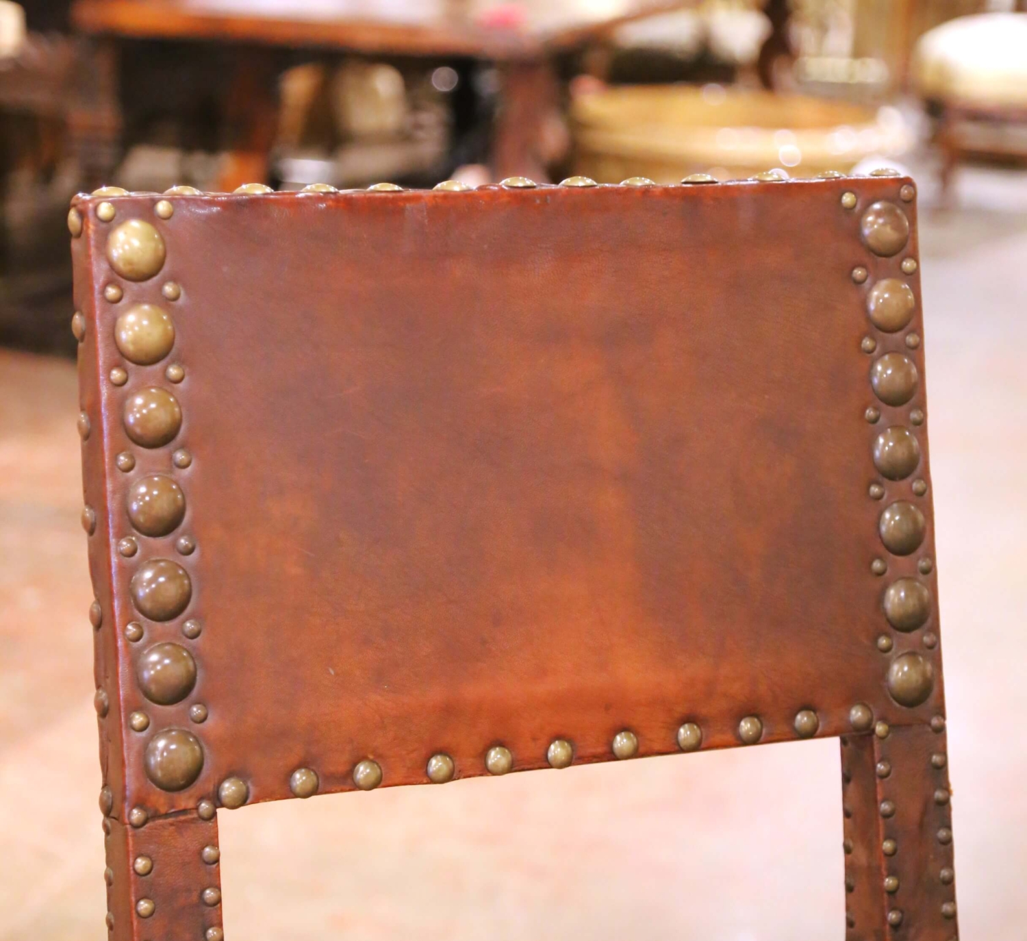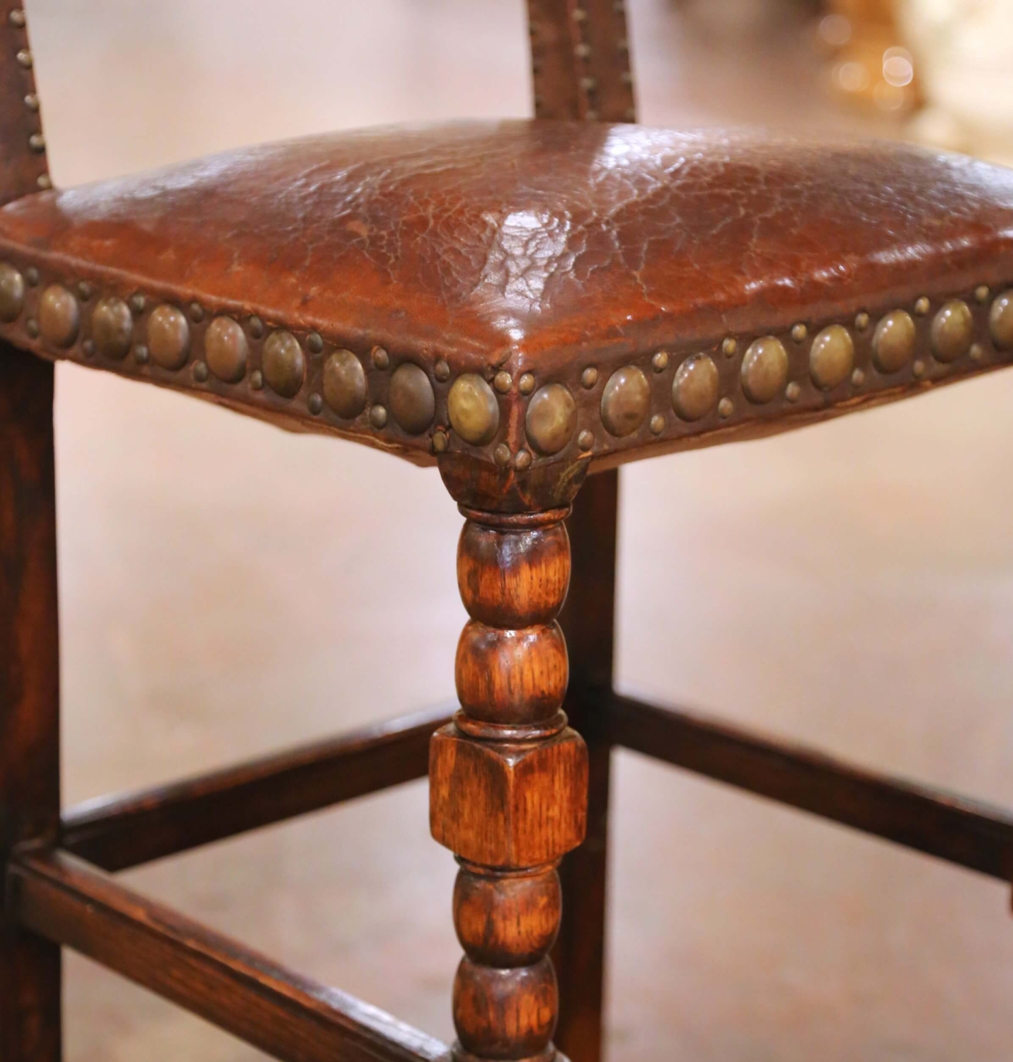 This striking set of three antique French bar stools was crafted in solid oak circa 1890 and reflects the bold architectural character of the Gothic Revival style. Each stool features a tall, rectilinear form with turned legs, side stretchers, and a front footrest, offering excellent stability and comfort. The seats and high backs retain their original brown leather upholstery, richly patinated with natural wear consistent with age and use. Decorative brass nailheads outline the seats, backs, and uprights, adding texture and reinforcing the strong Gothic aesthetic. Well proportioned and generously scaled, these stools are ideally suited for a 42″ to 45″ bar height and are perfect for a wine room, library bar, or French country interior. The set is in good condition commensurate with age and use. Some cracking on the seats. See detailed photos Dimensions (each): 19″W x 19″D x 45.5″H Seat height: 30″