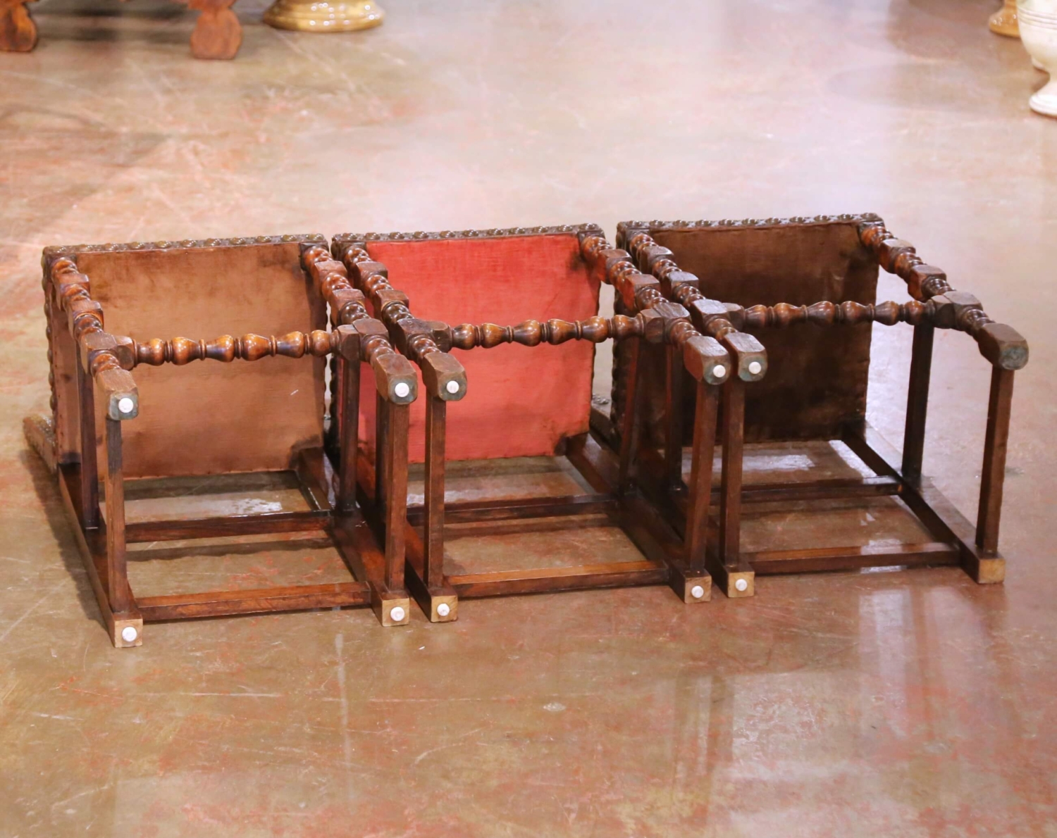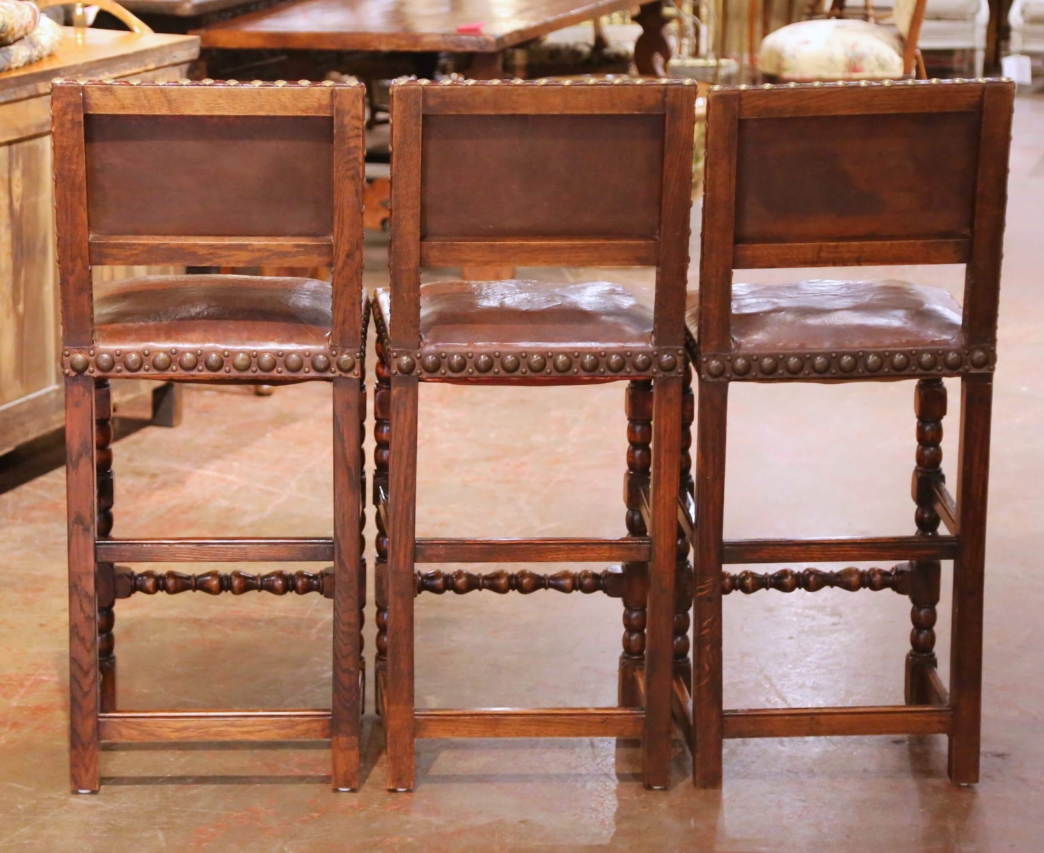 Set of Three 19th Century French Gothic Carved Oak and Leather Bar Stools