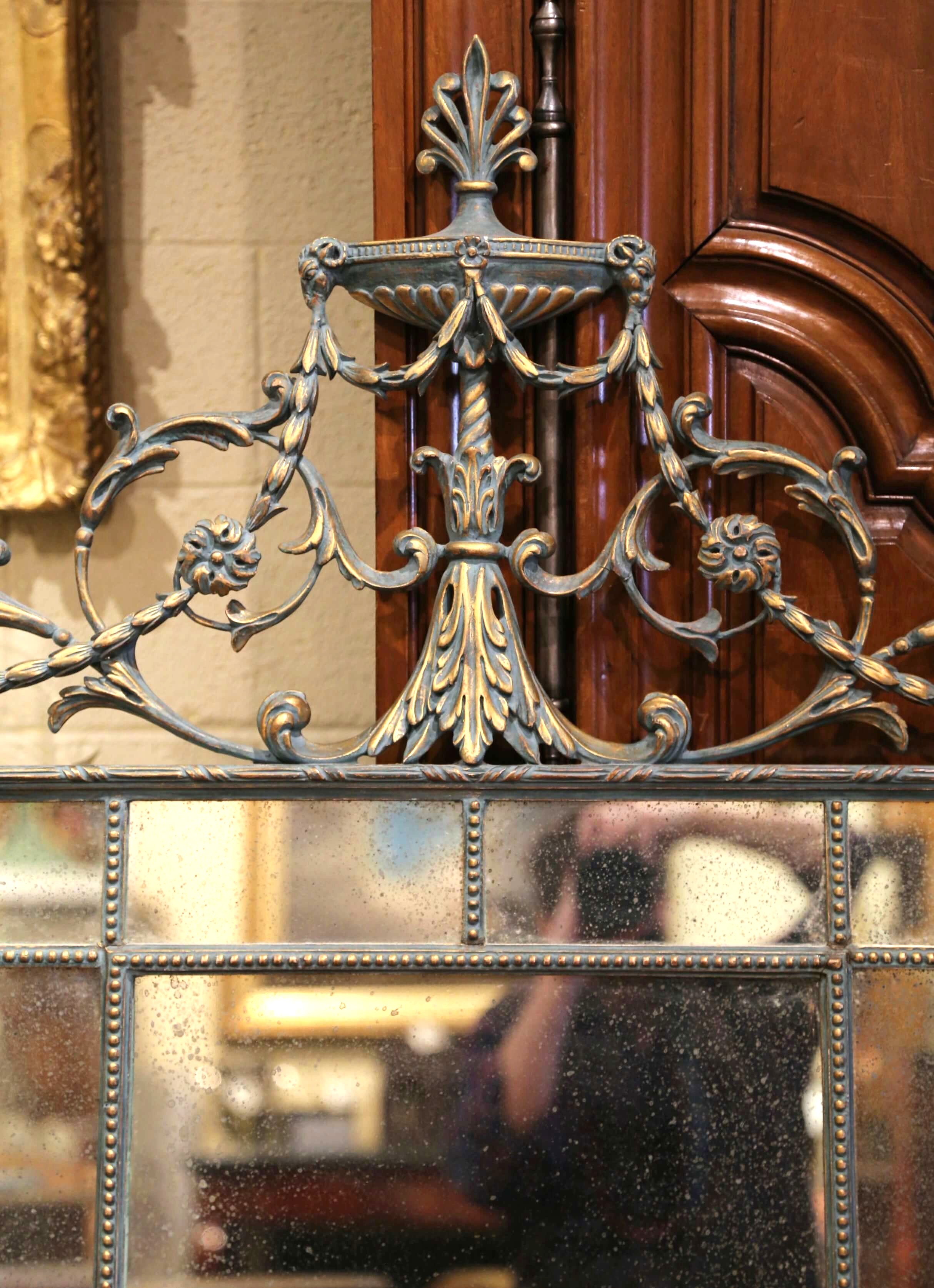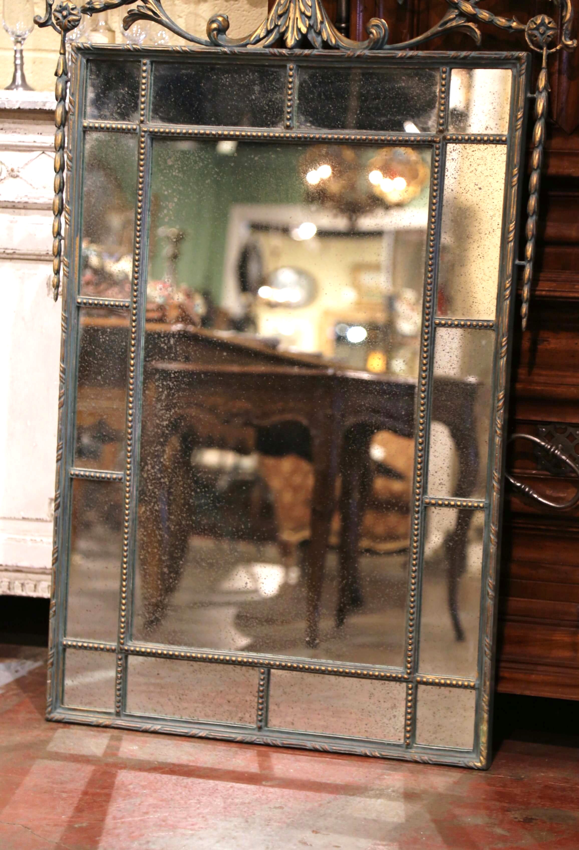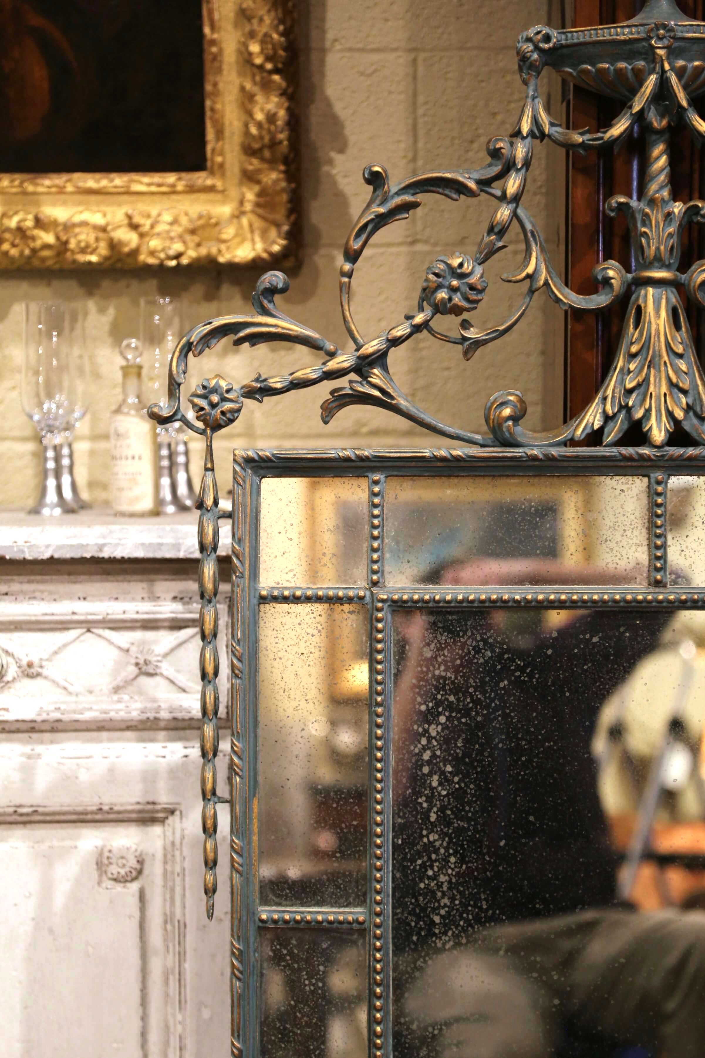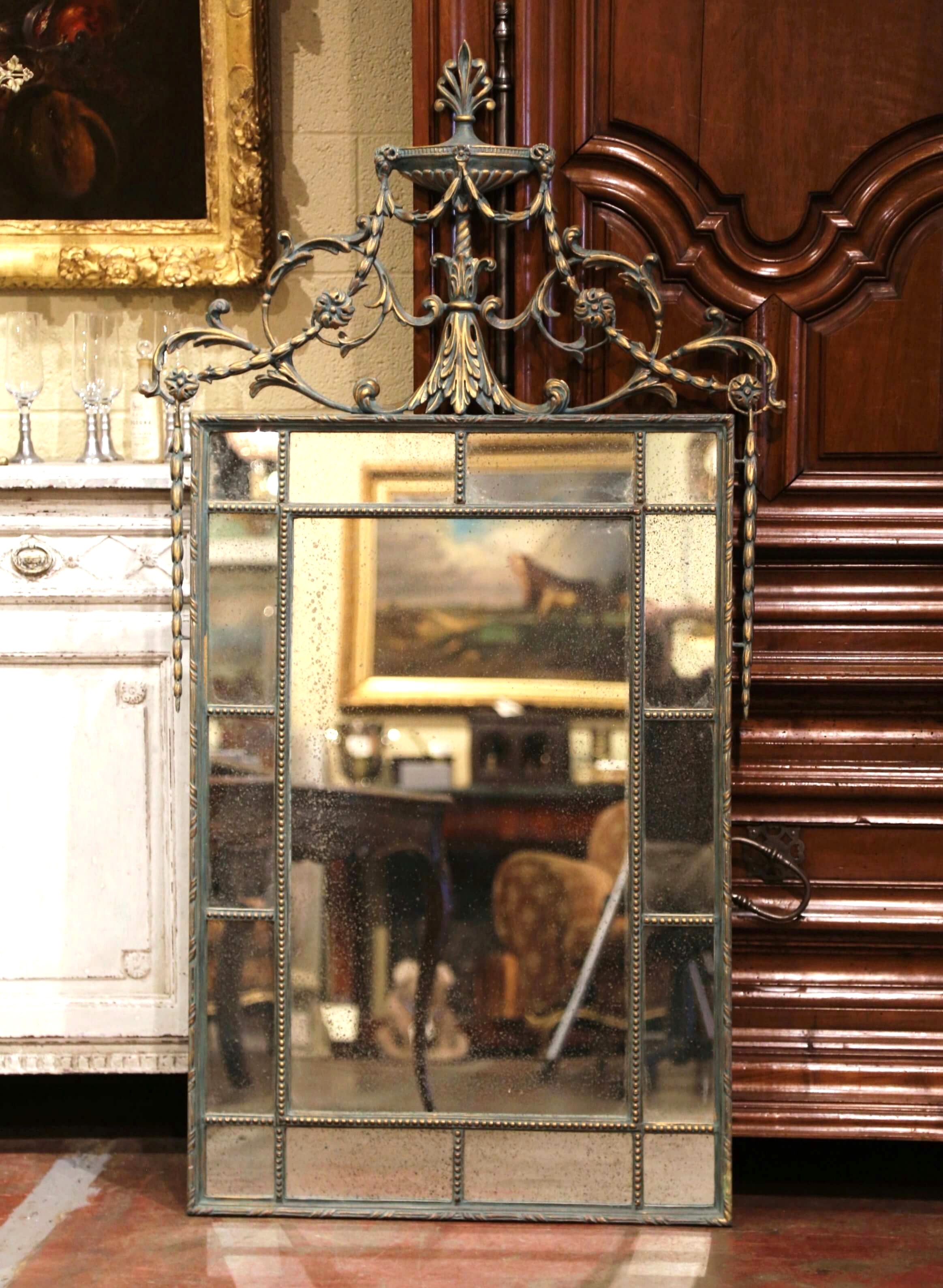 The frame is accented with a geometric beaded surround, enclosing antiqued smoked mirror plates that offer a soft, atmospheric reflection. The surface is finished in a beautifully aged verdigris tone with subtle gilt highlights, creating depth and contrast across the decorative elements.