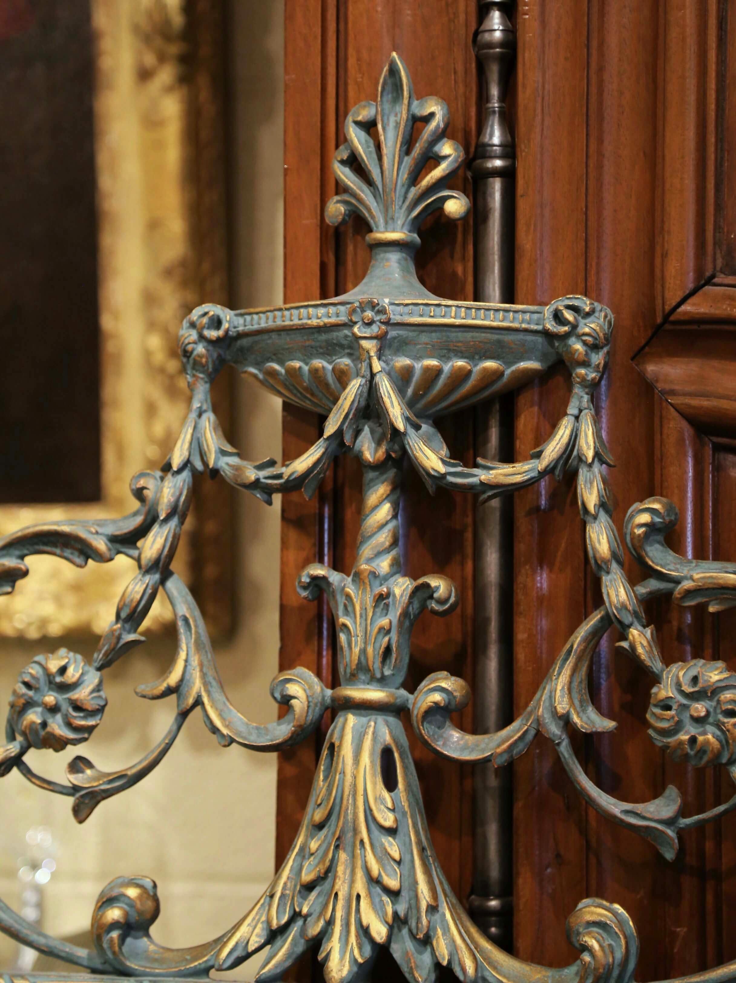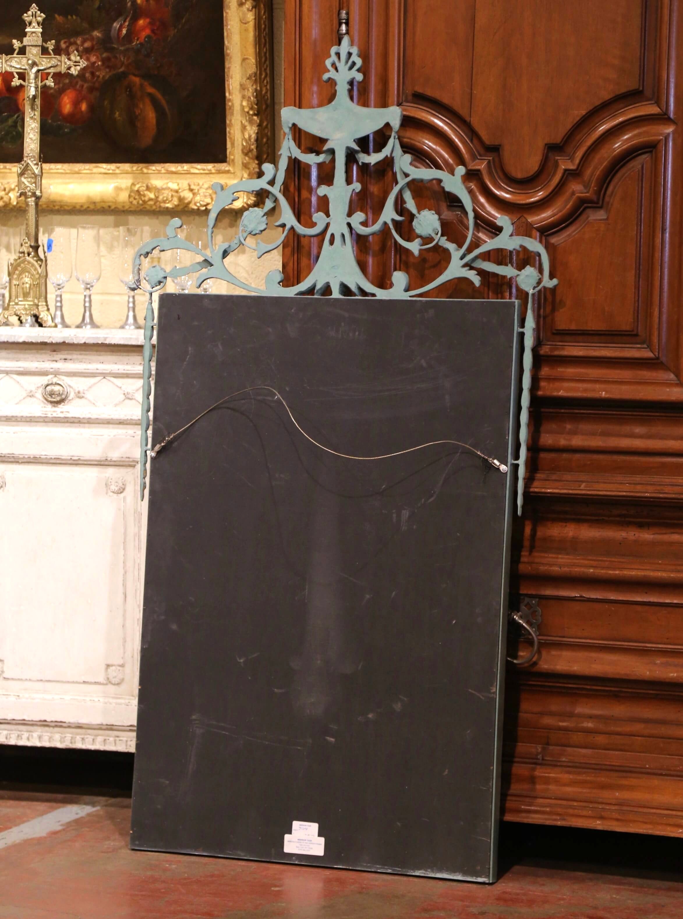 Decorate a powder room, entry, or bedroom with this elegant neoclassical style wall mirror. Crafted in New York by Mirror Fair and designed by Stephen Cavallo, the tall rectangular piece is crowned with an ornate basket-form pediment richly carved with acanthus leaves, floral motifs, and a stylized finial. The composition is further enhanced with delicate ironwork-style swags and tassels draped along the sides, adding movement and classical sophistication.